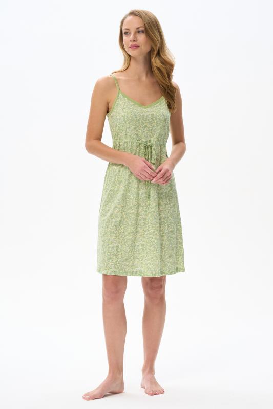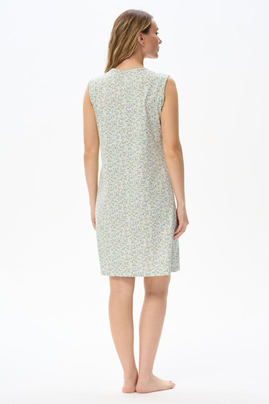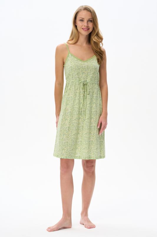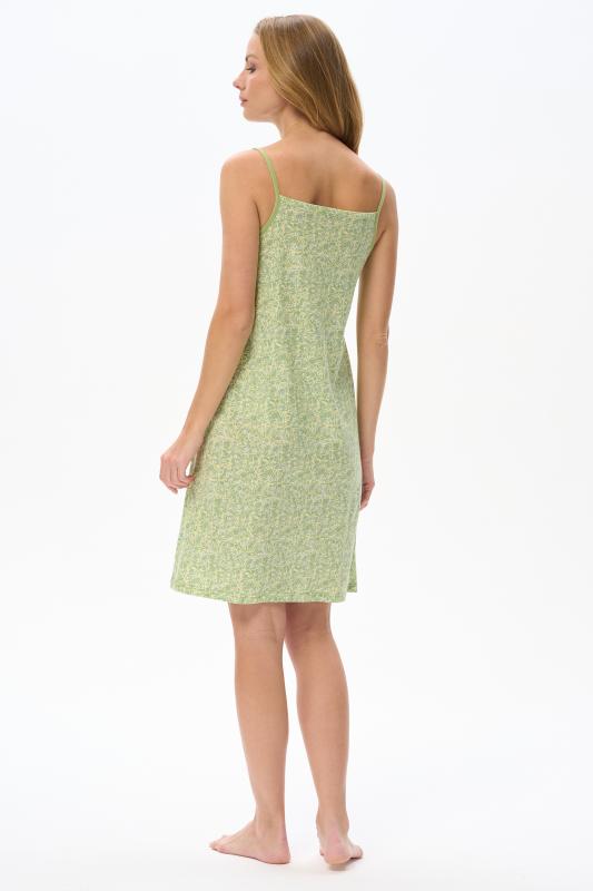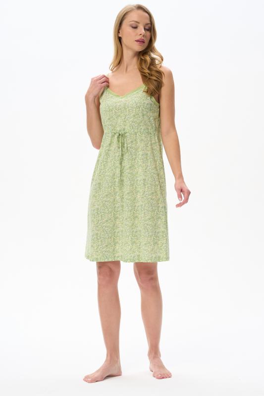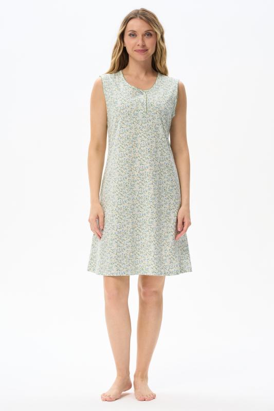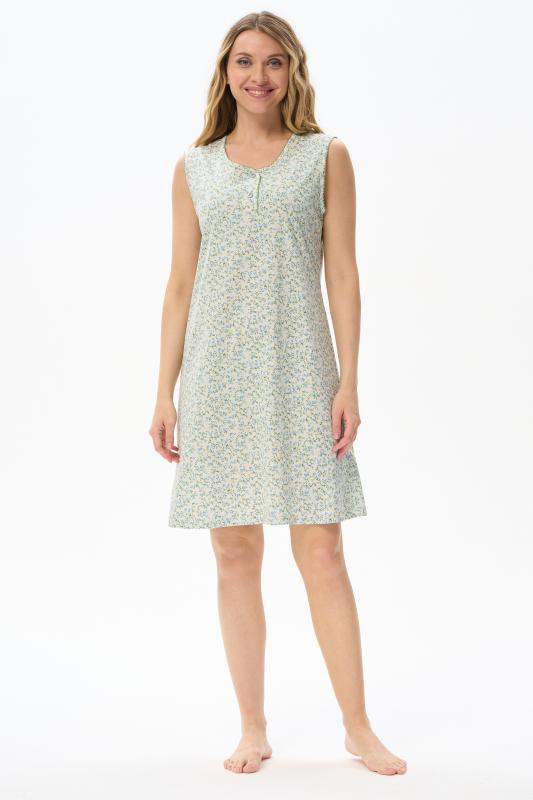 Сорочка с принтом прямого силуэта из хлопкового трикотажного полотна. Округлый вырез горловины, цельнокроеные короткие рукава. Длина изделия ниже колена. Рост модели на фото 170.