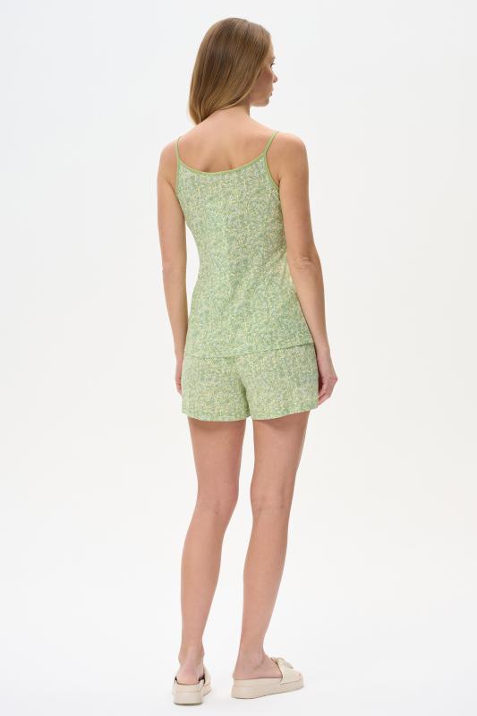 Пижама выполнена из хлопкового меланжевого полотна. Майка с круглым вырезом горловины. Спереди подрез и средний шов декорирован мережкой. Шорты без карманов, пояс с эластичной лентой внутри. Рельефные швы шорт декорированы мережкой. Рост модели на фото 175см.