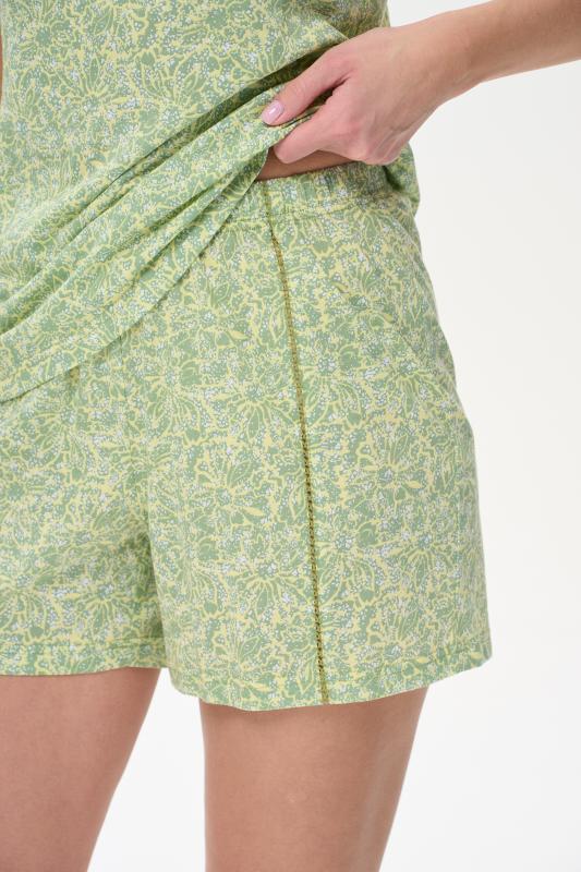 Пижама выполнена из хлопкового полотна. Майка с круглым вырезом горловины. Спереди подрез и средний шов декорирован мережкой. Шорты без карманов, пояс с эластичной лентой внутри. Рельефные швы шорт декорированы мережкой. Рост модели на фото 178см.