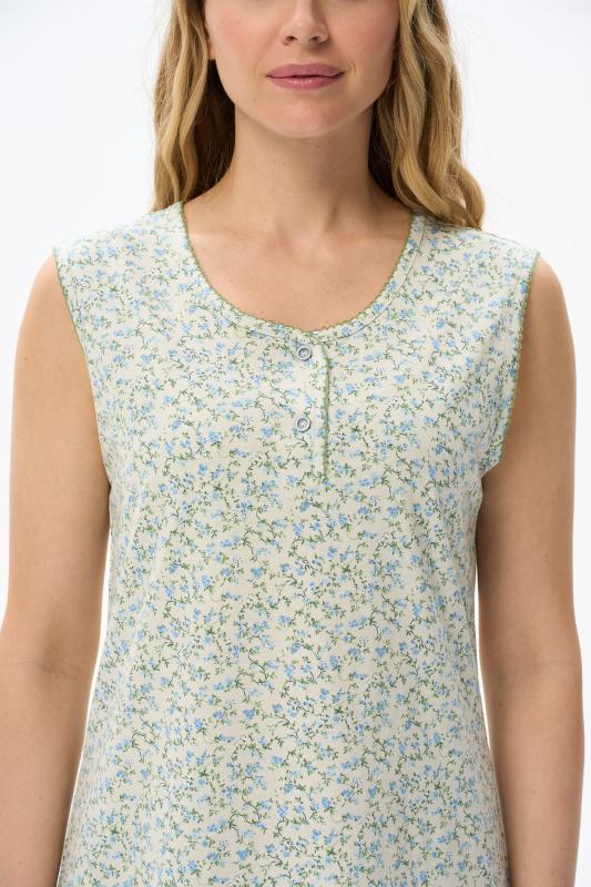Ночная сорочка А-силуэта из хлопкового полотна. Круглый вырез горловины с застежкой на пуговицы. Вырез горловины и проймы декорированы фестонами контрастного цвета. Длина изделия чуть ниже колена. Рост модели на фото 175см.