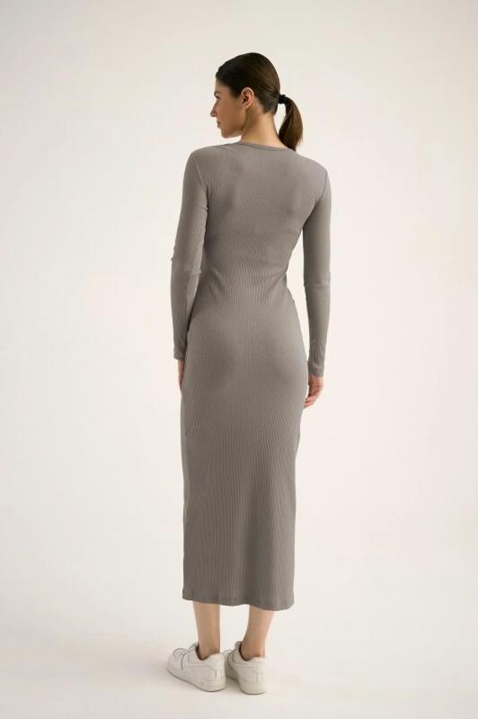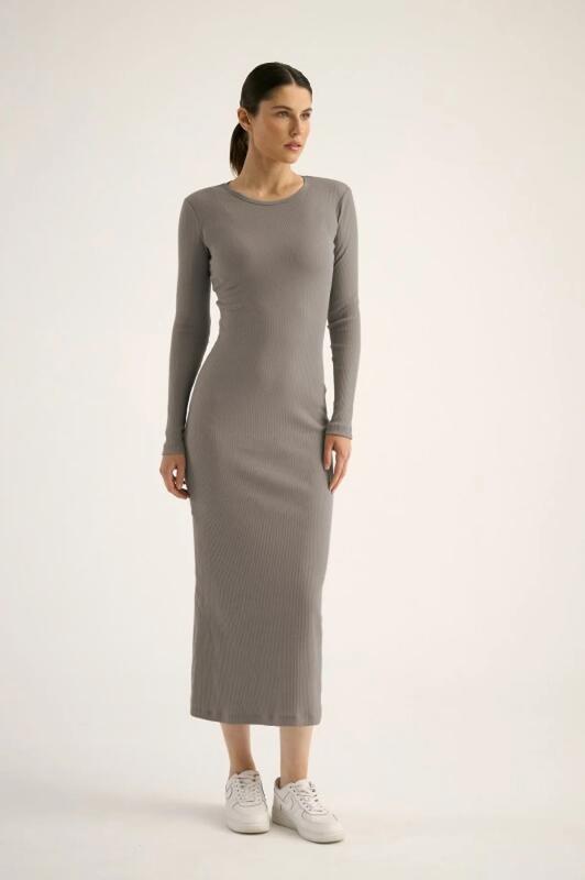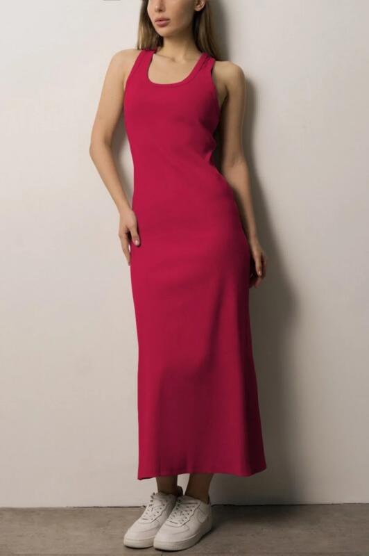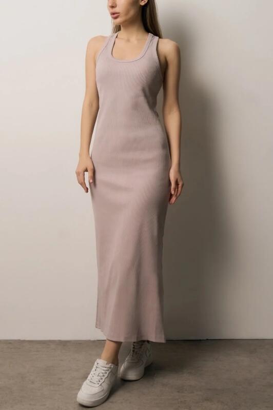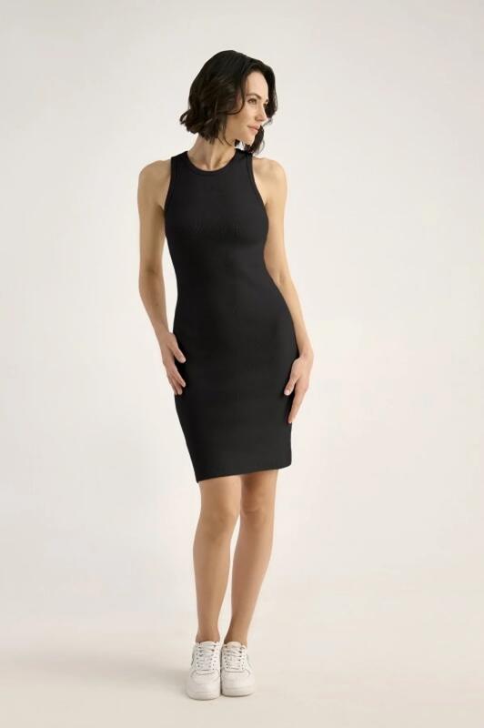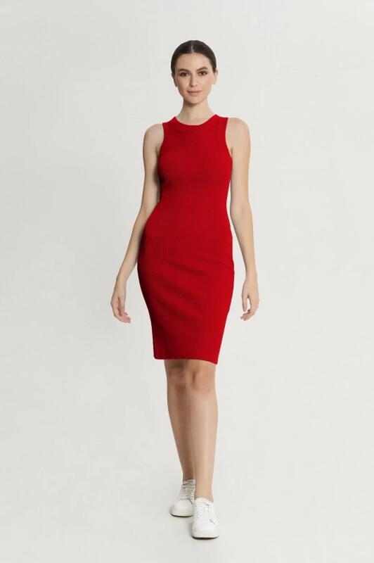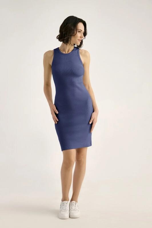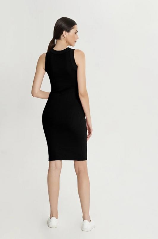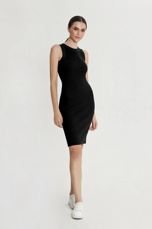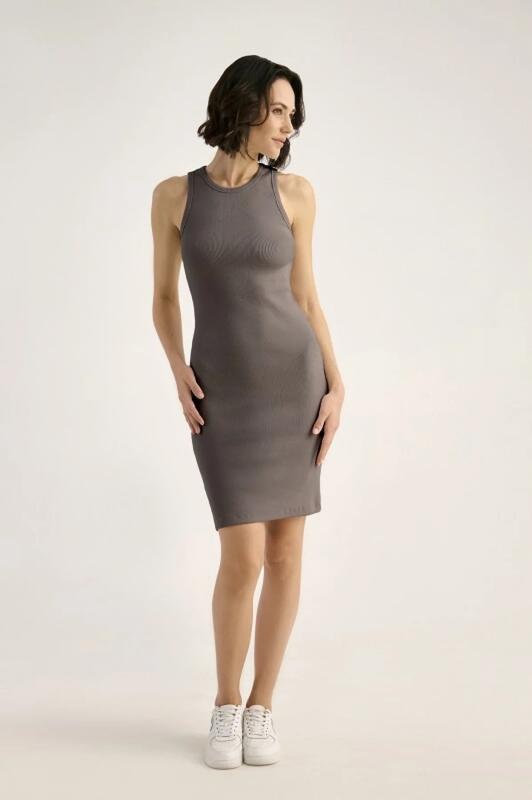 Платье средней длины из кашкорсе, облегающего силуэта, с широкой окантовкой пройм и горловины из рибаны.