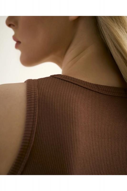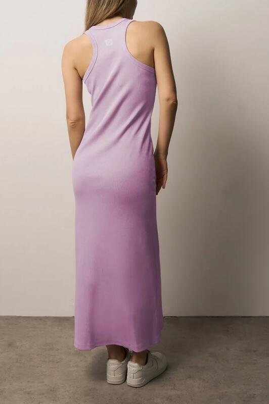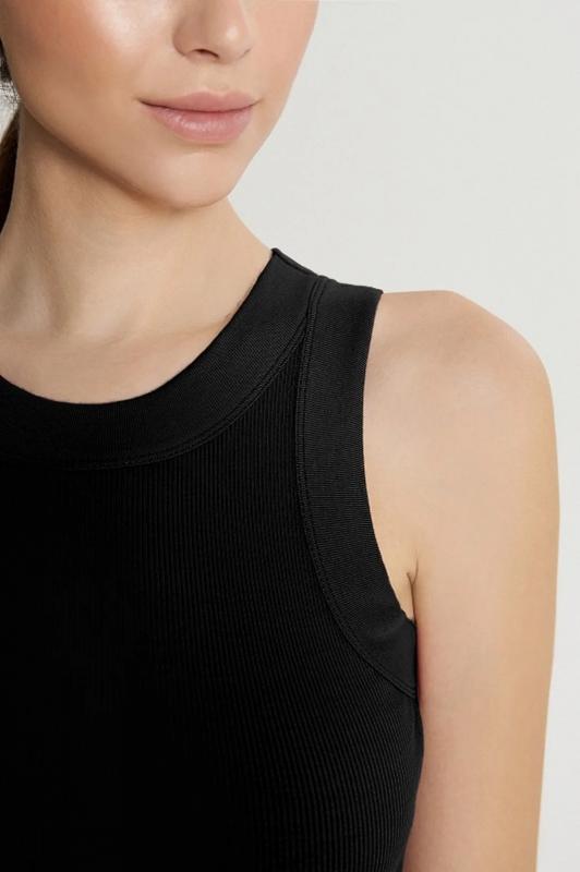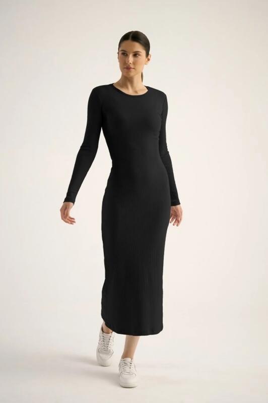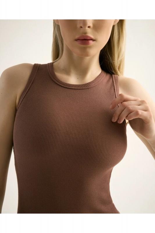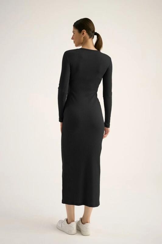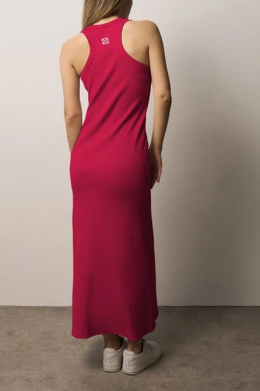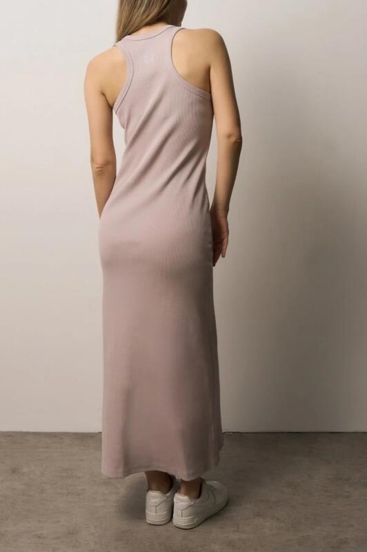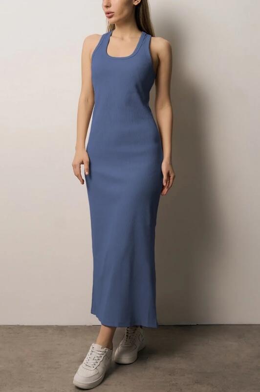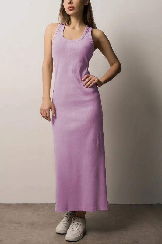Платье средней длины из кашкорсе, облегающего силуэта, с широкой окантовкой пройм и горловины из рибаны.