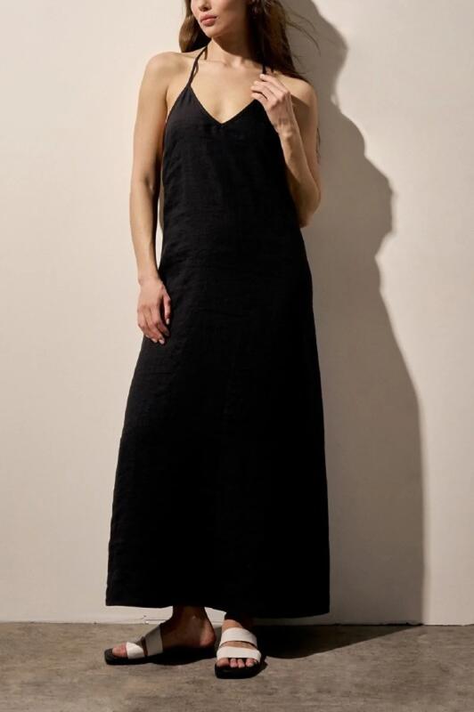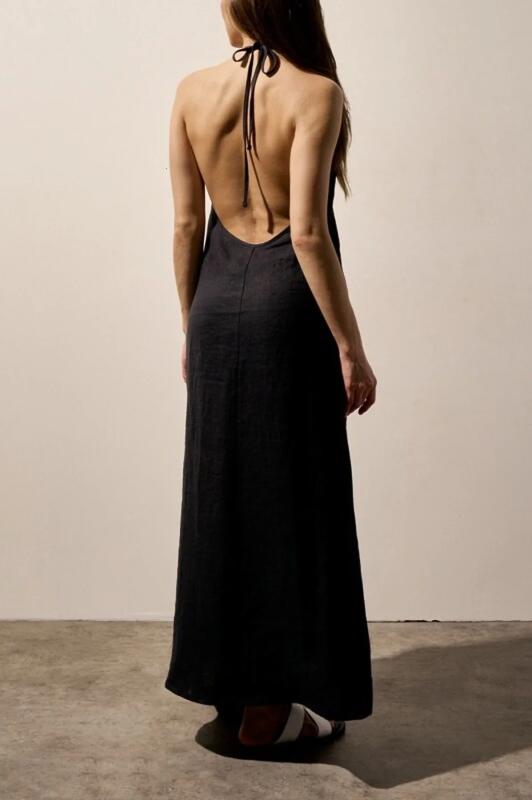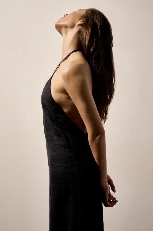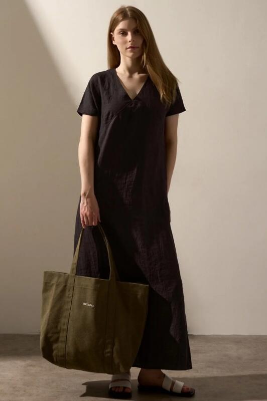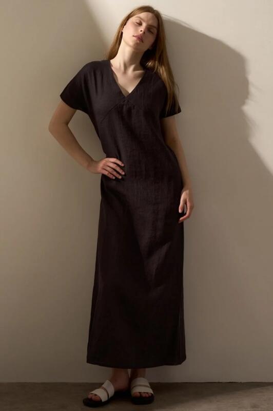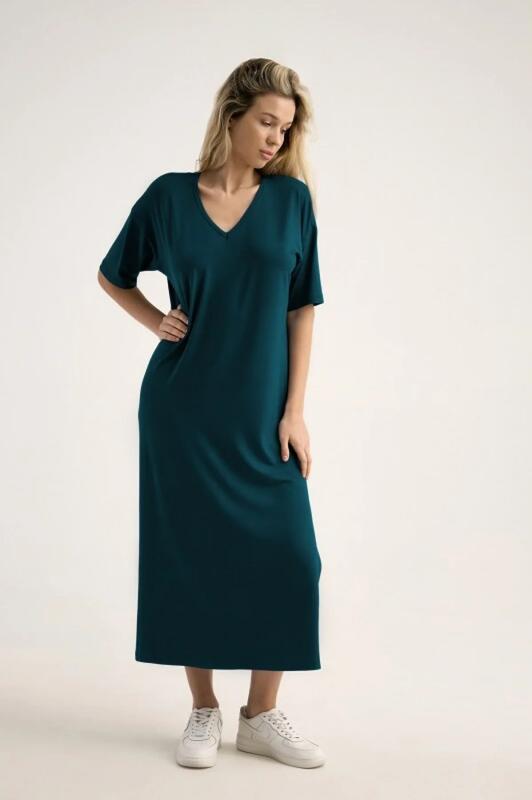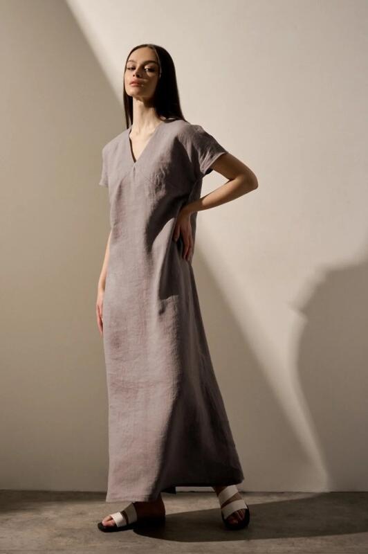 Платье, длина макси с высоким разрезом в левом боковом шве. Спущенное плечо.Втачной короткий рукав. V- вырез.Горловина окантована бейкой из основной ткани.