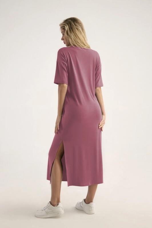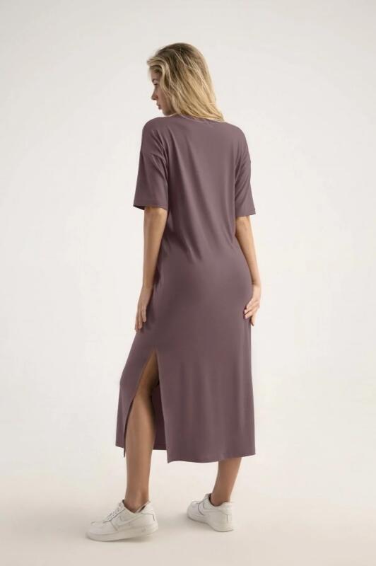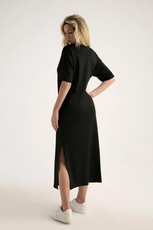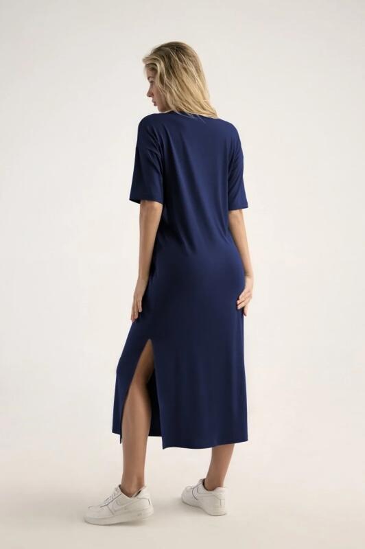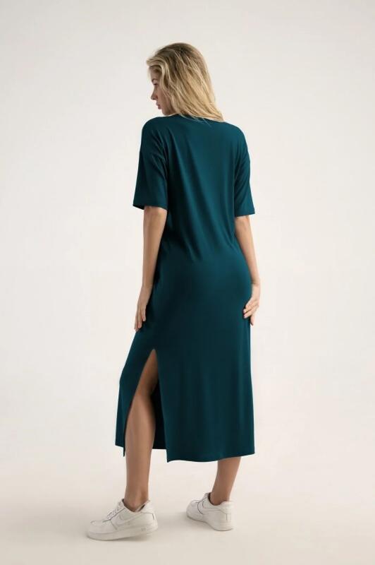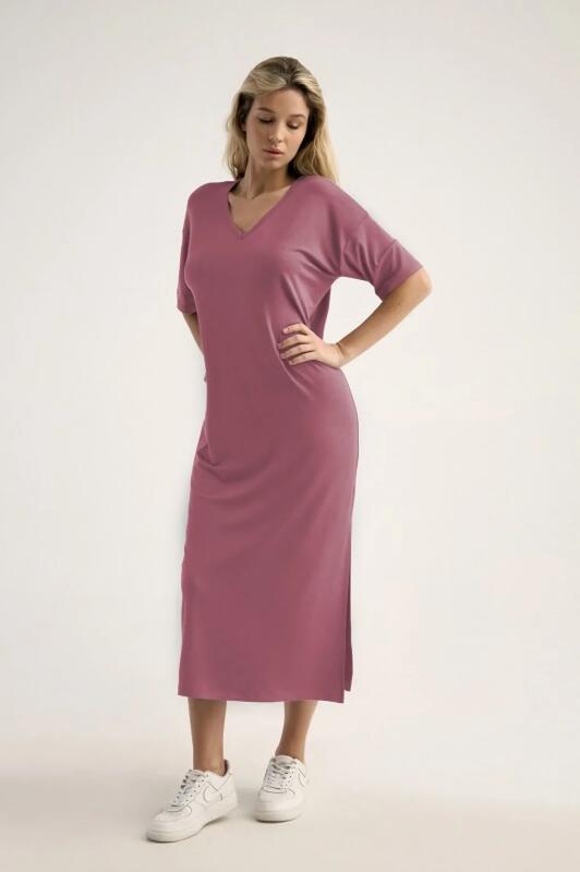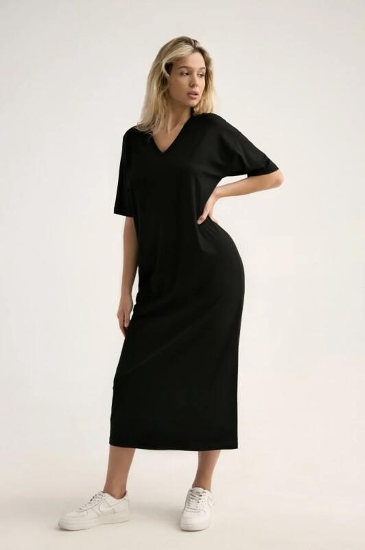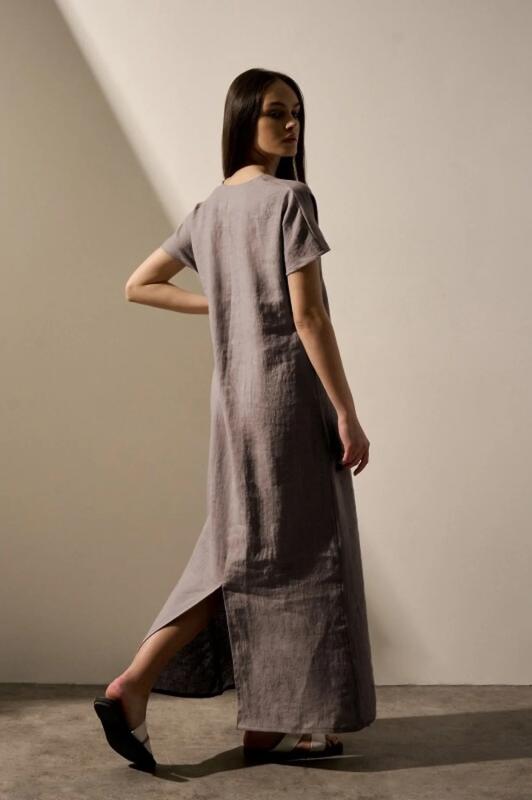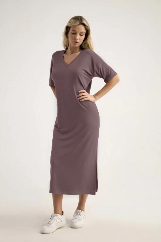 Платье с высоким разрезом в левом боковом шве. Спущенное плечо.Втачной короткий рукав. V- вырез.Горловина окантована бейкой из основной ткани.