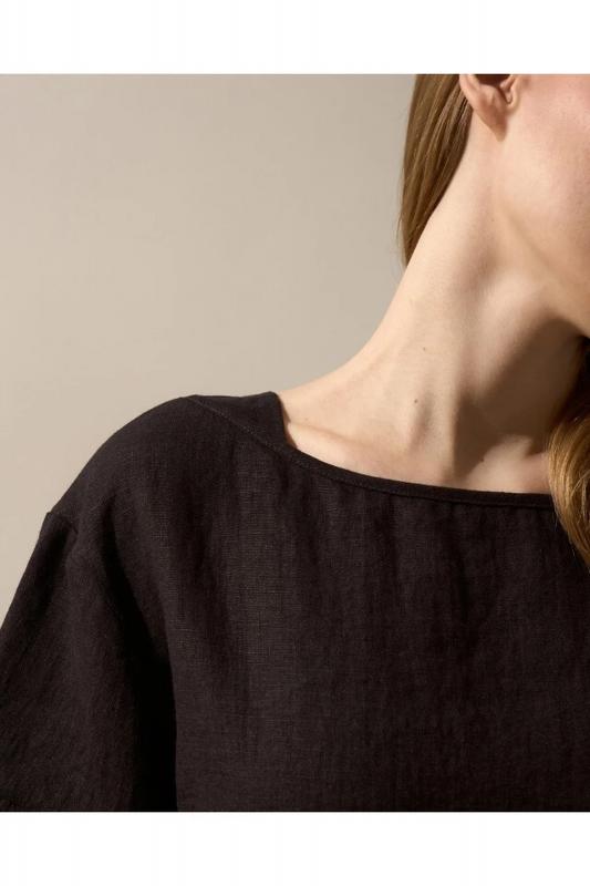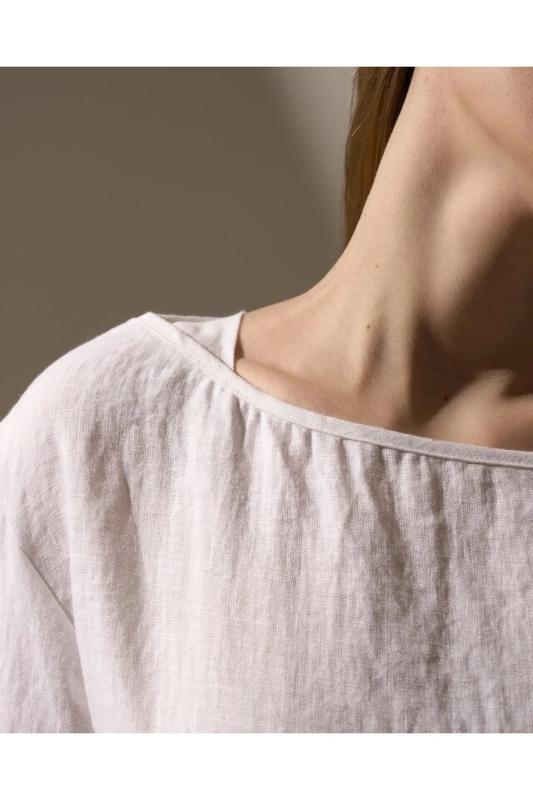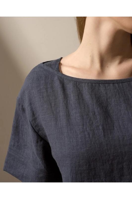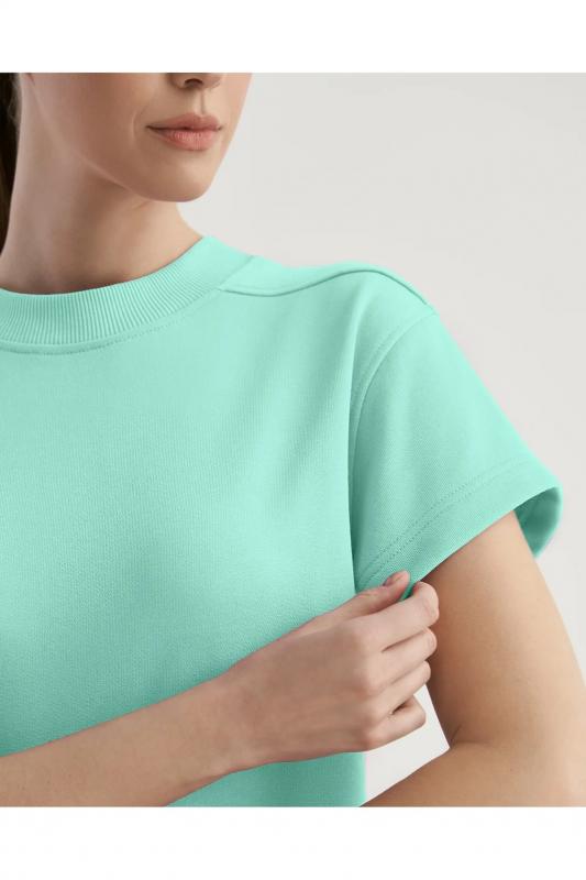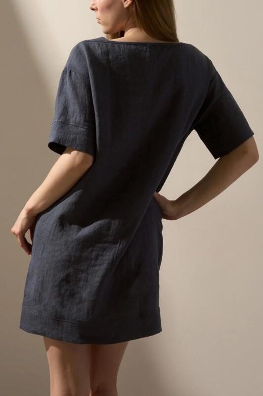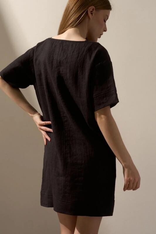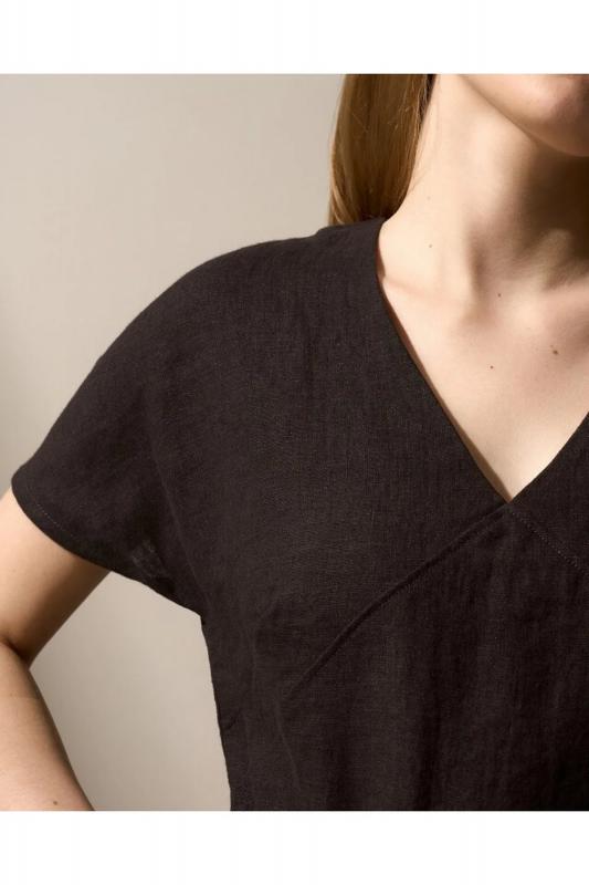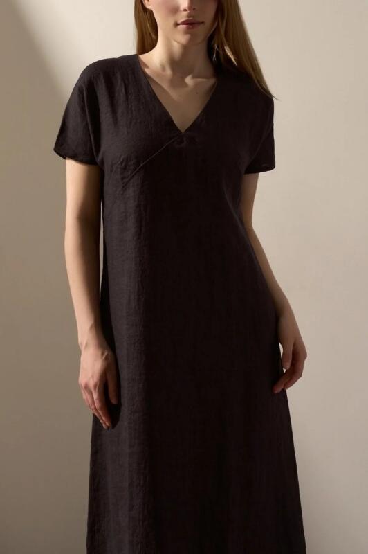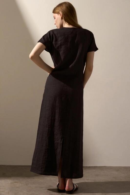 Платье с высоким разрезом в левом боковом шве. Спущенное плечо.Втачной короткий рукав. V- вырез.Горловина окантована бейкой из основной ткани.