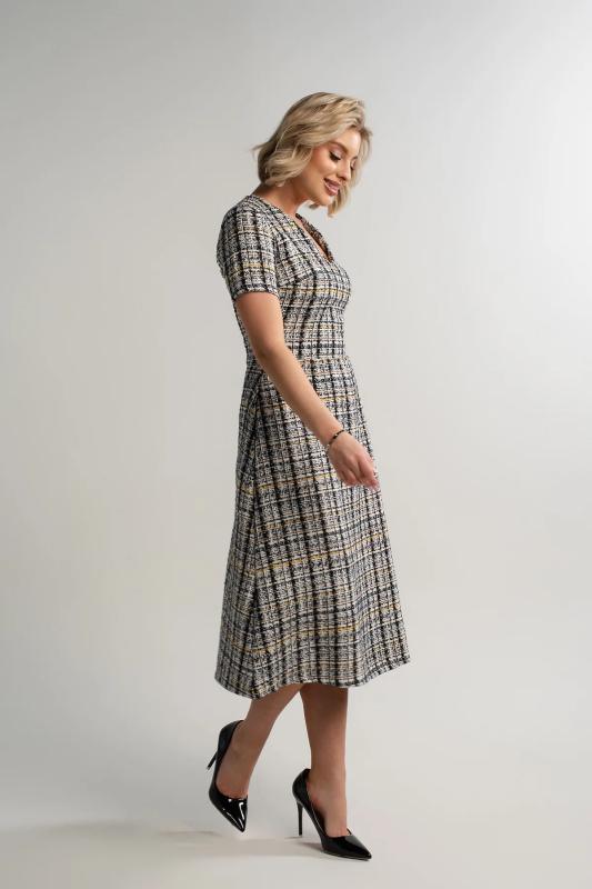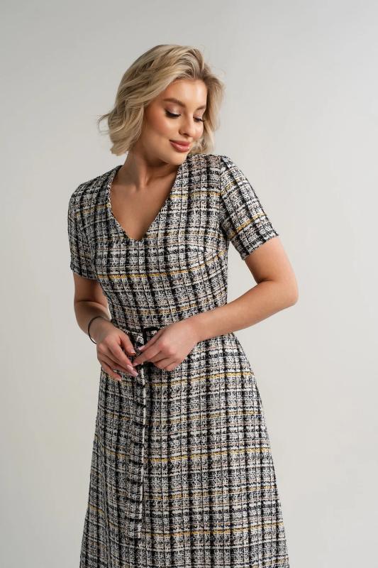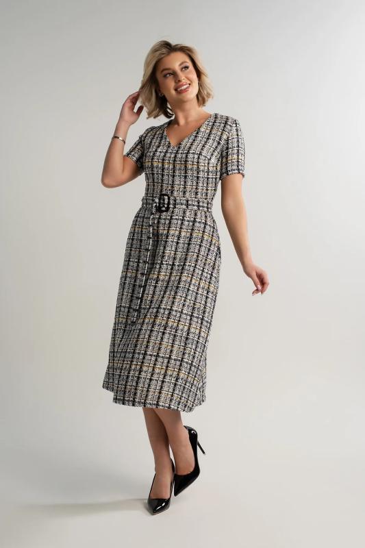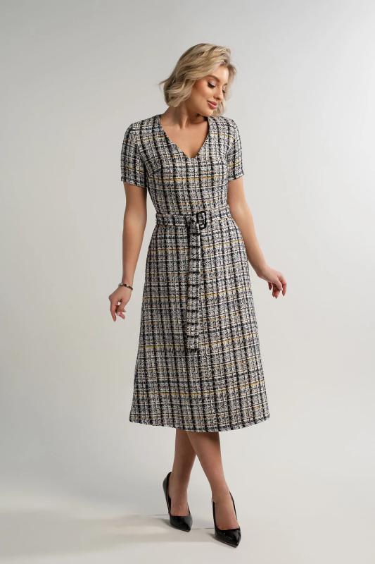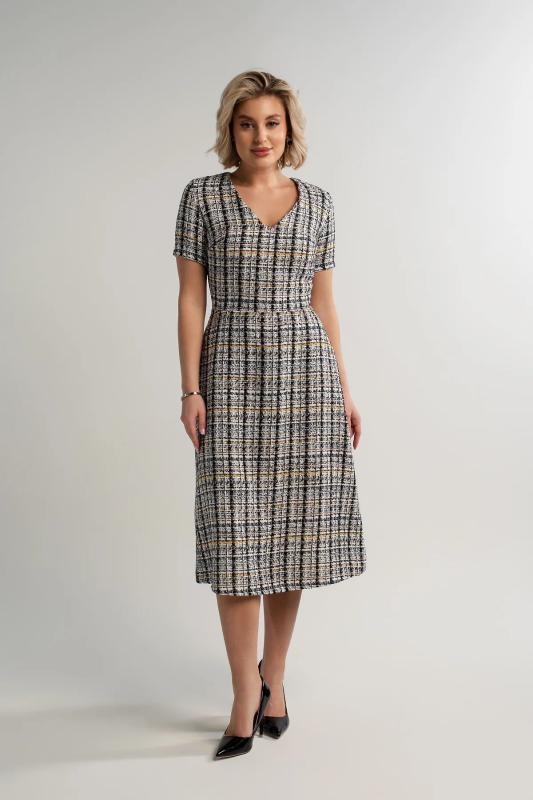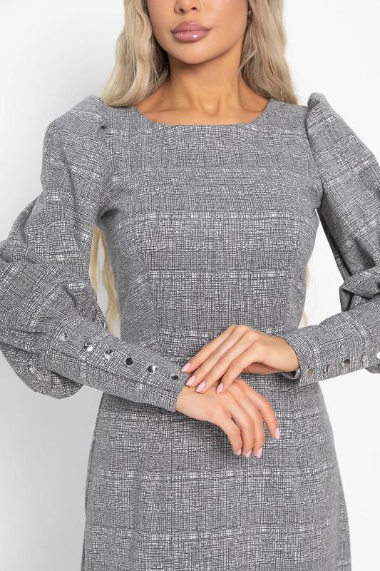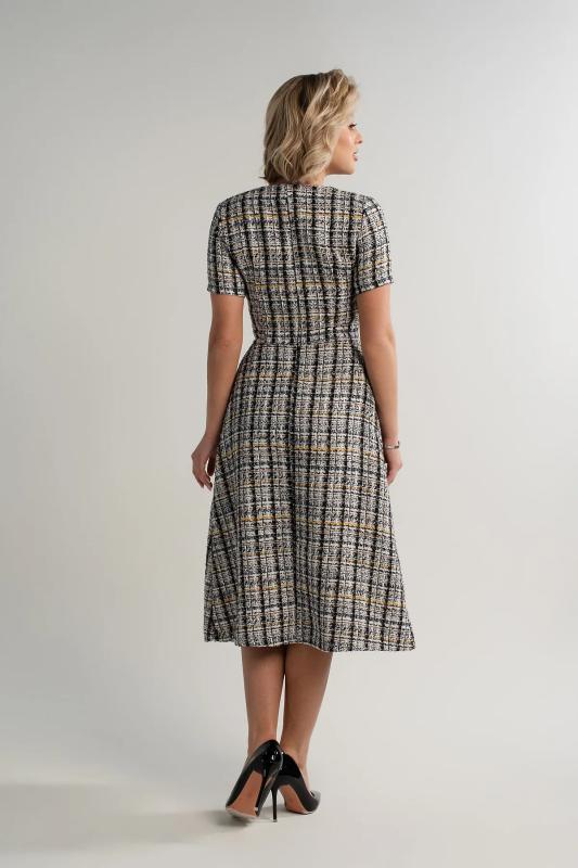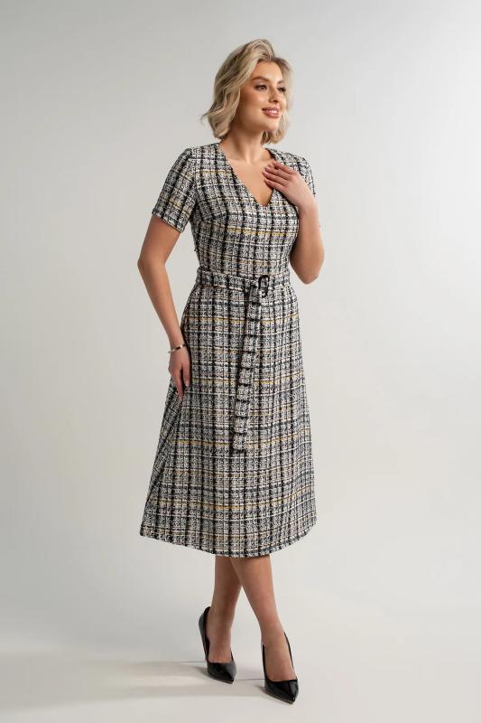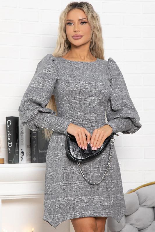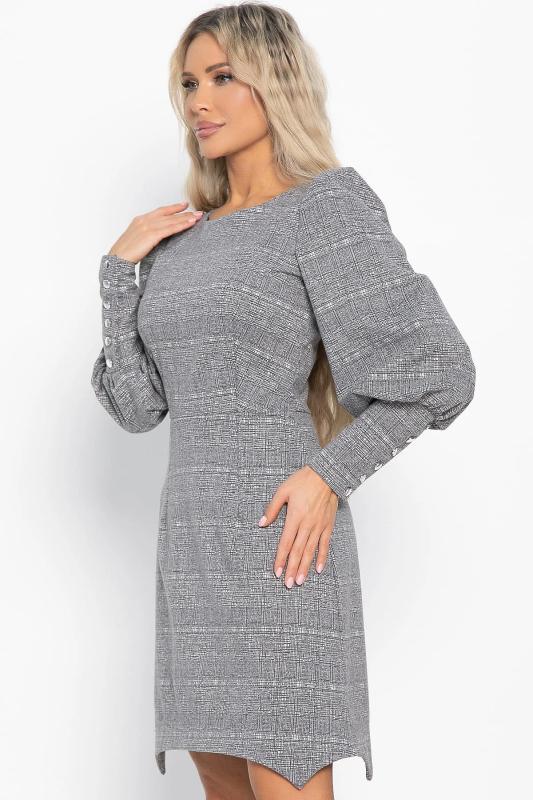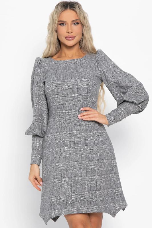 Состав : 65% вискоза, 35% полиэстер Материал : трикотаж Цвет : серый Принт : клетка Длина : миди Силуэт : асимметричный Карманы : отсутствуют Подкладка : отсутствует Вид застежки : потайная молния Декоративные элементы : пуговицы на манжетах Длина : 44 - 89 см,, 46 - 90 см,, 48 - 90 см,, 50 - 91 см Обхват груди : 44 - 90, 46 - 94, 48 - 98, 50 - 102 Обхват бёдер : 44 - 100, 46 - 104, 48 - 108, 50 - 112 Обхват талии : 44 - 68, 46 - 72, 48 - 76, 50 - 80 Дополнительные параметры размеров : 44 - длина рукава Это элегантное платье из мягкого и приятного на ощупь трикотажного полотна очарует вас своим стилем и комфортом. Изнанка ткани имеет тонкий начес, создающий дополнительное тепло и уют, делая каждое прикосновение особенным удовольствием. Фигурный низ платья добавляет образу женственности и утонченности, мягко подчеркивая линии фигуры. Потайной замок на спине придает изделию особый шарм, скрываясь от посторонних глаз и позволяя легко надевать платье даже самостоятельно. Это идеальное сочетание стиля, комфорта и