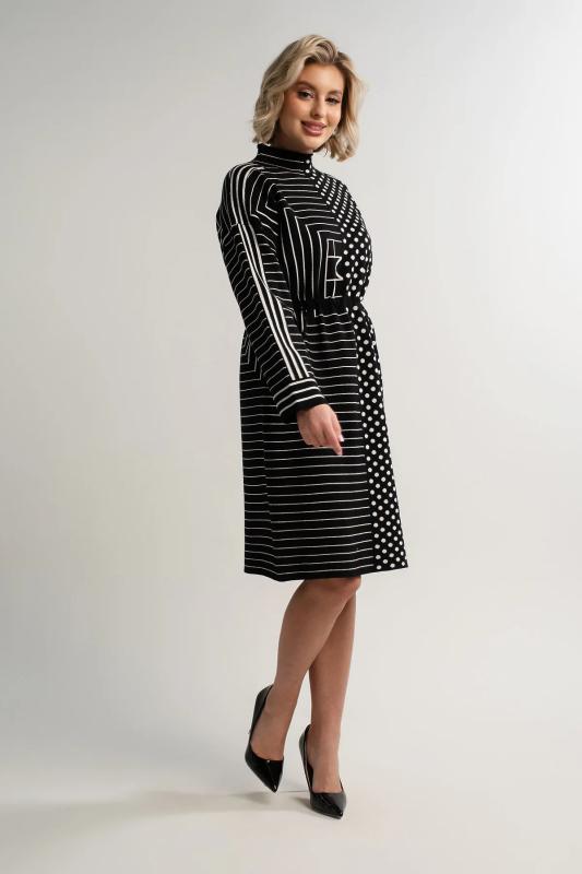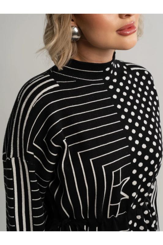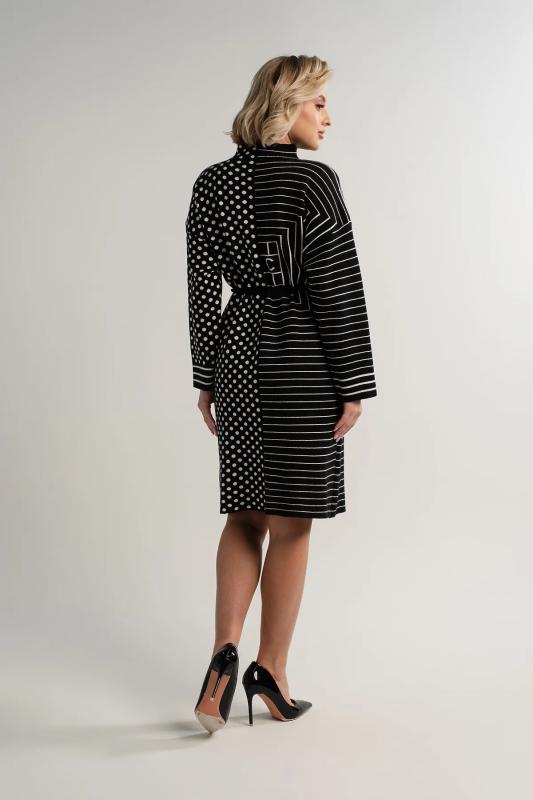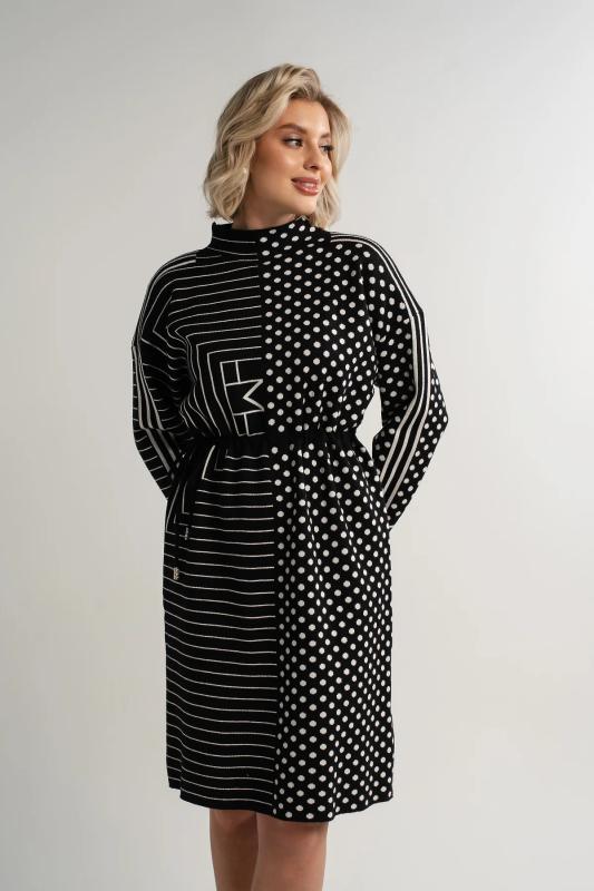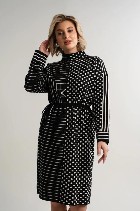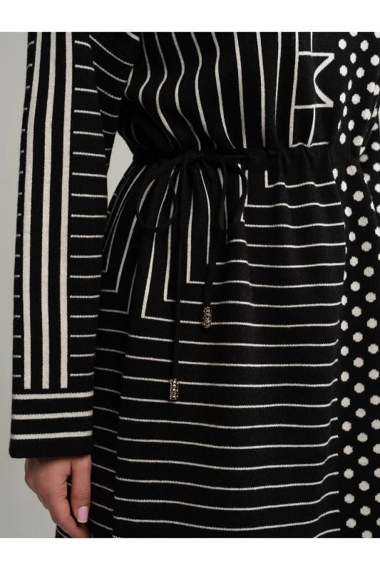 Состав : 70% шерсть, 20% акрил, 10% нейлон Материал : вязаное полотно Цвет : черный Принт : полоска и круги Длина : миди Силуэт : прямой Карманы : отсутствуют Подкладка : отсутствует Вид застежки : без застёжки Декоративные элементы : отсутствуют Длина : (one size 44-52) - 96 см Обхват груди : (one size 44-52) - 110 Обхват бёдер : (one size 44-52) - 110 Обхват талии : (one size 44-52) - 108 Дополнительные параметры размеров : (one size 44-52) - длина рукава Стильное черно-белое платье добавит яркости вашему гардеробу. Дизайн разделен на две части: одна украшена классическими полосками, другая — ярким гороховым принтом. Этот контраст придает образу уникальность. Регулируемый пояс со шнурком подчеркивает талию и обеспечивает идеальную посадку. Отличный выбор для тех, кто ценит комфорт и оригинальность. Внимание! Рекомендуем ориентироваться на размерную сетку и выбирать свой привычный размер, согласно размерной таблице.*Допуск отклонения длины при массовом производстве 1-3 см является нормой. Уход за изделием: