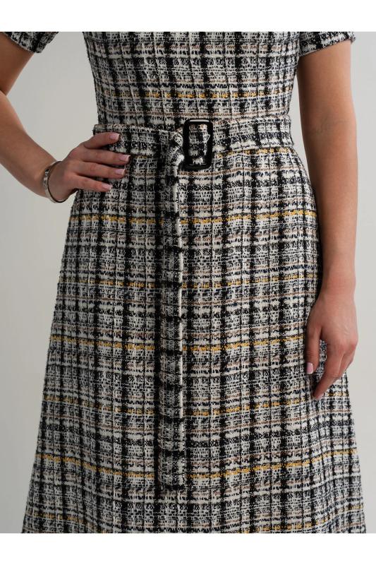 Состав : 65% полиэстер, 30% вискоза, 5% эластан Материал : твид Цвет : серый Принт : штрихи Длина : миди Силуэт : приталенный Карманы : отсутствуют Подкладка : отсутствует Вид застежки : молния Декоративные элементы : отсутствуют Длина : 44 - 112 см,, 46 - 112 см,, 48 - 114 см,, 50 - 114 см,, 52 - 116 см,, 54 - 116 см Обхват груди : 44 - 88, 46 - 92, 48 - 96, 50 - 100, 52 - 104, 54 - 108 Обхват бёдер : 44 - 100, 46 - 104, 48 - 108, 50 - 112, 52 - 116, 54 - 120 Обхват талии : 44 - 70, 46 - 74, 48 - 78, 50 - 84, 52 - 88, 54 - 92 Дополнительные параметры размеров : 44 - длина рукава Твидовое женское платье — элегантное и универсальное решение для любого случая. V-образная горловина подчеркнет изящность, а отсутствие подкладки обеспечивает комфорт и легкость. Этот стильный наряд идеально дополнит ваш гардероб, придавая образу нотки утонченности и современного шика. Внимание! Рекомендуем ориентироваться на размерную сетку и выбирать свой привычный размер, согласно размерной таблице.*Допуск отклонения длины при ма