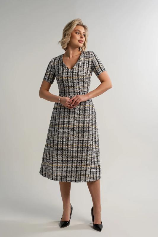 Состав : 65% вискоза, 35% полиэстер Материал : трикотаж Цвет : коричневый Принт : клетка Длина : миди Силуэт : асимметричный Карманы : отсутствуют Подкладка : отсутствует Вид застежки : потайная молния Декоративные элементы : пуговицы на манжетах Длина : 44 - 89 см,, 46 - 90 см,, 48 - 90 см,, 50 - 91 см Обхват груди : 44 - 90, 46 - 94, 48 - 98, 50 - 102 Обхват бёдер : 44 - 100, 46 - 104, 48 - 108, 50 - 112 Обхват талии : 44 - 68, 46 - 72, 48 - 76, 50 - 80 Дополнительные параметры размеров : 44 - длина рукава Это элегантное платье из мягкого и приятного на ощупь трикотажного полотна очарует вас своим стилем и комфортом. Изнанка ткани имеет тонкий начес, создающий дополнительное тепло и уют, делая каждое прикосновение особенным удовольствием. Фигурный низ платья добавляет образу женственности и утонченности, мягко подчеркивая линии фигуры. Потайной замок на спине придает изделию особый шарм, скрываясь от посторонних глаз и позволяя легко надевать платье даже самостоятельно. Это идеальное сочетание стиля, комфо