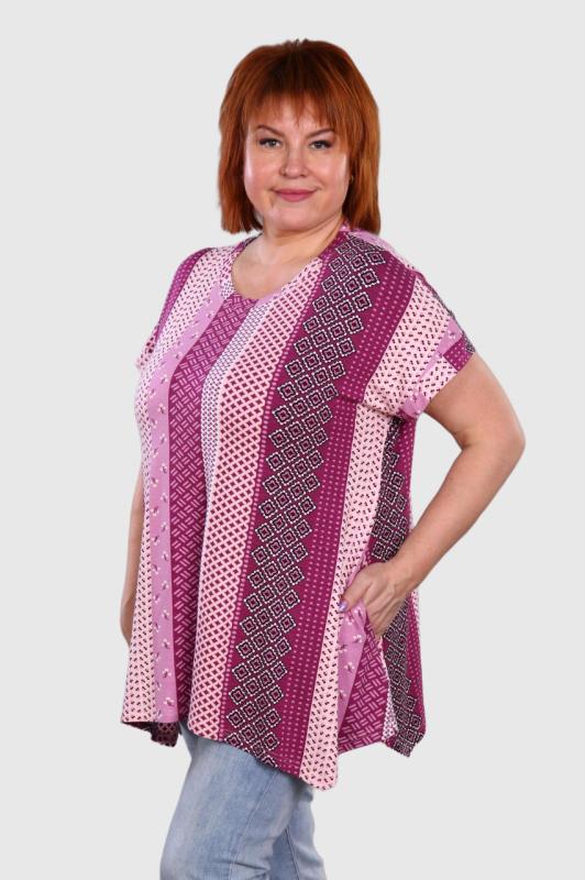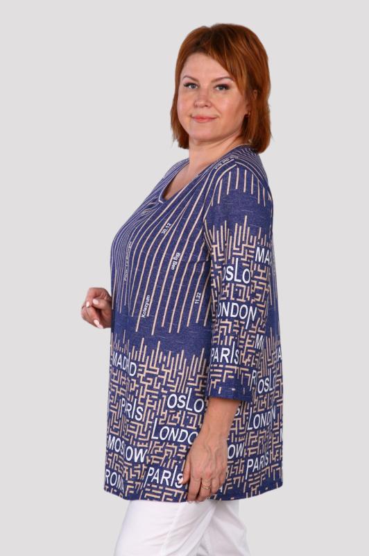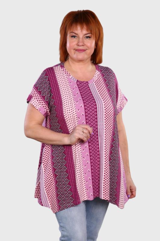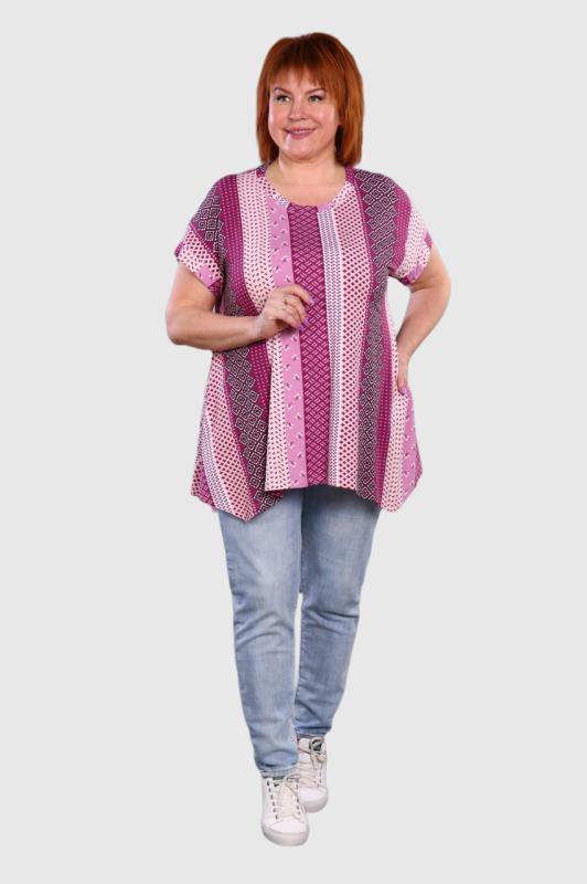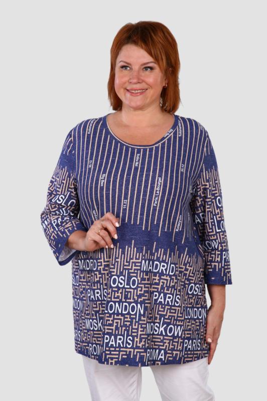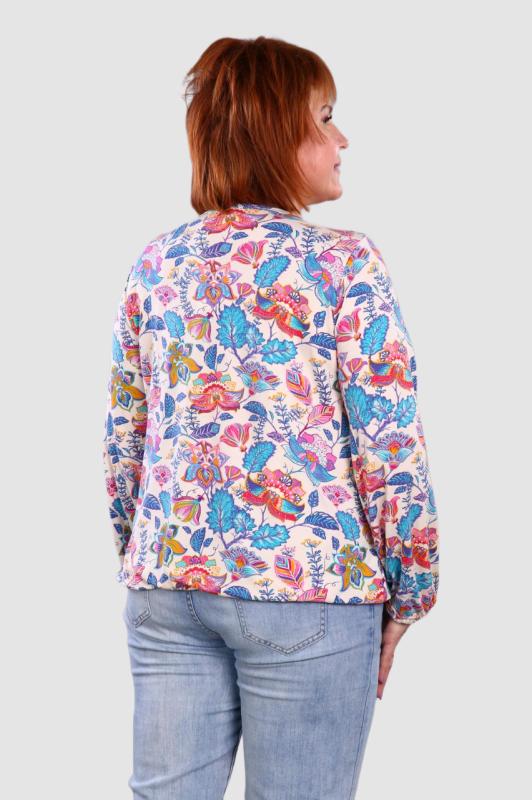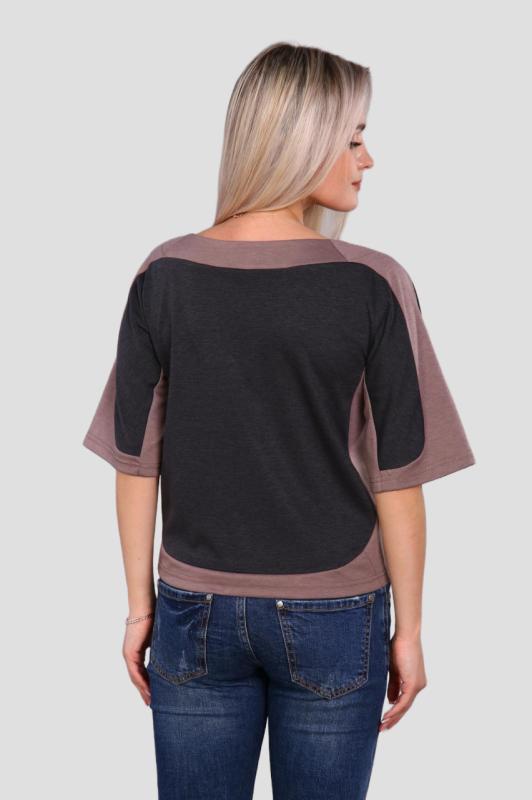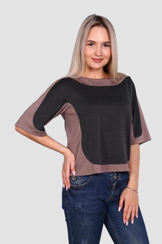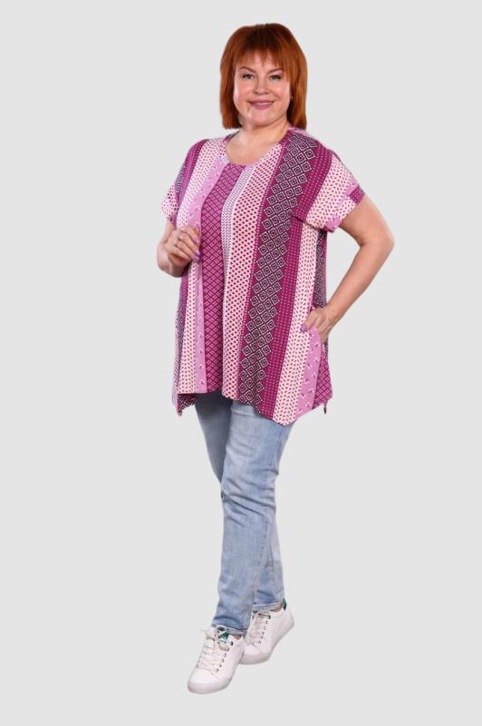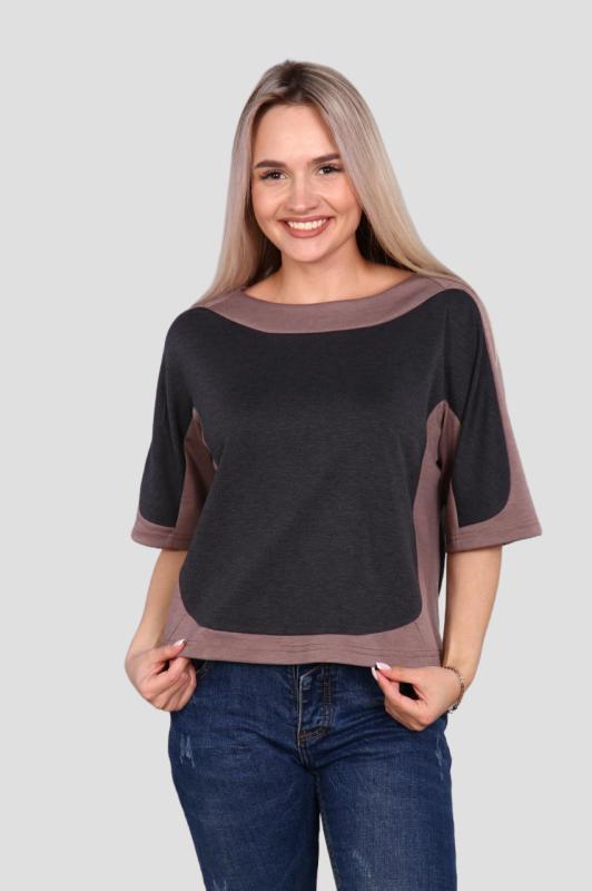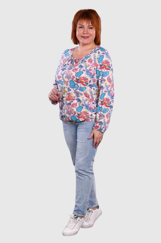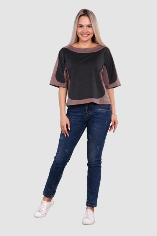 Легкая футболка свободного кроя с округлым вырезом горловины. Низ рукава с отложными манжетами и декоративными патами с пуговицами. Также паты с пуговицами по низу изделия. Эффектная модель, которая подчёркивает достоинства фигуры. Хорошо сочетается с классическими брюками, джинсами, юбками и жакетами. Материал изделия хорошо держит форму и приятен к телу.