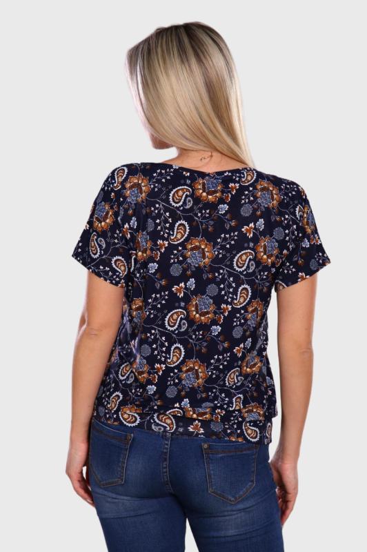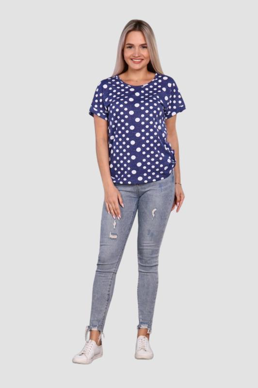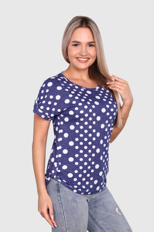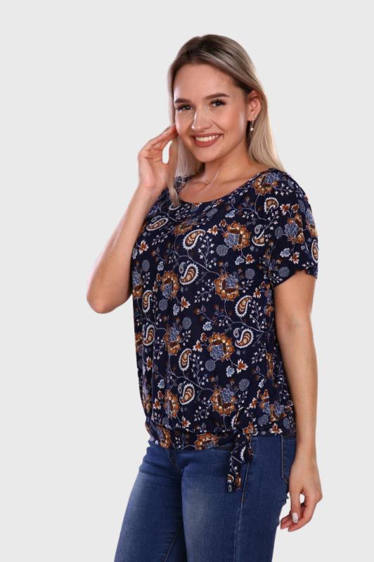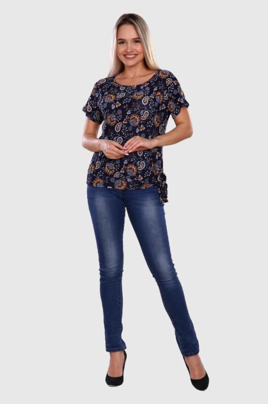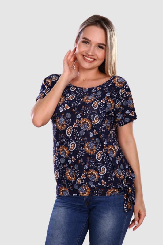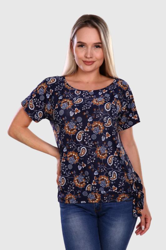 Стильная женская футболка. Прямой крой, свободная посадка, короткий рукав. Низ декорирован узлом, завязывающимся сбоку. Обаятельный образ для динамичной девушки. Модницам сегодня не обойтись без красочной футболки, которая играет главную роль при составлении модного и оригинального ансамбля одежды.