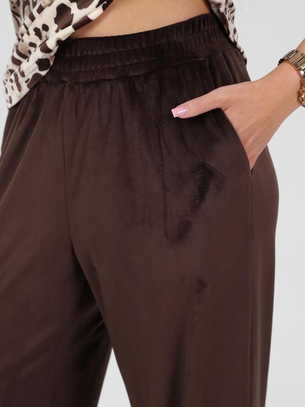 Брюки выполнены из однотонного флиса. С широким притачным поясом-кокеткой. С рельефными швами, обработанными декоративной отстрочкой