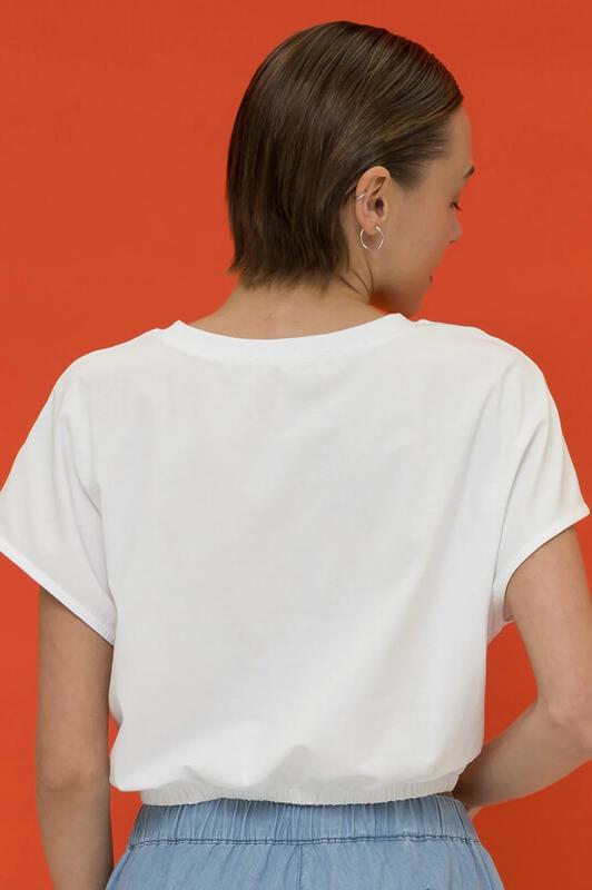 Новинка! Укороченная футболка для девочки умеренного объема. Спущенное плечо, декоративные отстрочки по низу изделия и рукавов. Эластичная рибана на вырезе горловины гарантирует, что футболка будет легко надеваться и сниматься, не теряя при этом своей формы. По переду в центральный шов вставлены декоративные лейблы. Перевод: секретный клуб тс-с-с-с: ты находишься здесь.