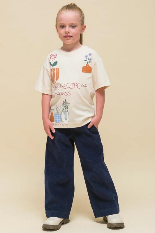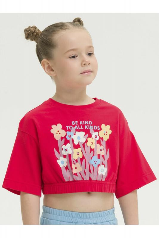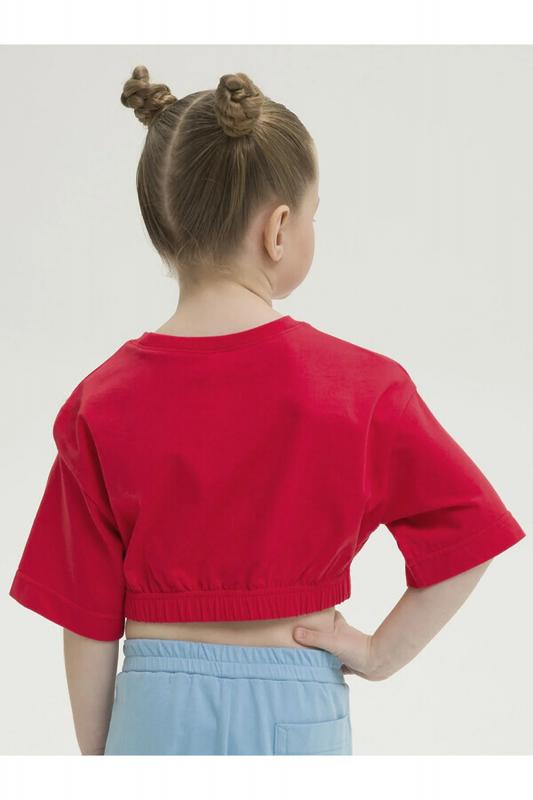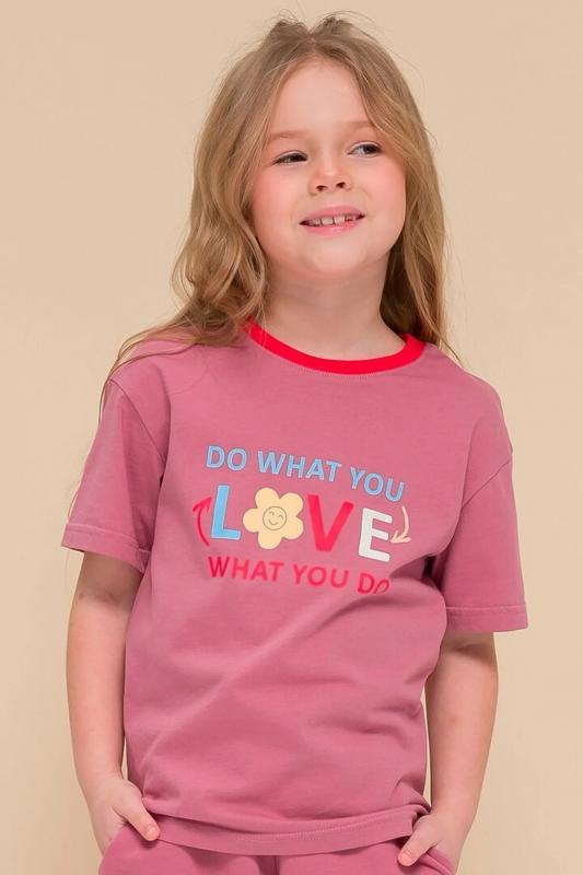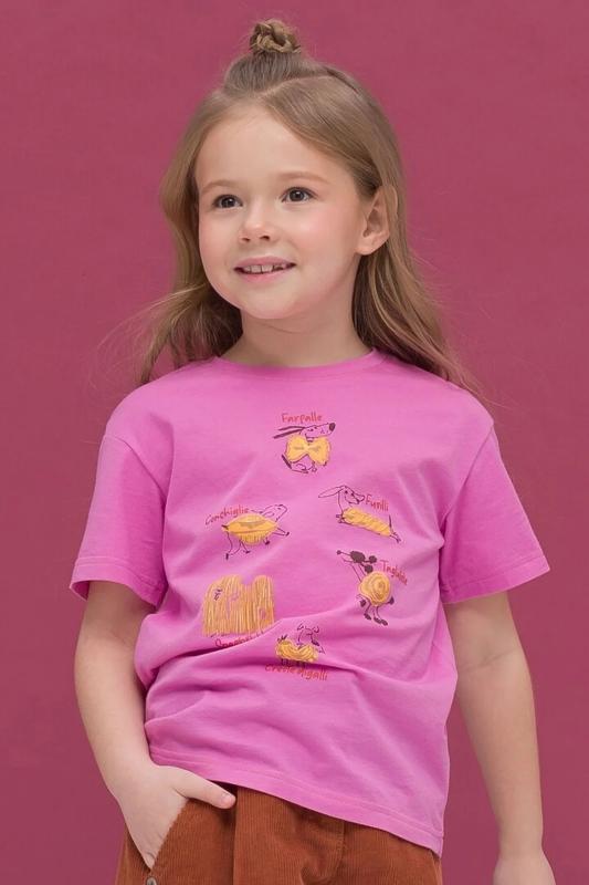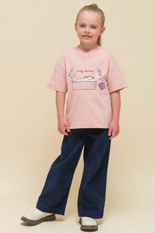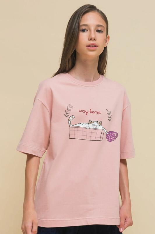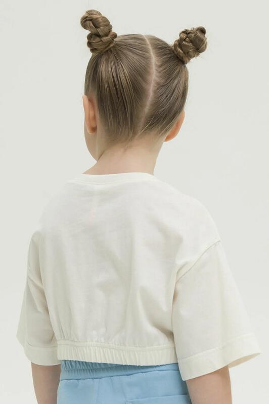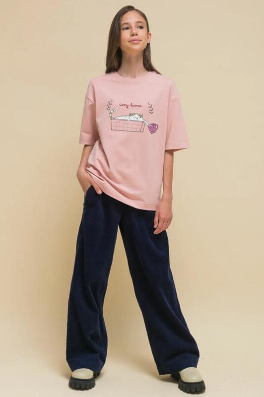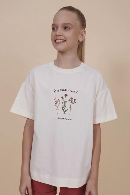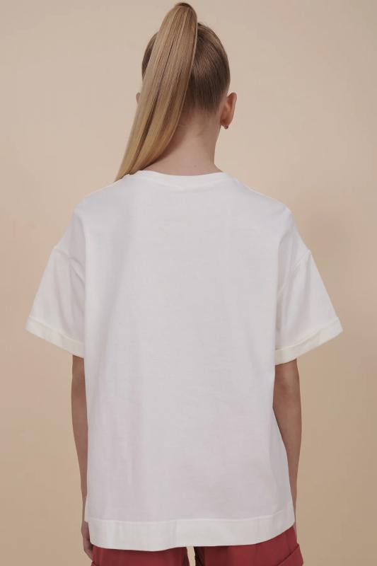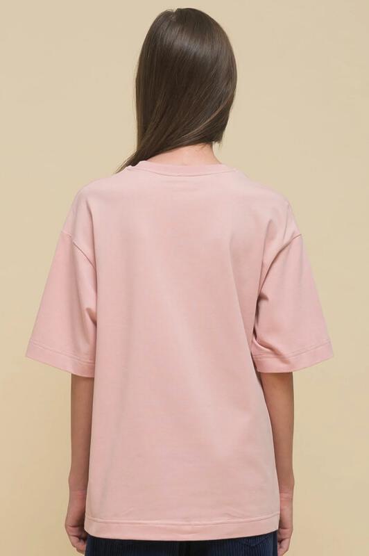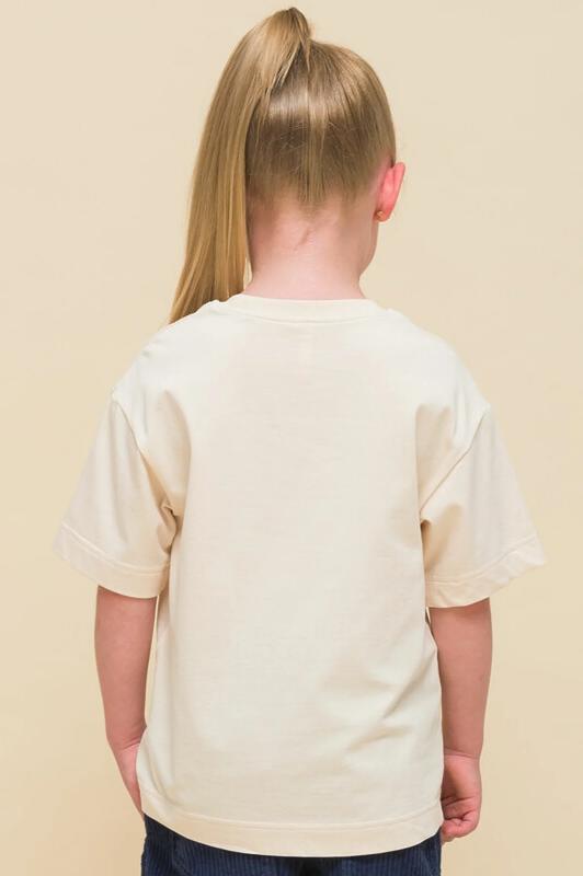 Футболка для девочек. Футболка умеренного объёма с закрепленными отворотами по низу рукавов и мягким прочным принтом.