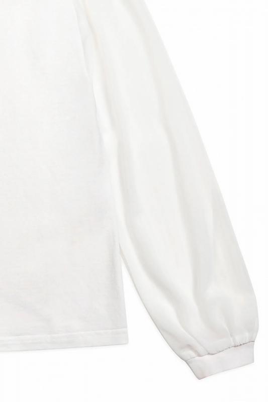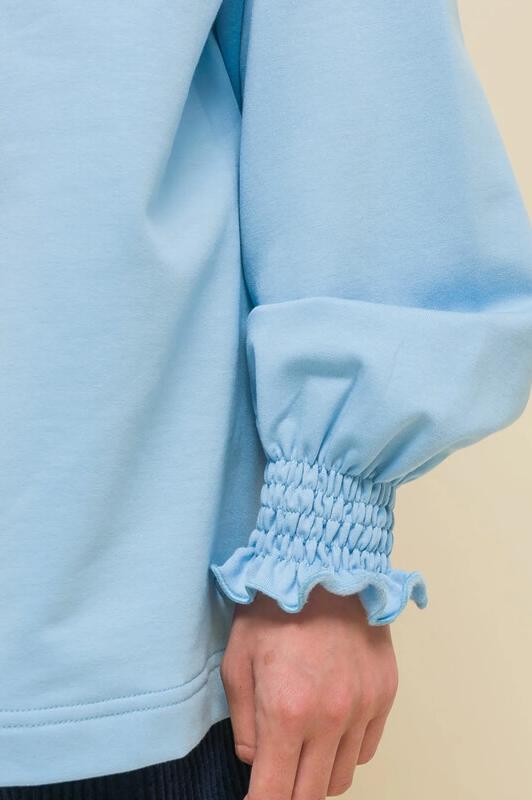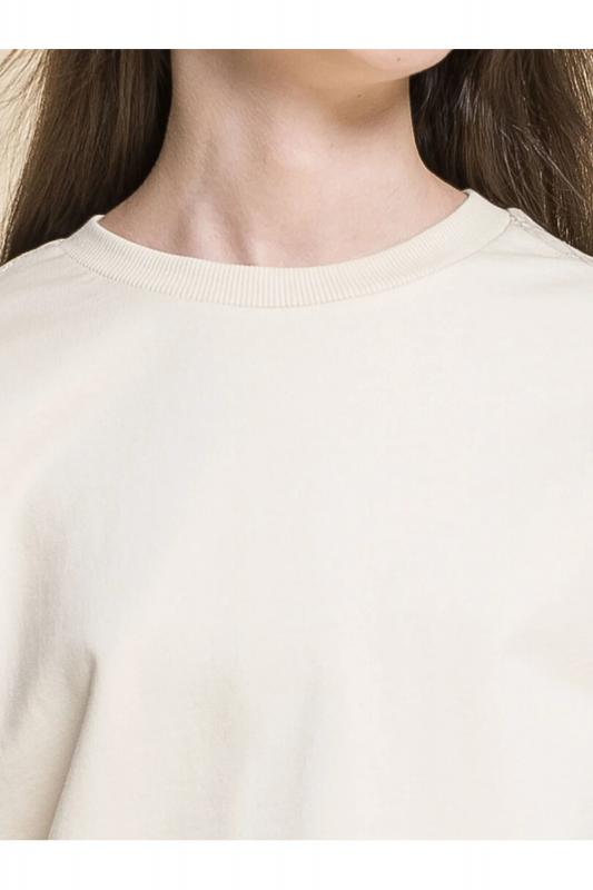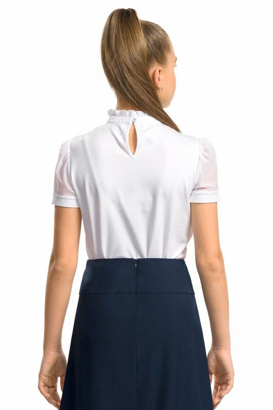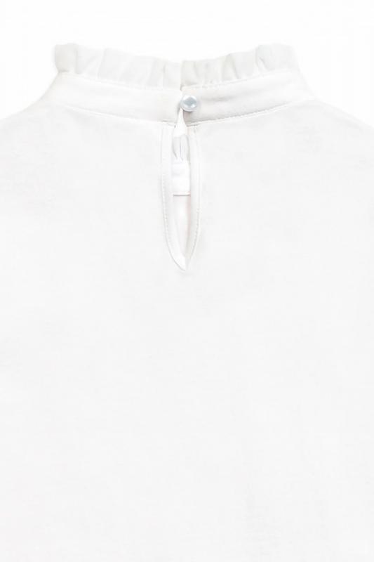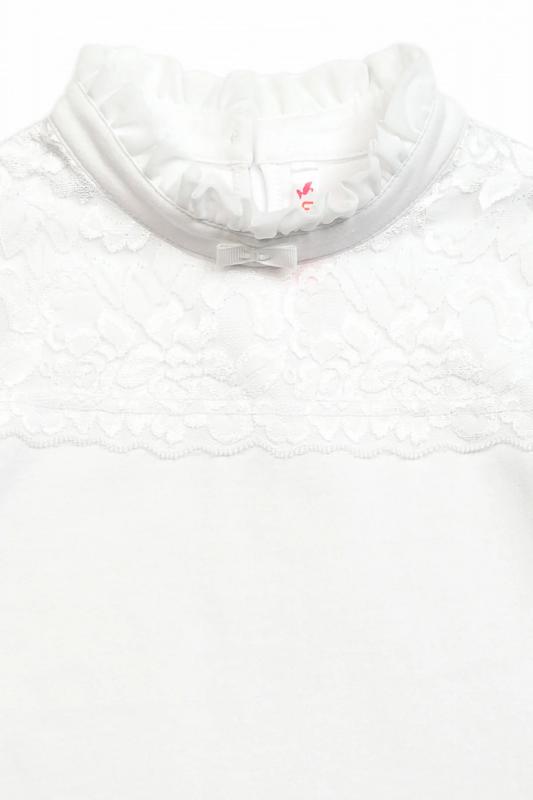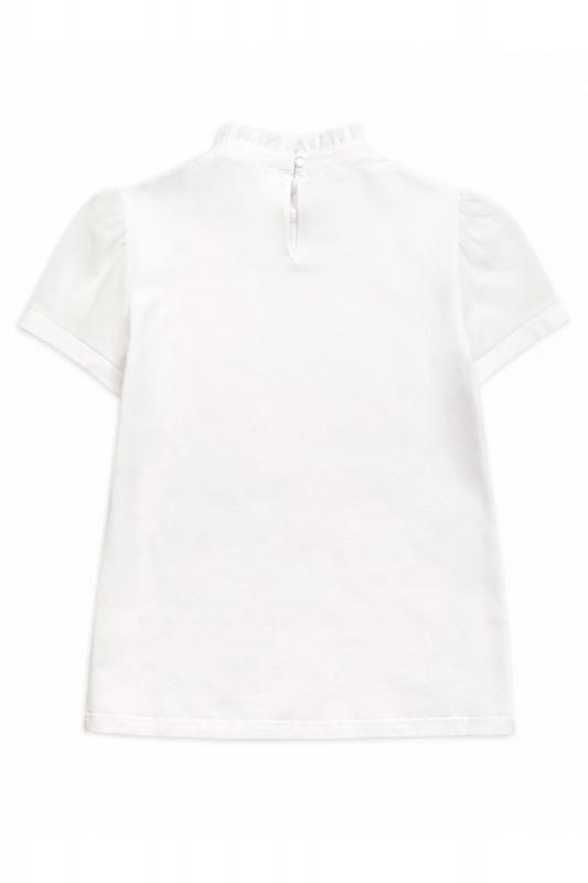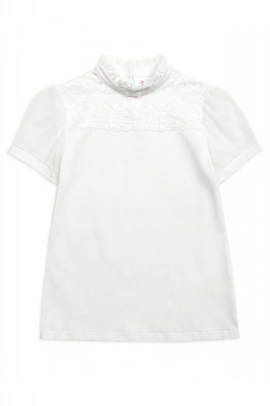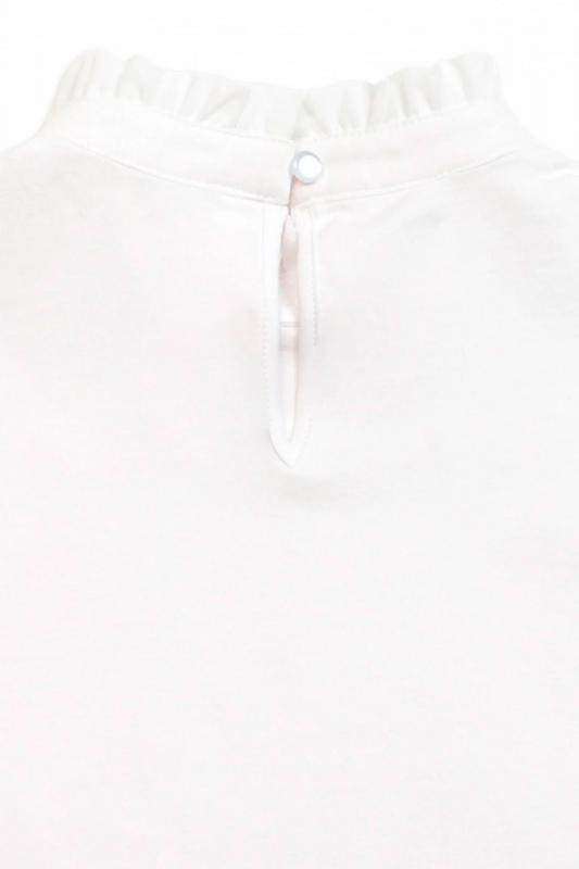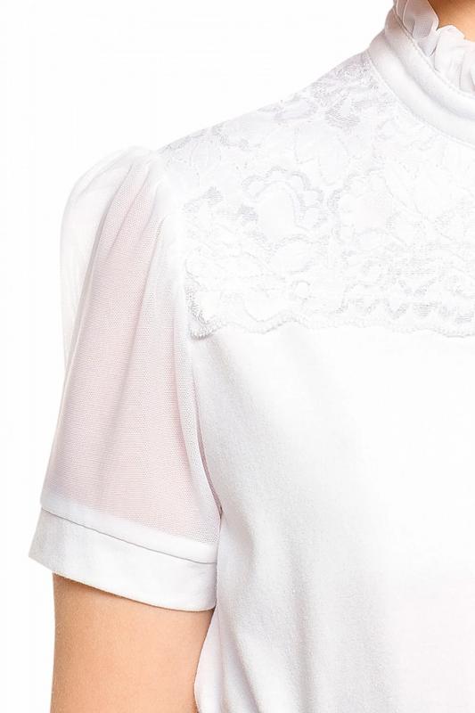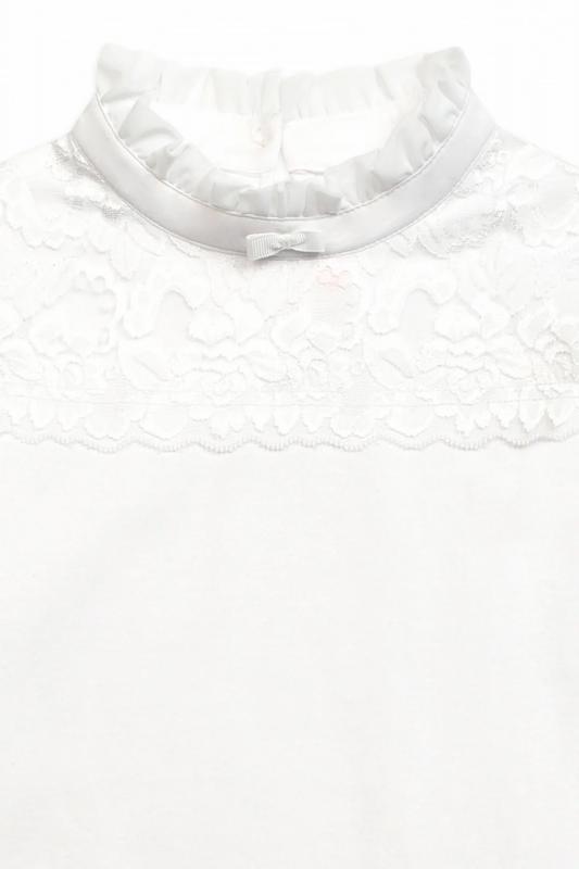 Футболка для девочек полуприлегающего силуэта с рукавом из мягкой эластичной сетки. Рукав по окату с небольшой сборкой, книзу собран на манжету из основной ткани. Воротник узкая стойка с рюшей из сетки по верхнему краю. Сзади застежка на пуговицу. По переду настрочена кокетка из кружевного полотна с фестонным краем. По центру стойки декоративный бантик из репсовой ленты.