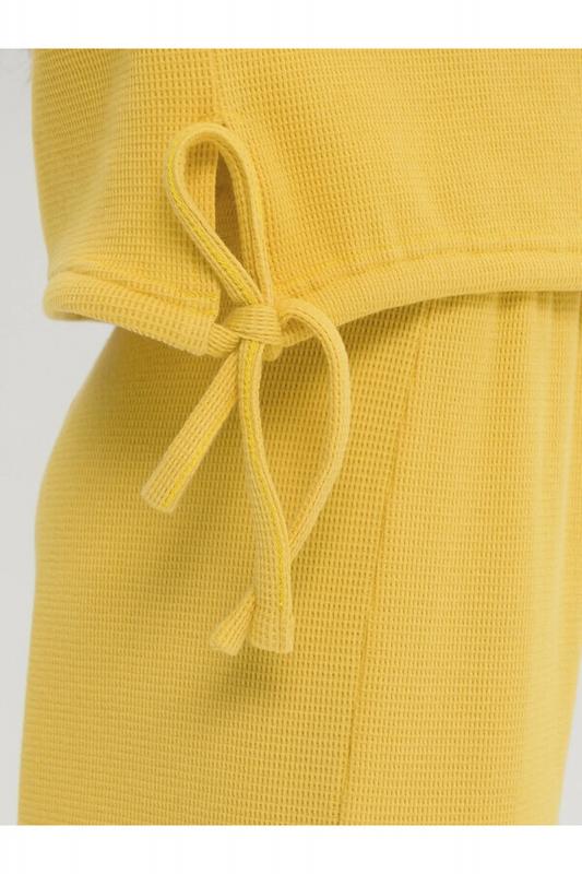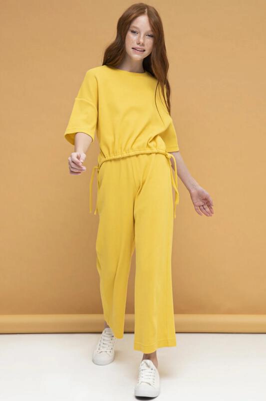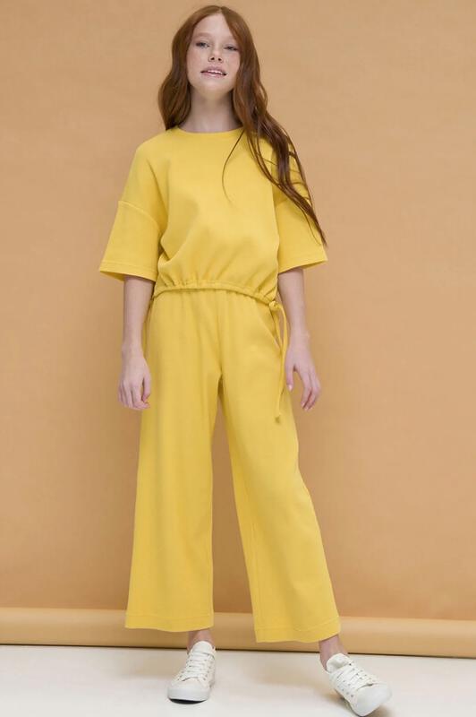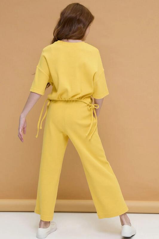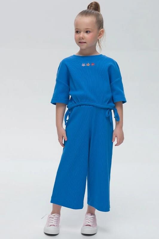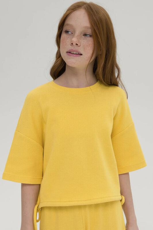 Брючный комплект кроп-топ и кюлоты для девочек. Безусловный хит сезона для юных модниц. Комплект из вафельного фактурного материала, который обеспечит комфортное и приятное ношение в самую жаркую погоду. Топ оверсайз с утяжками из основной ткани по низу, которые завязываются по бокам и создают легкий объем изделию. Широкие брюки прямого силуэта длиной 7-8 на резинке с внутренней утяжкой невероятно удобны. Данная модель не стесняет движения при ходьбе, свободно тянется, но при этом даже при постоянной носке не теряет форму. Идеальная детская одежда на все случаи жизни, от семейных походов по магазинам, до отдыха после школы и прогулок.