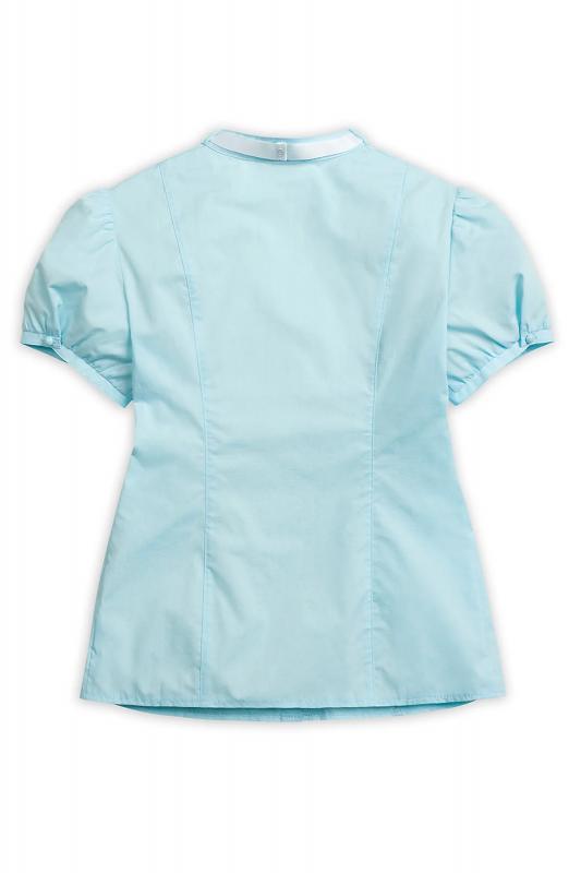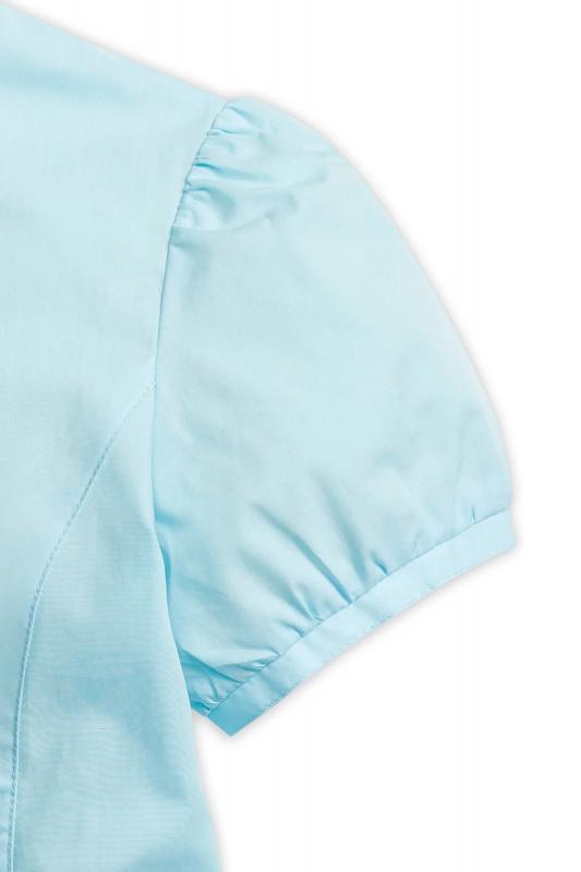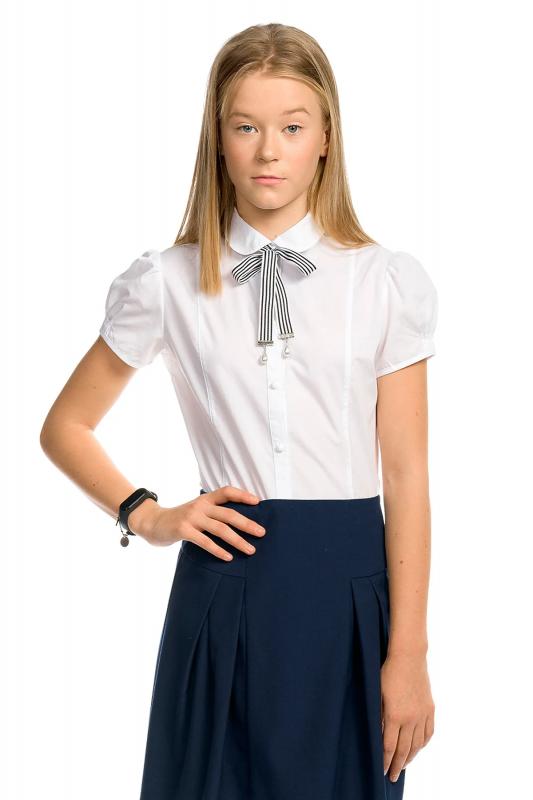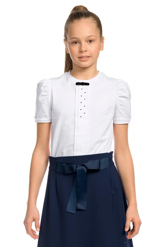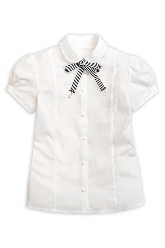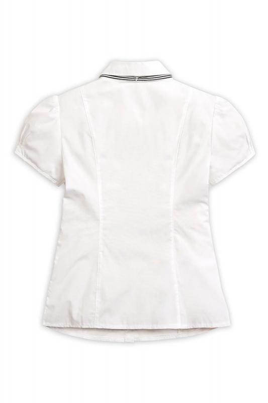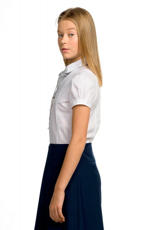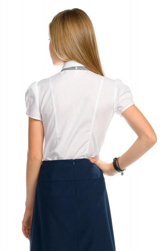 Блузка для девочек с коротким рукавом. Блузка классического полуприлегающего силуэта с рельефами по переду и спинке. Новая форма рукава с вертикальными защипами внизу и узкой манжетой. Под воротник на незаметную пуговку пристегивается съемная полосатая лента с жемчужинами на концах.