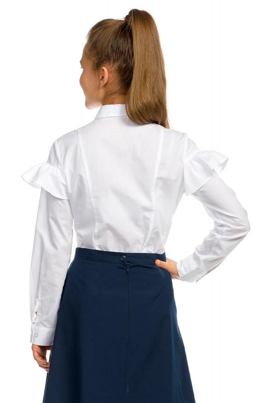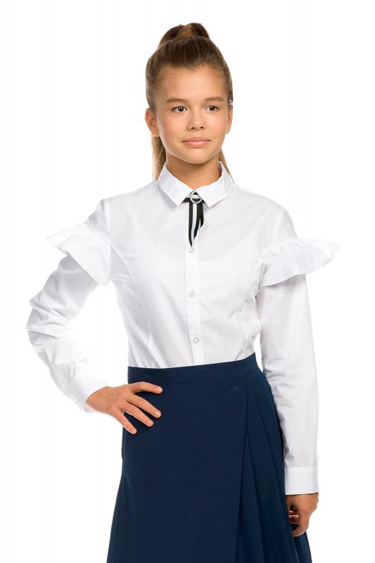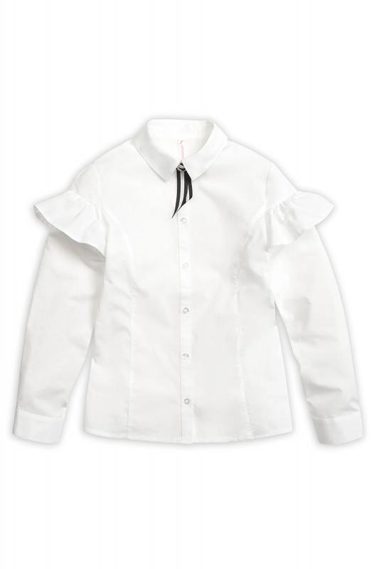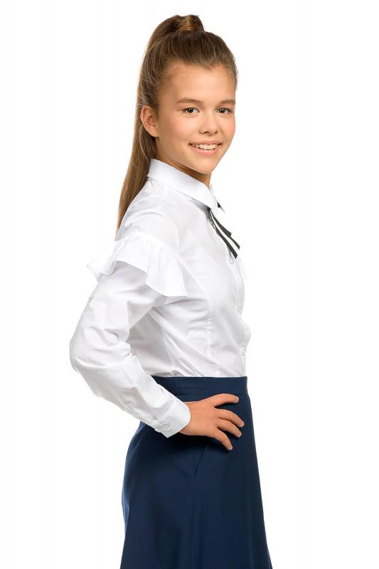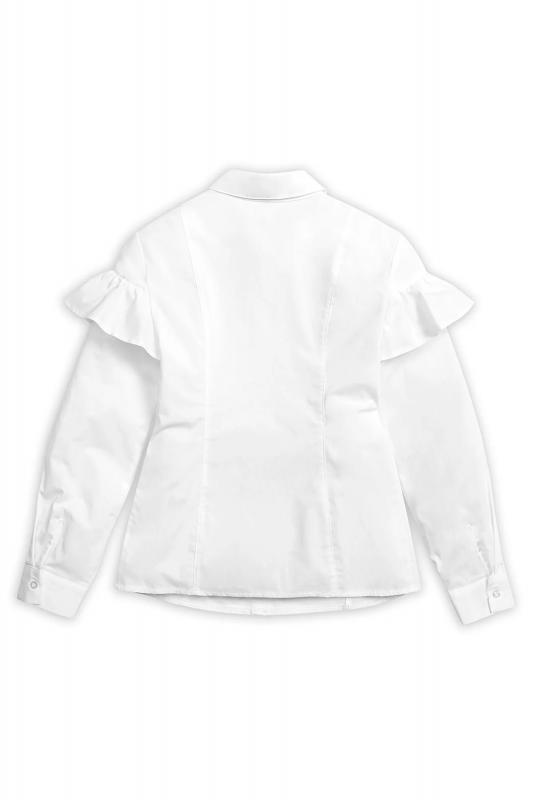 Блузка для девочек с длинным рукавом. Классическая блузка с немного увеличенным объемом по линии талии. В рукав в подрез вставлен волан. Съемный бантик из репсовой ленты в полоску заправлен в красивую пряжку со стразами.
