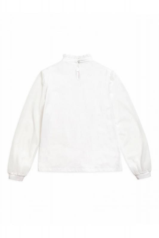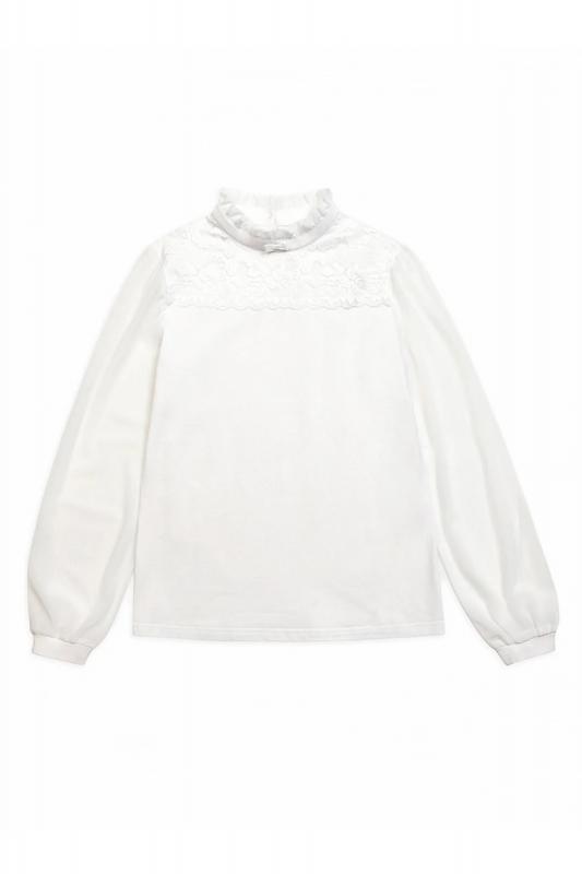 Джемпер для девочек полуприлегающего силуэта с длинным втачным рукавом из мягкой эластичной сетки. Рукав по окату с небольшой сборкой, объем рукава умеренный, книзу собран на манжету из основной ткани. Воротник узкая стойка с рюшей из сетки по верхнему краю. Сзади застежка на пуговицу. По переду настрочена кокетка из кружевного полотна с фестонным краем. По центру стойки декоративный бантик из репсовой ленты.