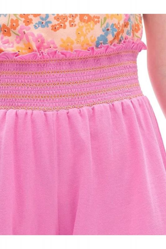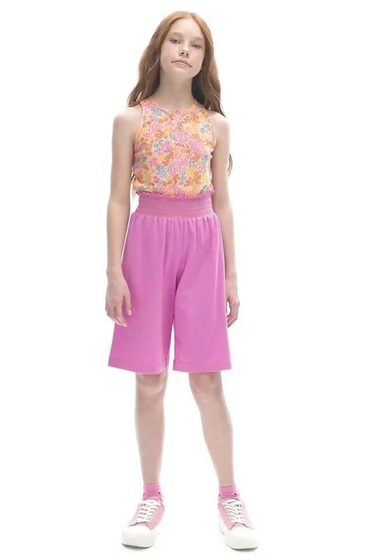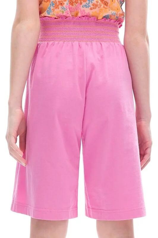 Шорты-бермуды из 100% хлопка для девочки. Натуральный состав ткани и свободный крой обеспечивают комфорт вашему ребёнку. Изделие приятное на ощупь и отлично подходит для жаркой погоды. Пояс модели украшает горизонтальная сборка контрастными нитками с деликатным рюшем вверху — актуальный летний тренд. Такие шорты будут носиться долго. Ребёнок растёт, и они словно "