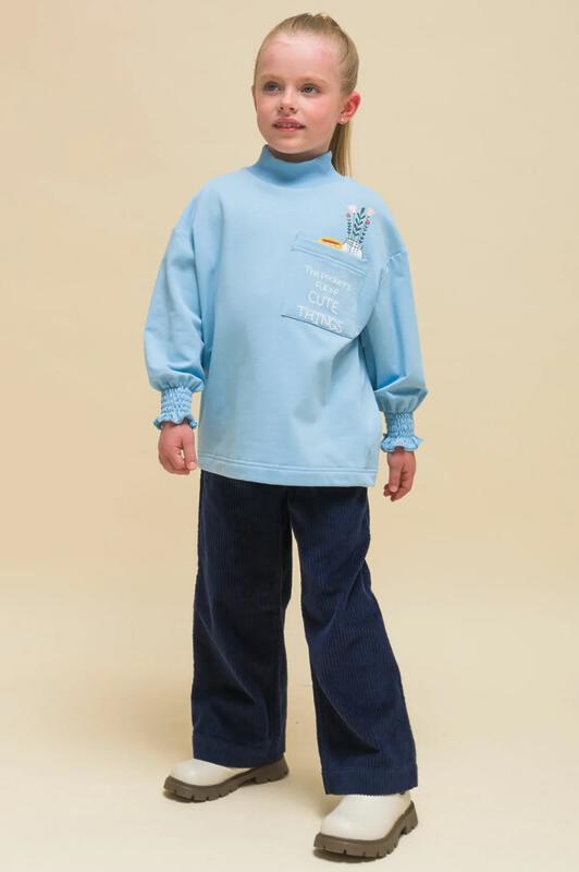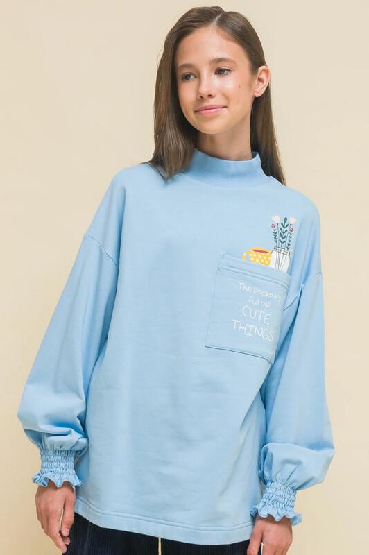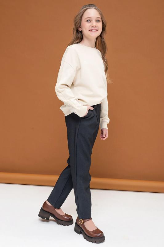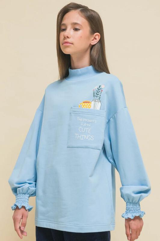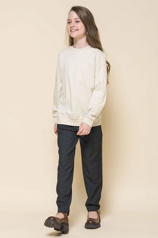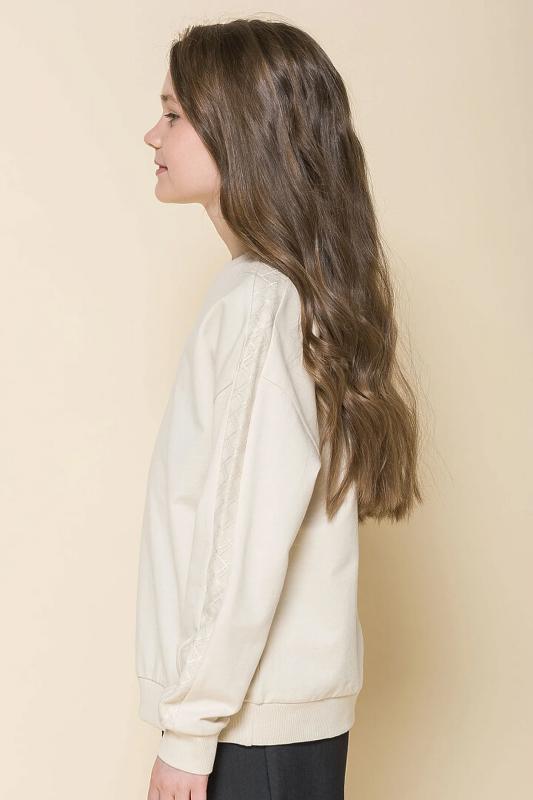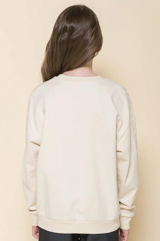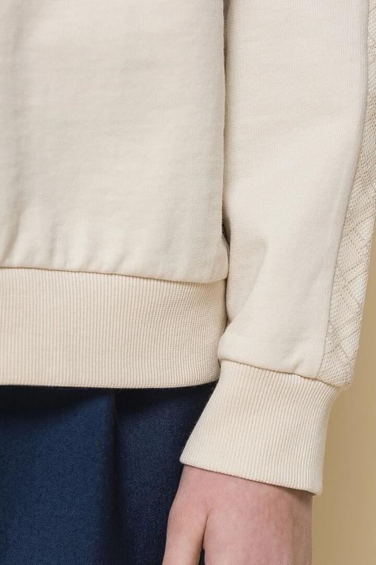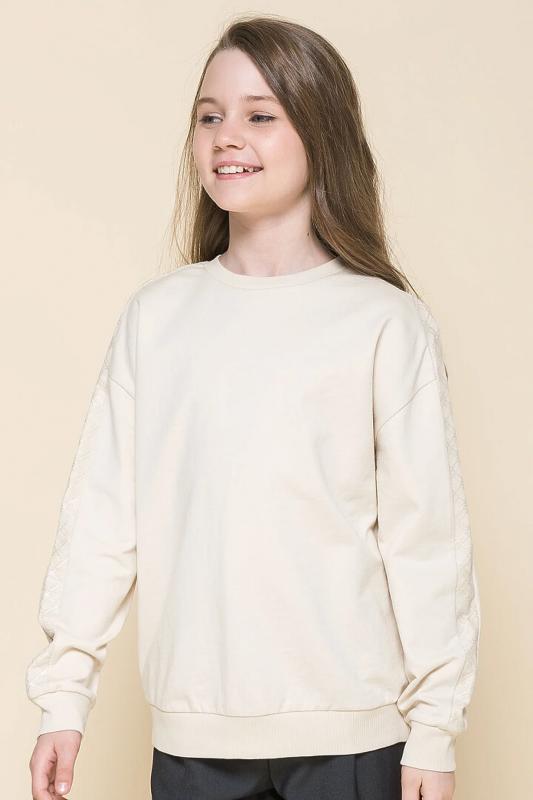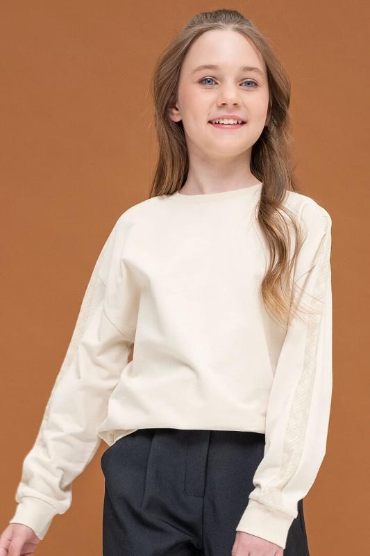 Описание: Модный свитшот из мягкого футера для девочки. 100% хлопок — ткань дышащая, тактильно приятная и комфортная для ребёнка. Объемный крой, спущенное плечо – настоящий трендовый оверсайз. Низ отделан рибаной — слегка собирает изделие, но не фиксирует на бедрах. Манжеты рукавов из рибаны — рукава не сползают, но в то же время есть запас по длине рукава. Модель декорирована изящными кружевными вставками вдоль плечевых швов и рукавов — это делает свитшот элегантным и женственным. Вставки не просвечивают, под ними подкладка из основного материала. Свободный силуэт позволяет брать этот свитшот на вырост — он будет словно «расти» вместе с ребёнком, долго не станет малым. Модный и практичный вариант красивой школьной одежды для девочек. Состав: 100%хлопок, вставка: 92%нейлон 8%эластан"