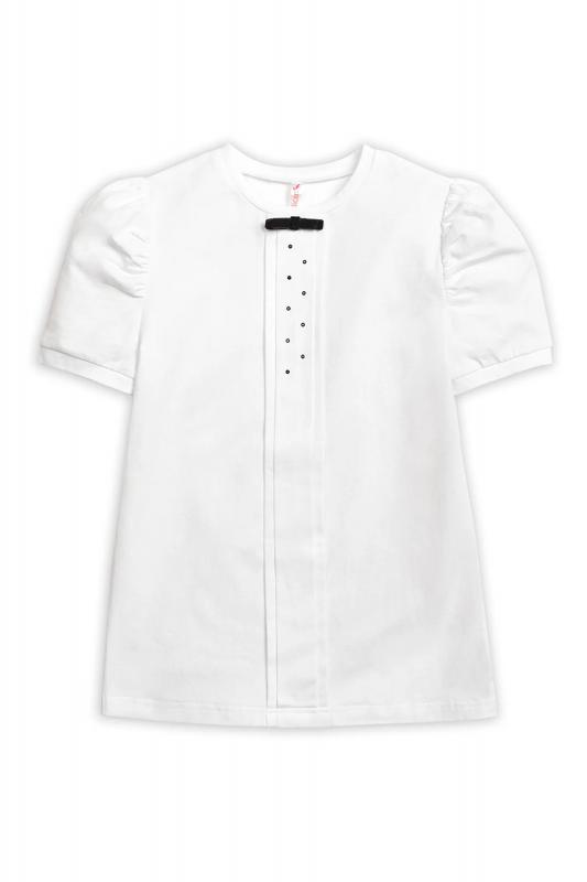 Футболка для девочек из мягкого хлопкового трикотажа с добавлением эластана. Полуприлегающий силуэт, рукава с объемом в верхней части. По центру переда застрочены складки, имитирующие планку. Декор в виде черных страз по центру и аккуратного бархатного бантика.