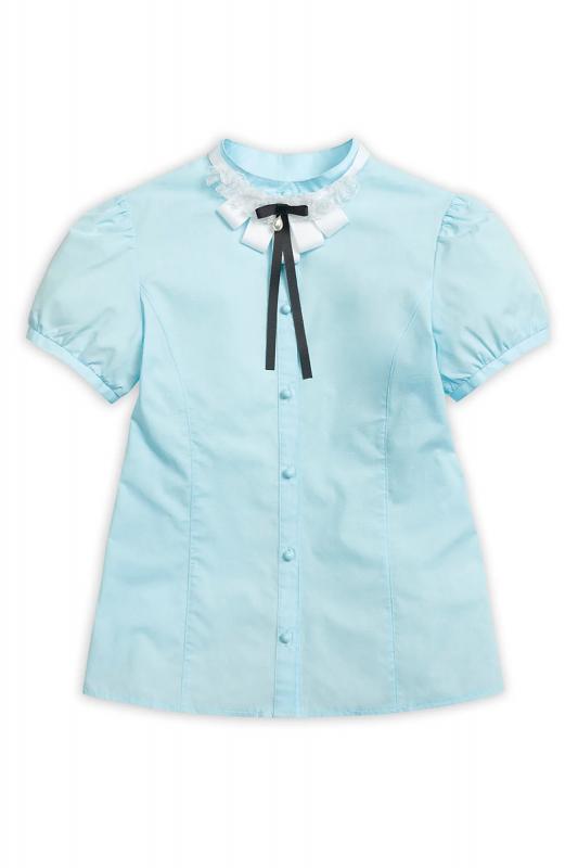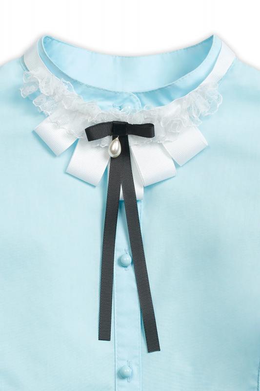 Блузка для девочек с коротким рукавом. Классическая блузка полуприлегающего силуэта с рельефами по переду и спинке. Рукав-фонарик на манжете с пуговкой. Воротник-стойка со шлевками, в которые вставляется съемный сложный декор из репсовых лент, присборенного кружева и изящной жемчужной подвеской. Сзади декор застегивается на кнопку.