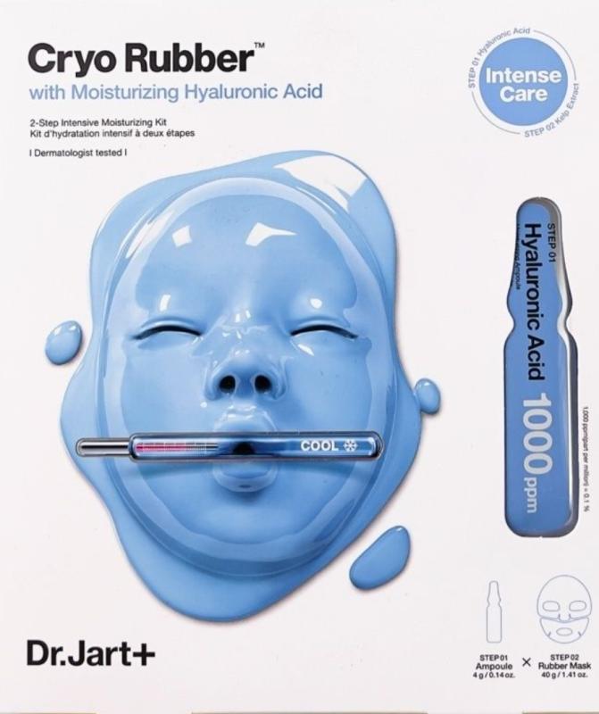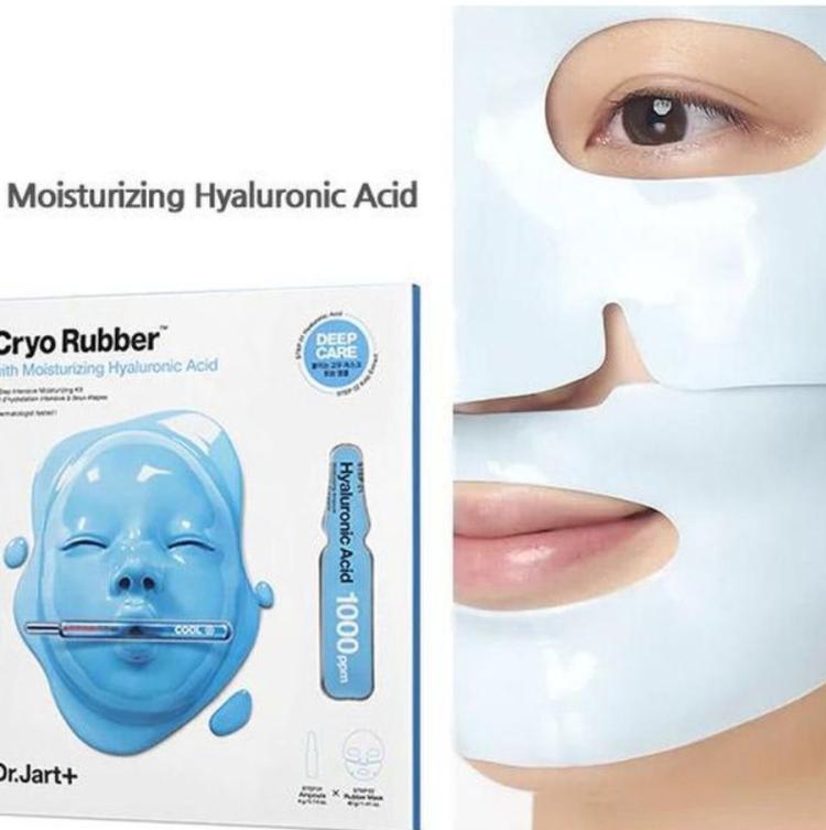 Моделирующая маска для глубокого увлажнения Dr.Jart+ Cryo Rubber with Moisturizing Hyaluronic Acid . Продукт выполнен в форме уже готовой альгинатной маски, которую не нужно смешивать, а достаточно просто поместить на лицо. Средство даёт мгновенный эффект увлажнения, прекрасно устраняет сухость, стянутость и шелушения. Тонизирует, освежает цвет лица и возвращает кожи здоровое сияние. Двухступенчатая система включает в себя высококонцентрированную гидро-эссенцию и маску для увлажнения кожи .