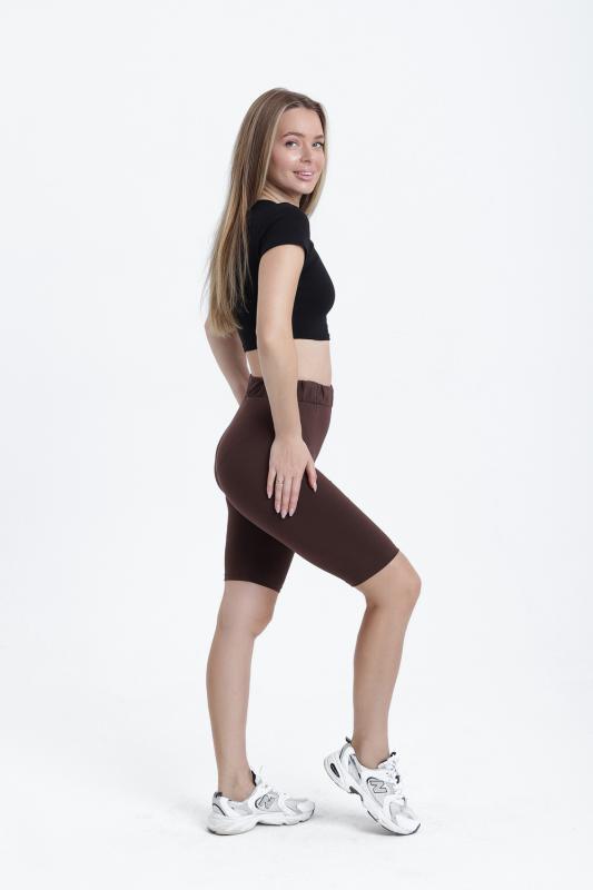 Велосипедки облегающего силуэта, с высокой линией талии. Пояс широкий отрезной с эластичной тесьмой внутри. Нижний срез обработан швом вподгибку.