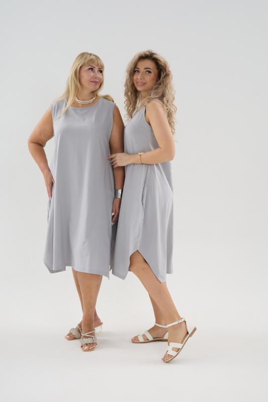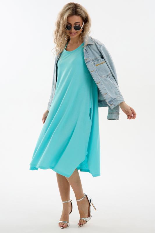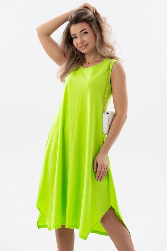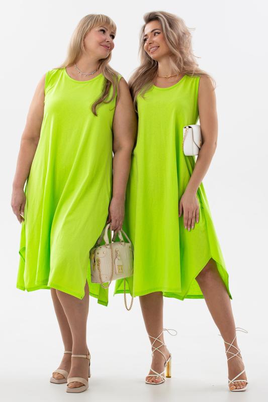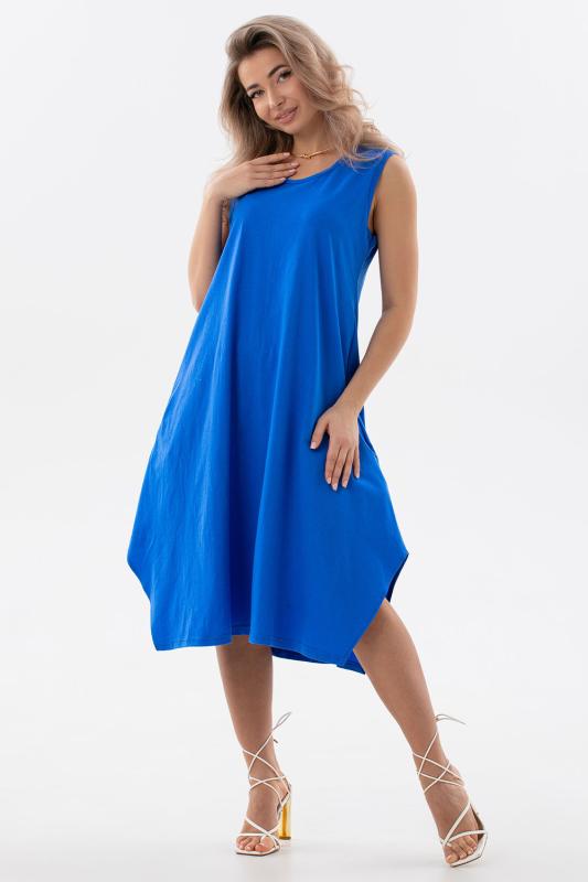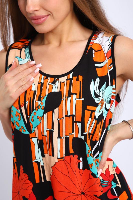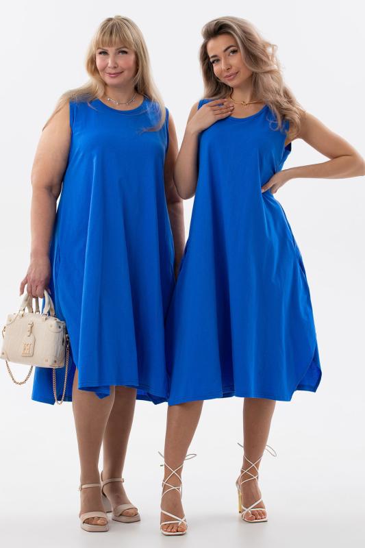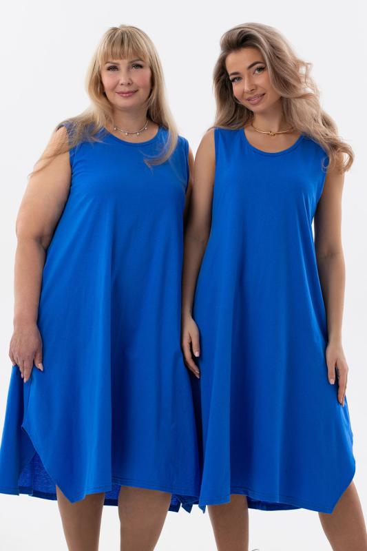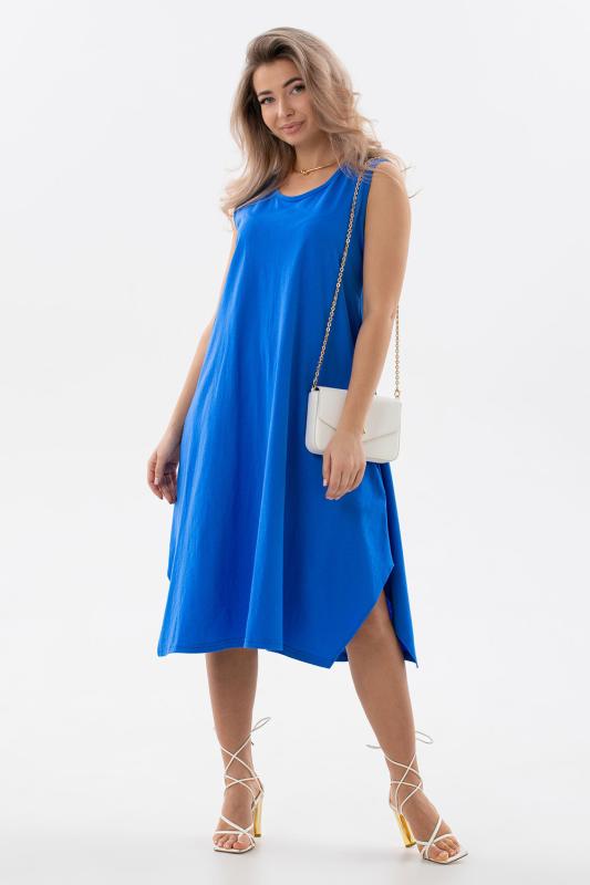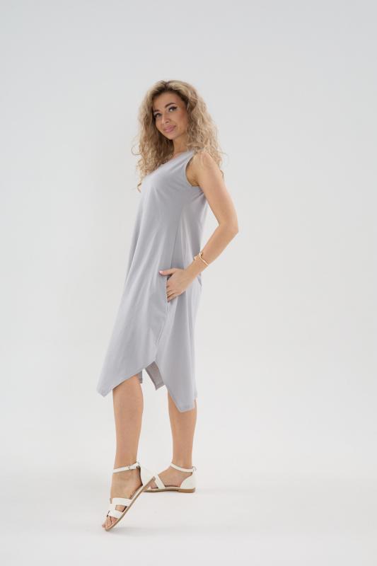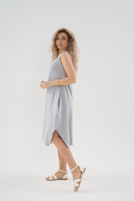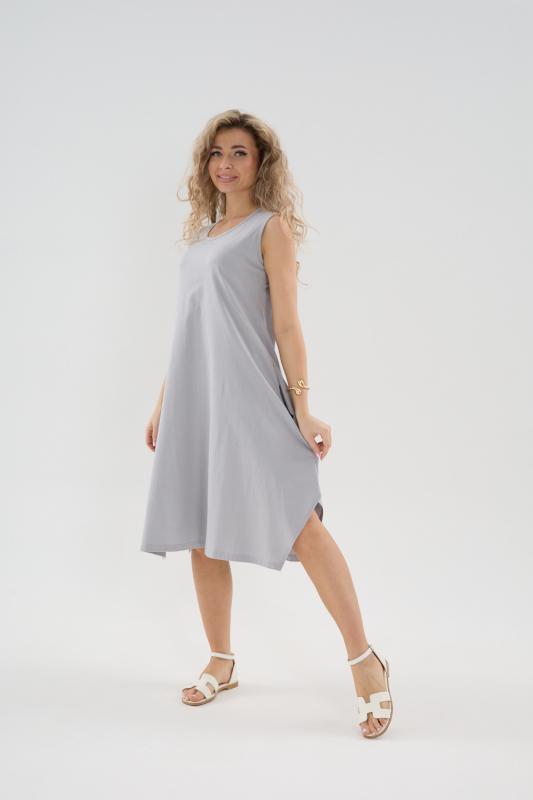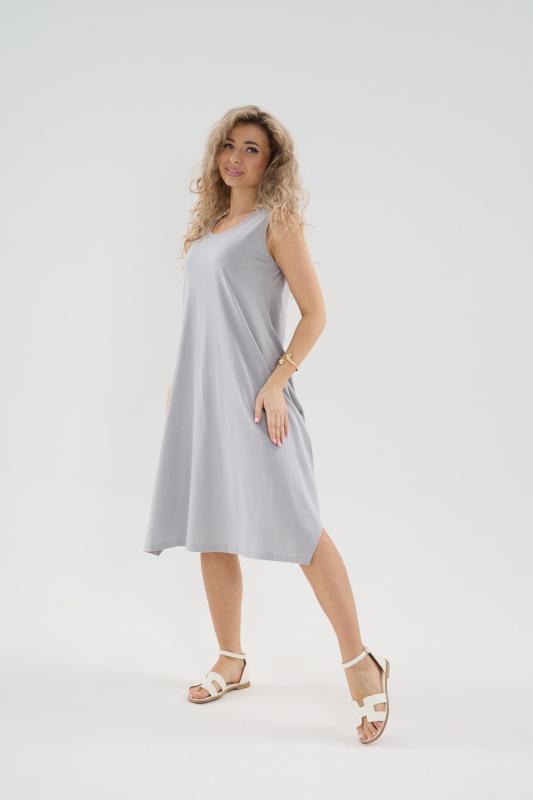 Сарафан женский выполнен из трикотажного полотна кулирка. Сарафан свободного силуэта, по низу изделия выполнены разрезы. Горловина и пройма окантованы.