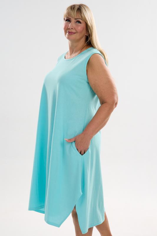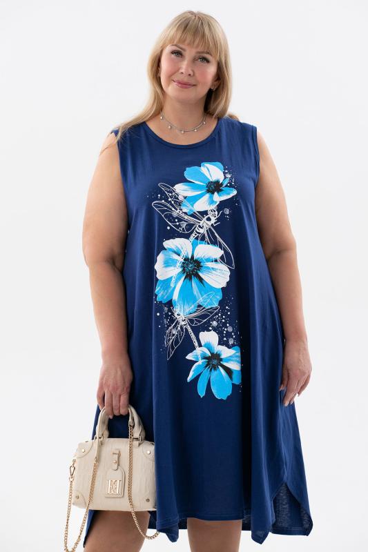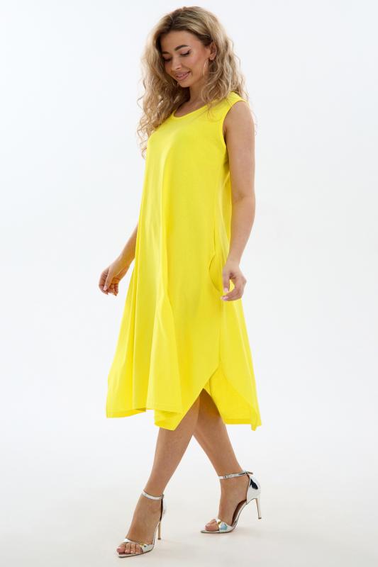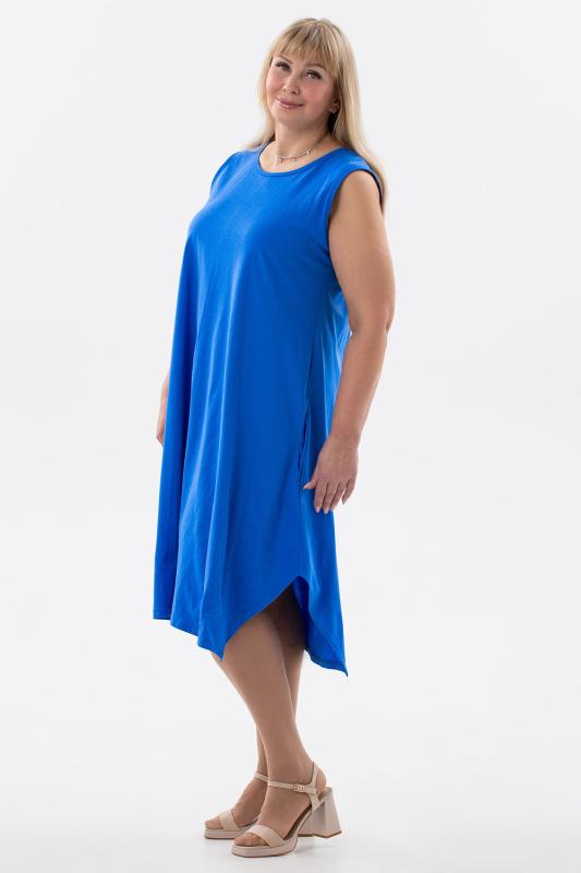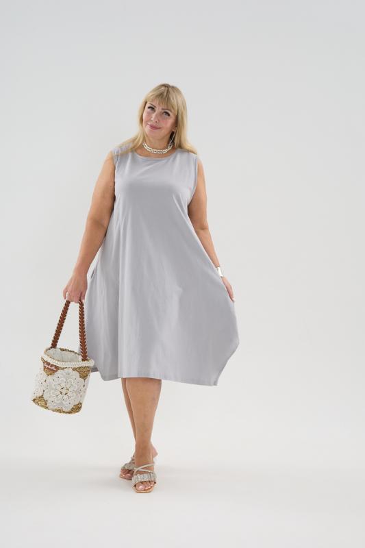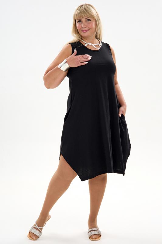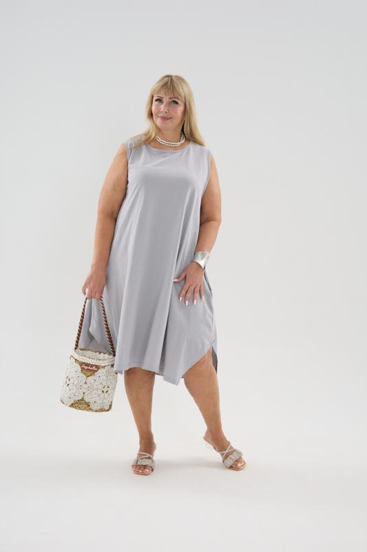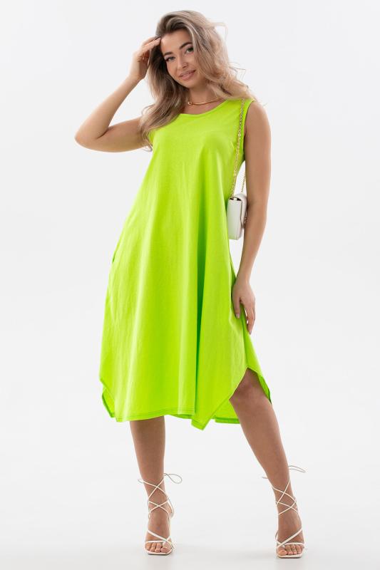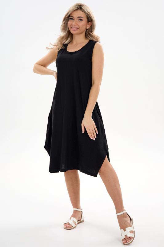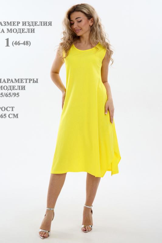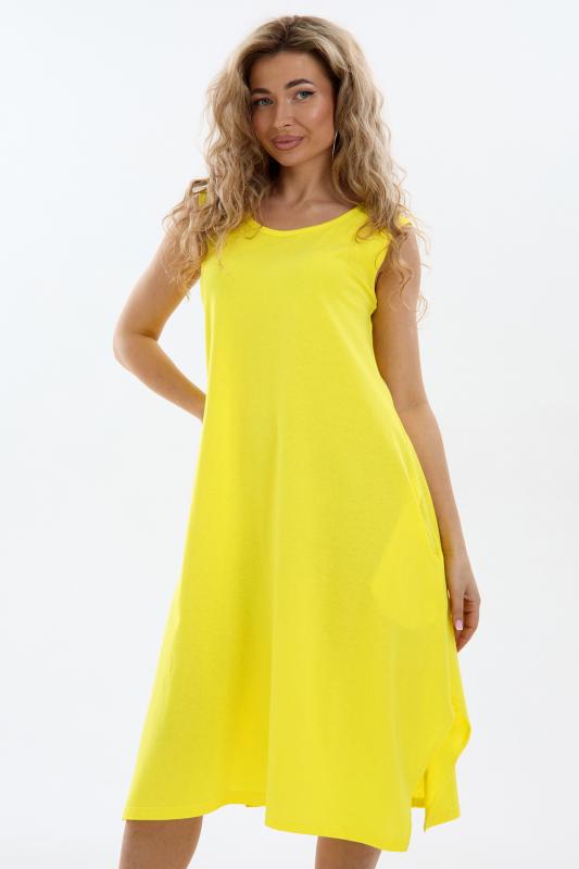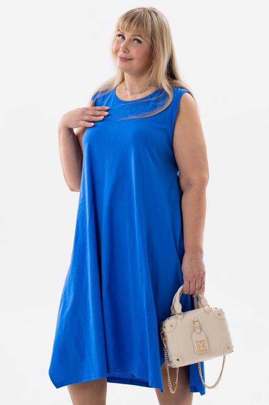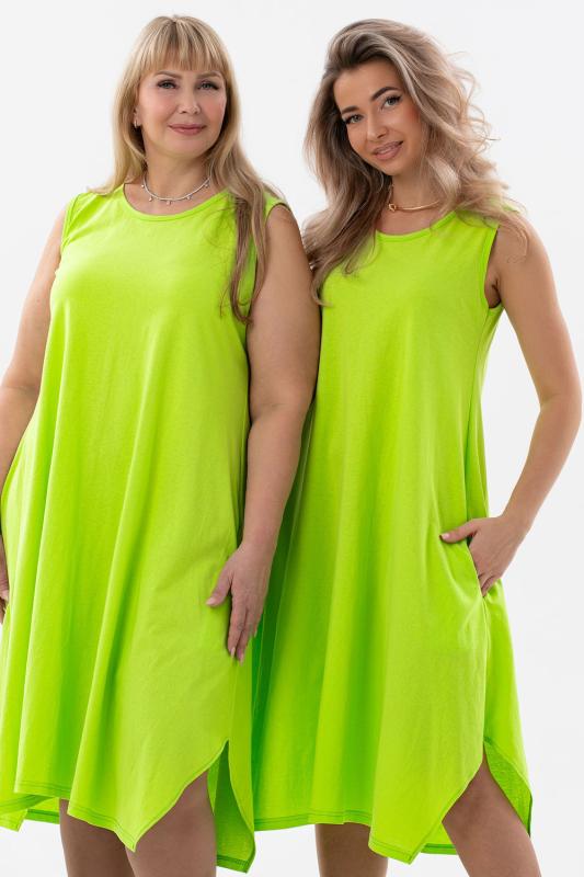 Сарафан женский выполнен из трикотажного полотна кулирка. Сарафан свободного силуэта, по низу изделия выполнены разрезы. Горловина и пройма окантованы.