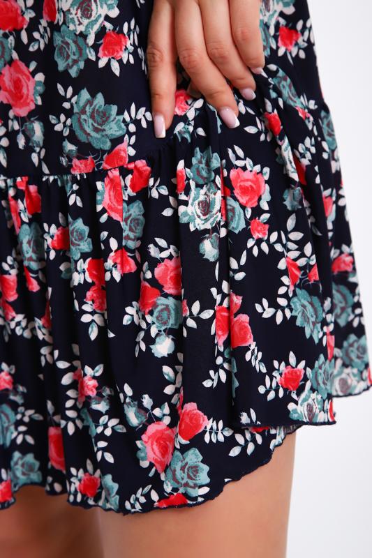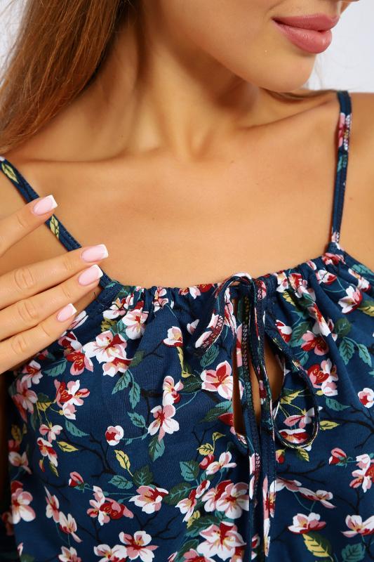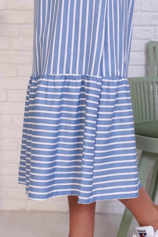 Летний трикотажный сарафан свободного кроя. Длина выше колена. Вырез круглой горловины со сборкой отделан бейкой из основной ткани. Плечевые завязки свободно регулируются. Низ изделия отделан широкой оборкой