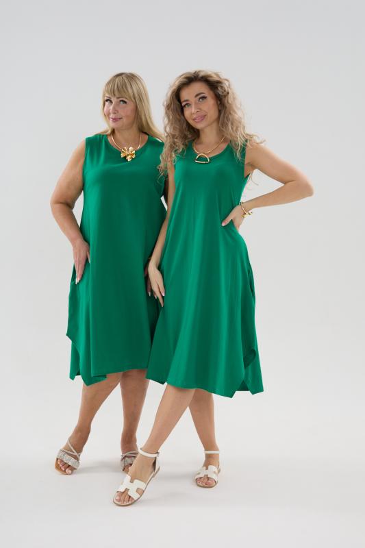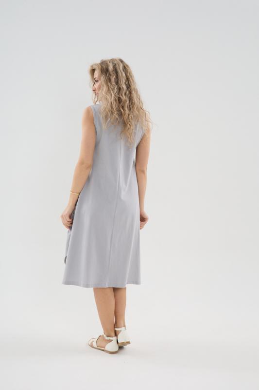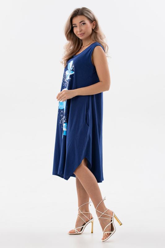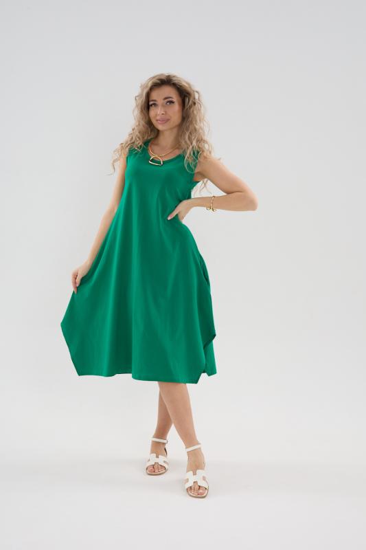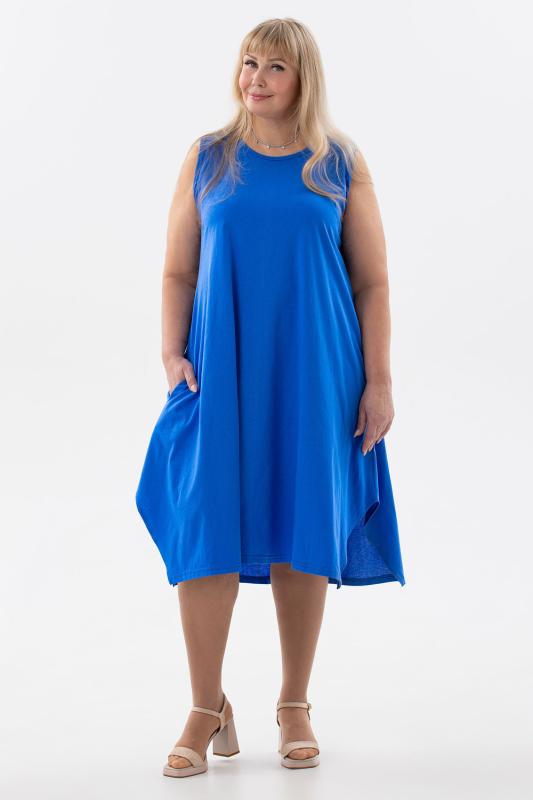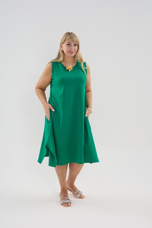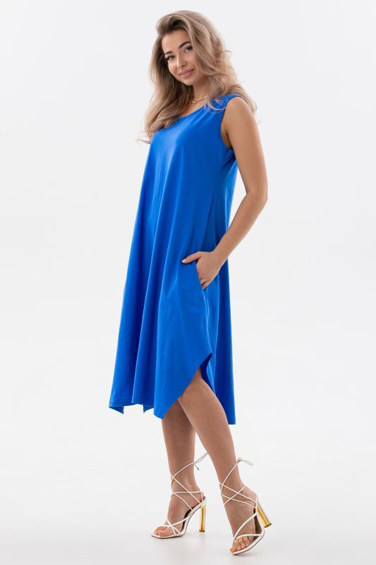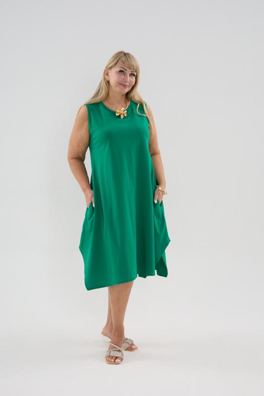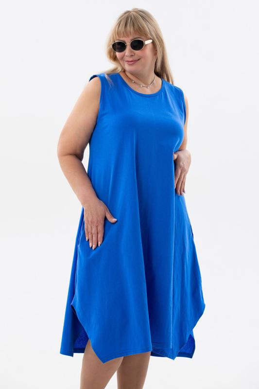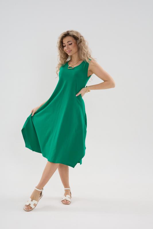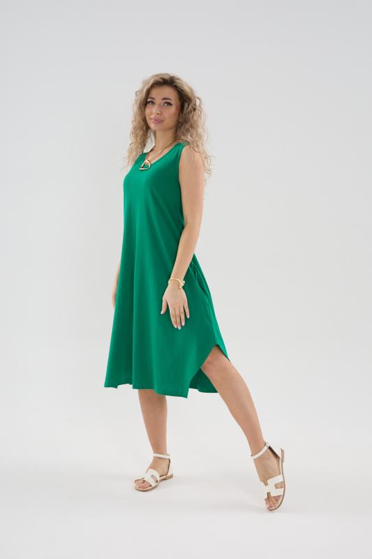 Сарафан женский выполнен из трикотажного полотна кулирка. Сарафан полуприлигающего силуэта, расширенный к низу. Без рукава, прорезные карманы в боковых швах. Горловина, пройма, вход в карман окантованы отделочной ткань. Разрезы в боковых швах, длина ниже колена.