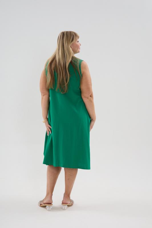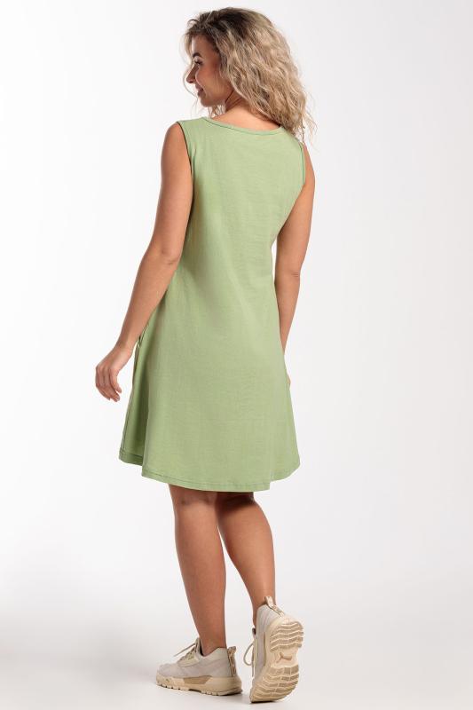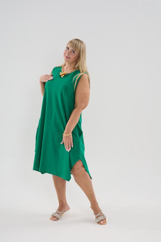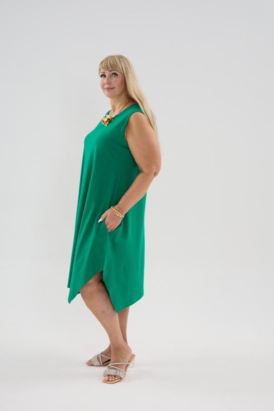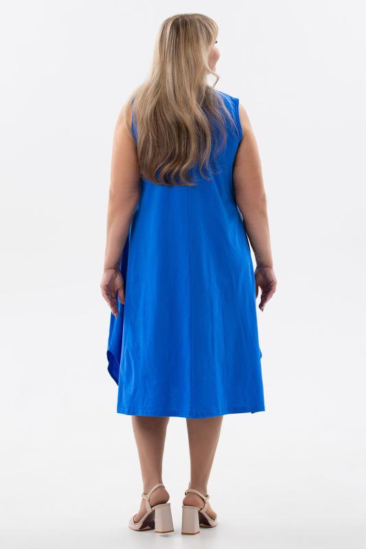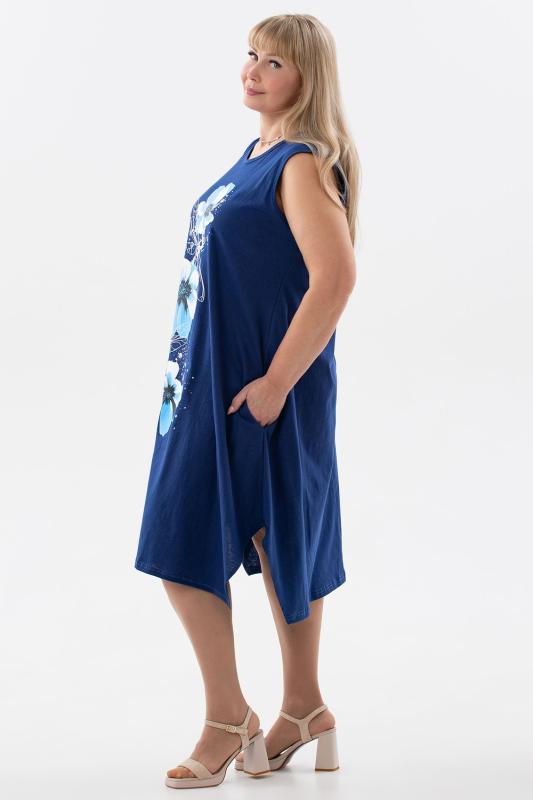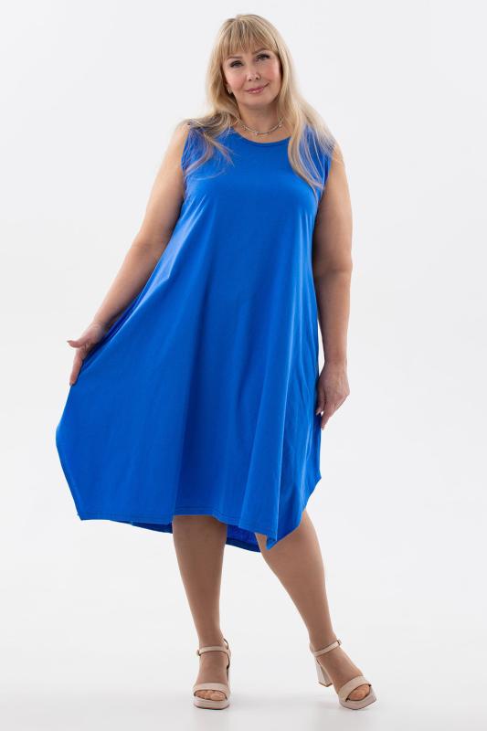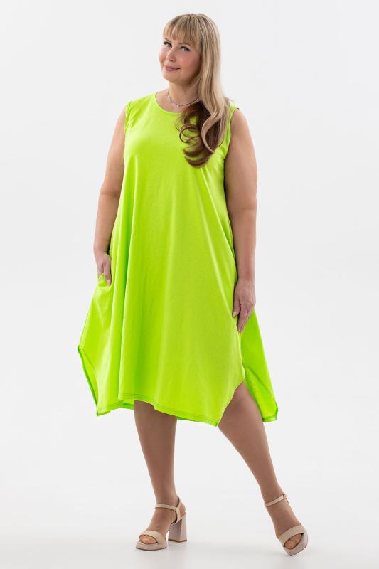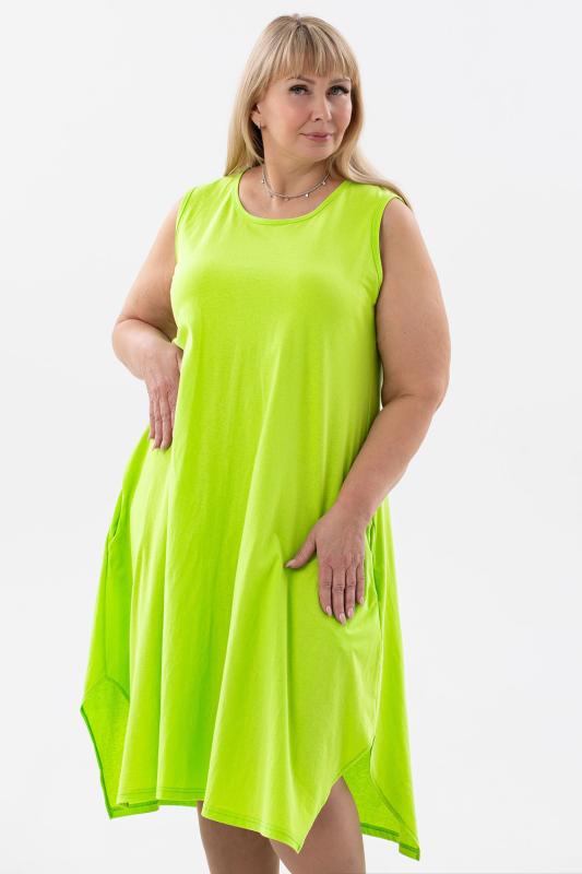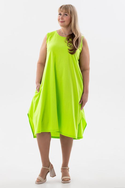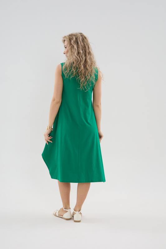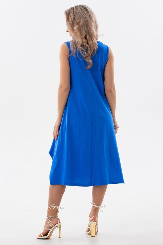 Сарафан женский выполнен из трикотажного полотна кулирка. Сарафан полуприлигающего силуэта, расширенный к низу. Без рукава, прорезные карманы в боковых швах. Горловина, пройма, вход в карман окантованы отделочной ткань. Разрезы в боковых швах, длина ниже колена.