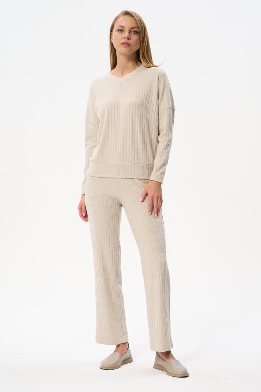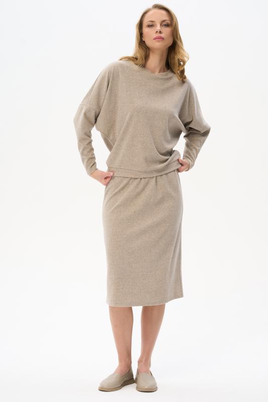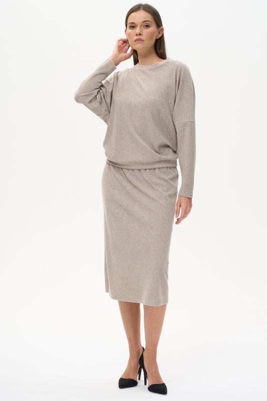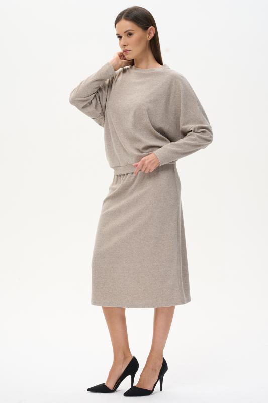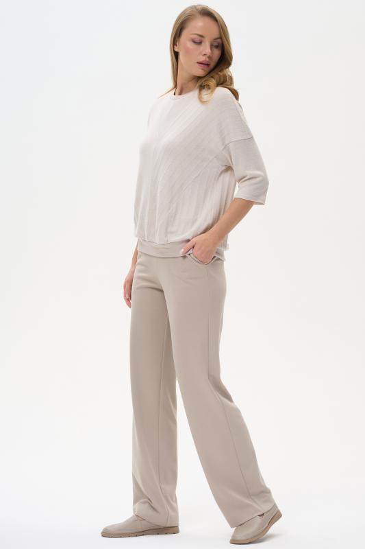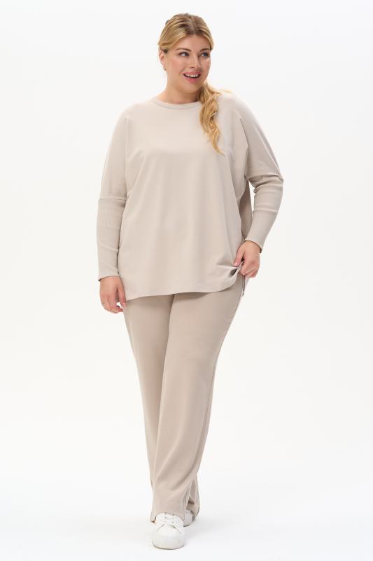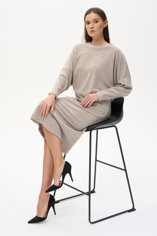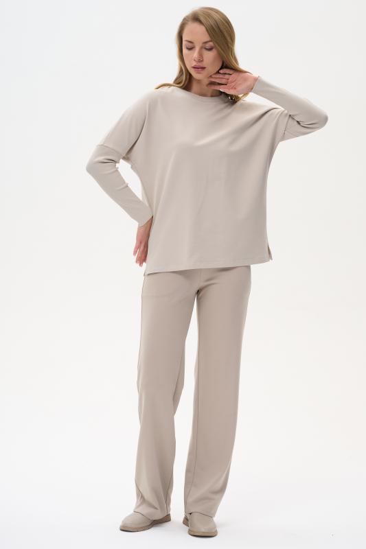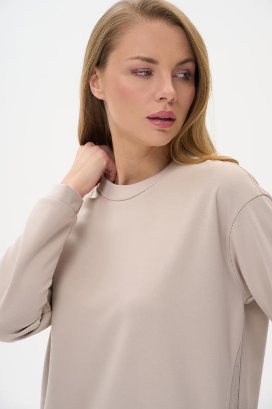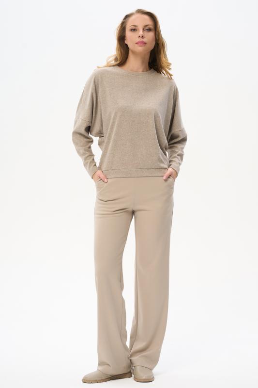 Элегантный джемпер в стиле 80-х, с заниженной проймой, почти от талии. Рекомендуем дополнить образ юбкой из такого же полотна, либо брюками из футера бежевого цвета.