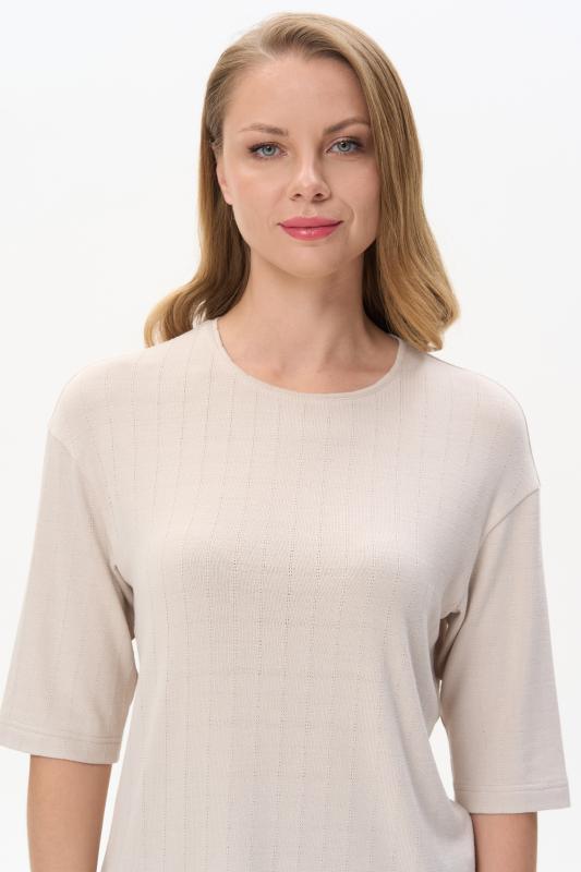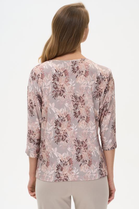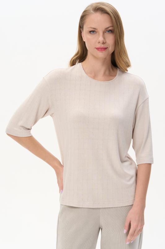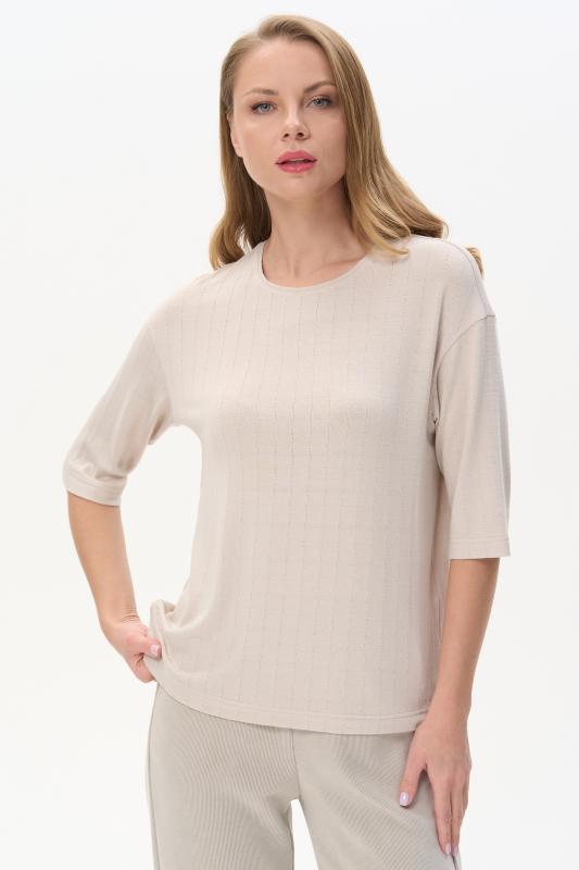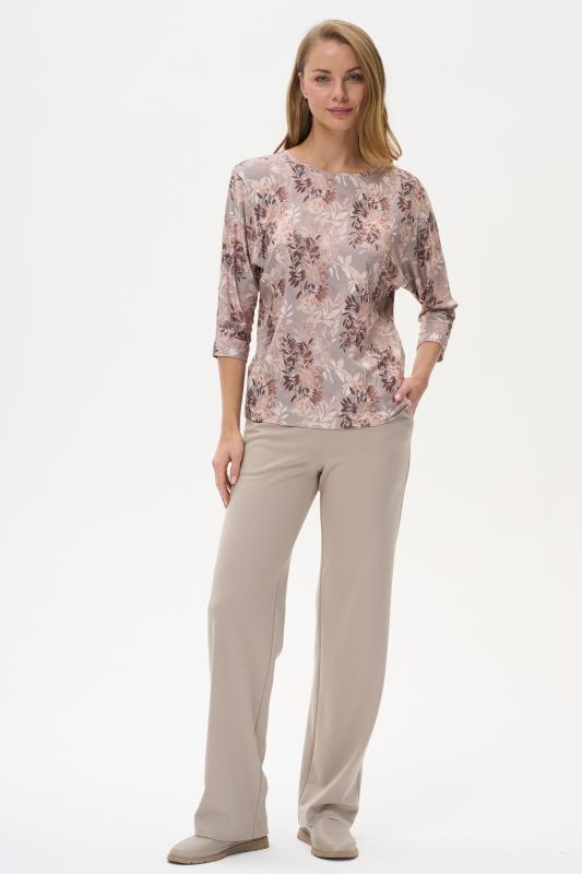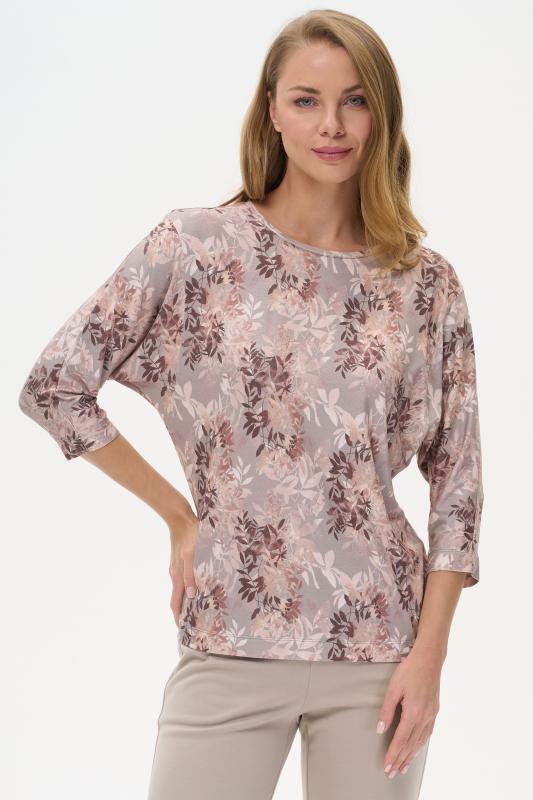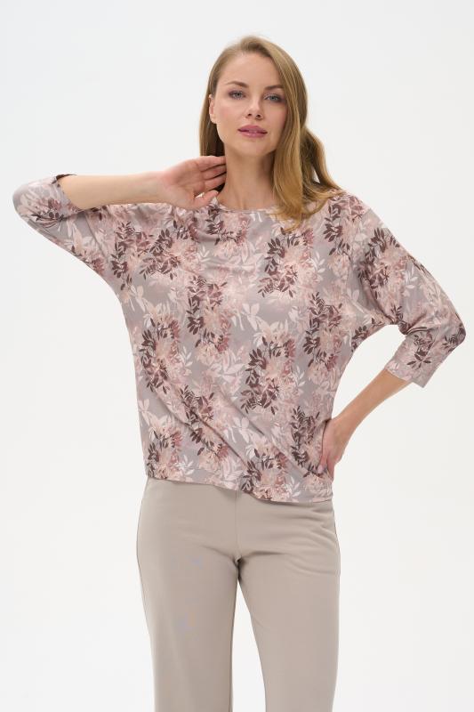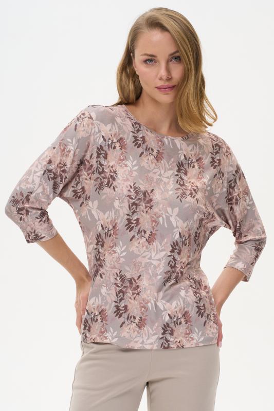 Блузка из вискозного трикотажного полотна с эластаном с эффектной цифровой печатью. Вырез округлой формы. Комбинированный крой рукава: по полочке - цельнокроенный (летучая мышь), по спинке - со швом. Длина рукава 34. Рост модели 175 см.