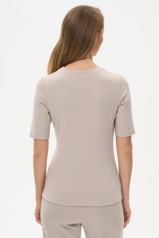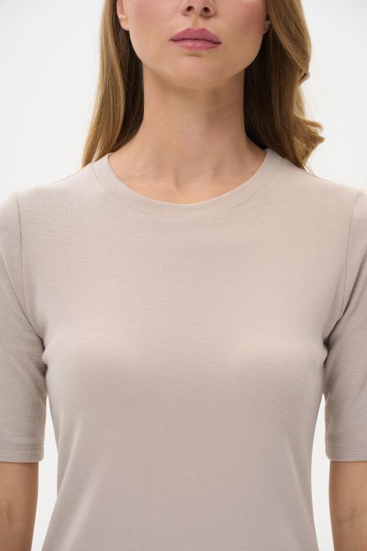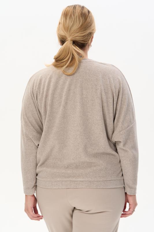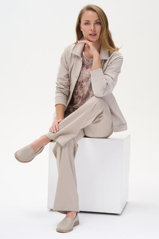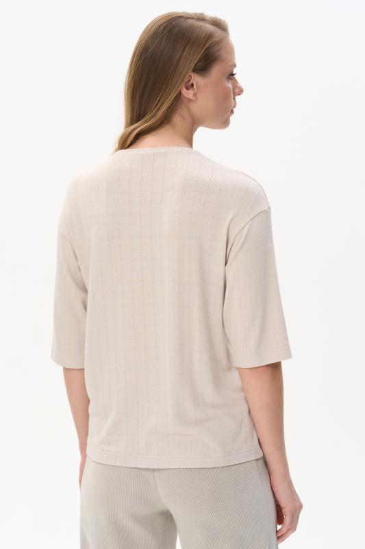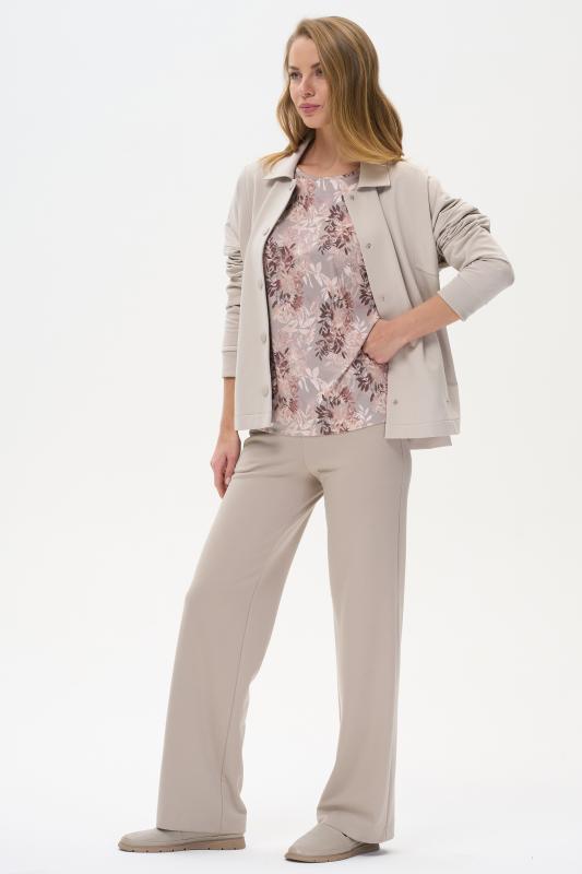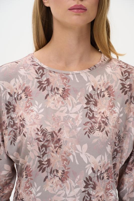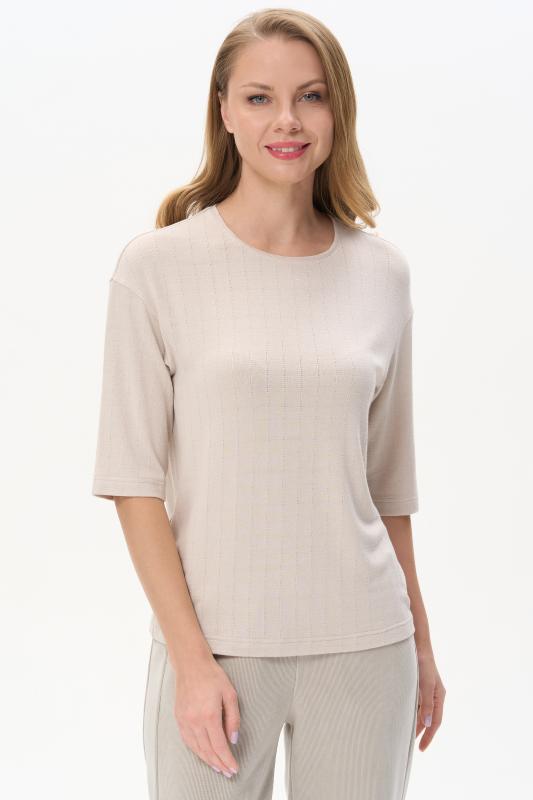 Блузка из вискозного трикотажного полотна с эластаном с эффектной цифровой печатью. Вырез округлой формы. Комбинированный крой рукава: по полочке - цельнокроенный (летучая мышь), по спинке - со швом. Длина рукава 34. Рост модели 175 см.