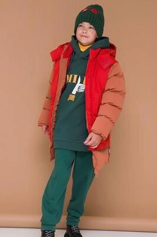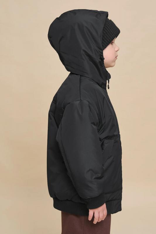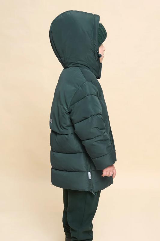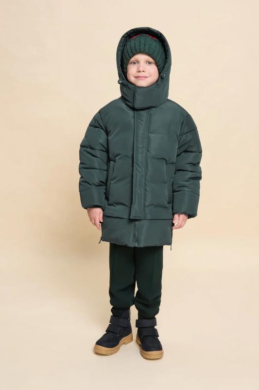 Куртка зимняя для мальчика. Модель прямого силуэта, объем - умеренный оверсайз. Куртка гладкая, без стёжки — суперактуальный тренд сезона. При этом утеплитель простёган внутри изделия — он равномерно распределён и надёжно зафиксирован. На внешнюю поверхность материала нанесена водоотталкивающая пропитка (DWR), она задерживает грязь и влагу снаружи — ребёнок не промокнет от снега, а комбинезон легко отстирается. Также есть дополнительная пропитка на внутренней стороне ткани — для более надёжной защиты от промокания. Капюшон с двумя швами, что обеспечивает анатомически правильную форму и комфортную посадку по голове. Легко одевается на шапку. Высокое забрало капюшона защищает шею и лицо от холода и ветра. Горло закрыто, шарф не нужен. Объём капюшона регулируется эластичным шнуром со стопперами. Центральная застёжка на пластиковую тракторную молнию, разъёмную с двух сторон — удобно садиться, пуллеры металлические, прочные. Сверху планка на велькро (липучках) — быстро застёгивается и расстёгивается. Куртка тепла