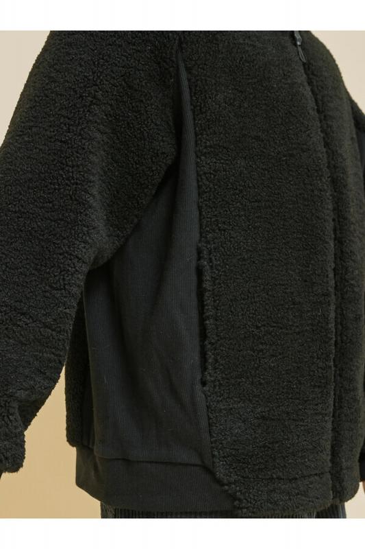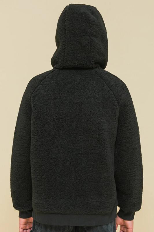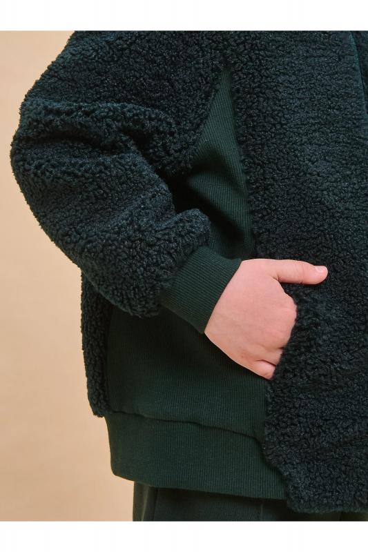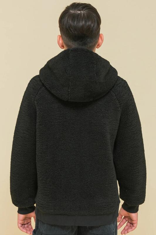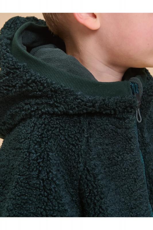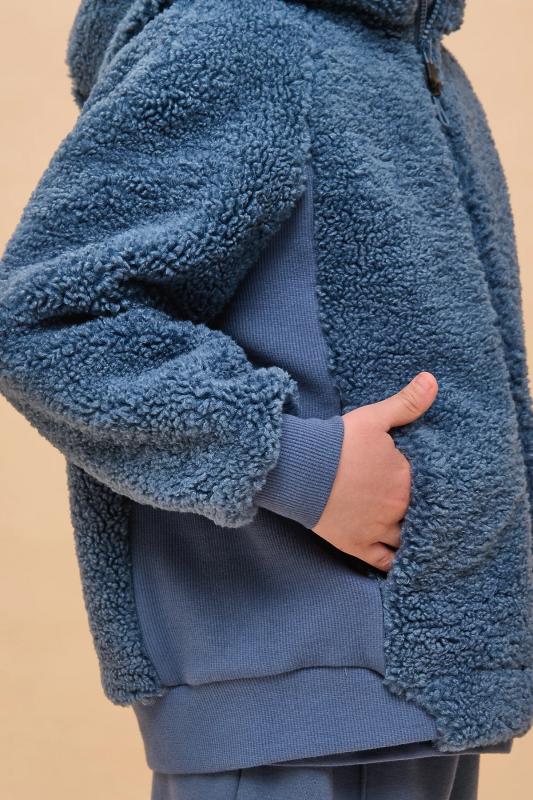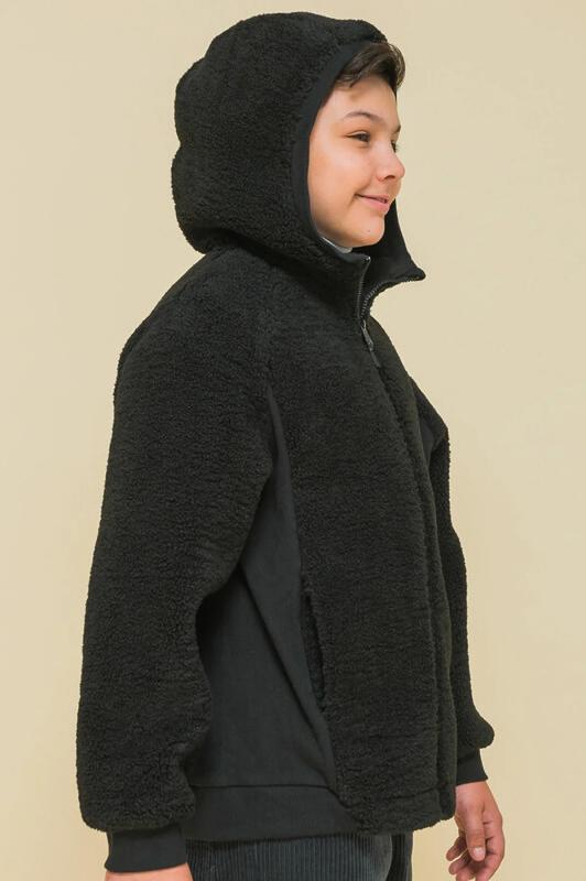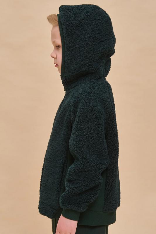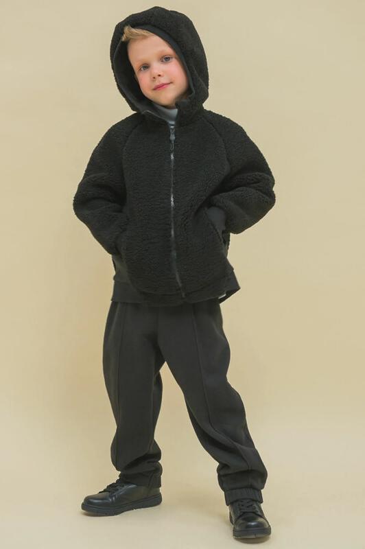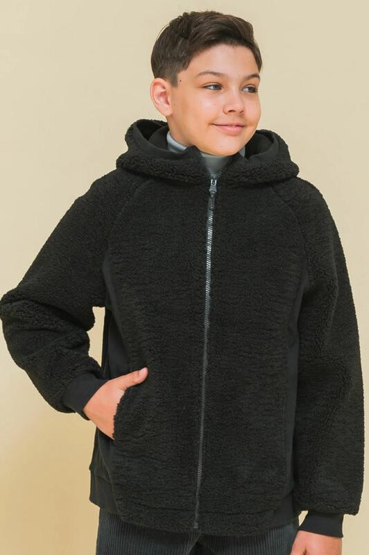 Детская куртка на мальчика выполнена из мягкого бербер-флиса (фактура «барашка»). Куртка актуального оверсайз-силуэта с рукавами кроя реглан подарит ребёнку комфорт и не будет сковывать его движений. По бокам оригинальные вставки из плотной эластичной рибаны. Сочетание материалов с разной фактурой — один из трендов сезона. Капюшон защищает ребёнка от холода и ветра. Оверсайз-куртка удобно застёгивается на молнию по переду, вверху молнии ограничитель для безопаного застёгивания. В швах по переду расположены боковые карманы. Окантовка капюшона, манжеты рукавов и частично манжета по низу изделия выполнены из эластичной рибаны — она на 95% состоит из качественного хлопка. Эластан помогает рибане не растягиваться, сохранять отличную форму долго. Худи однотонное, без принта. Модель неприхотлива в уходе. Одежда из флиса тёплая, лёгкая, мягкая, просто стирается и быстро сохнет, не выгорает и не скатывается, сохраняет прекрасную форму надолго. Толстовка детская выполнена в универсальном чёрном цвете. Она отлично соче