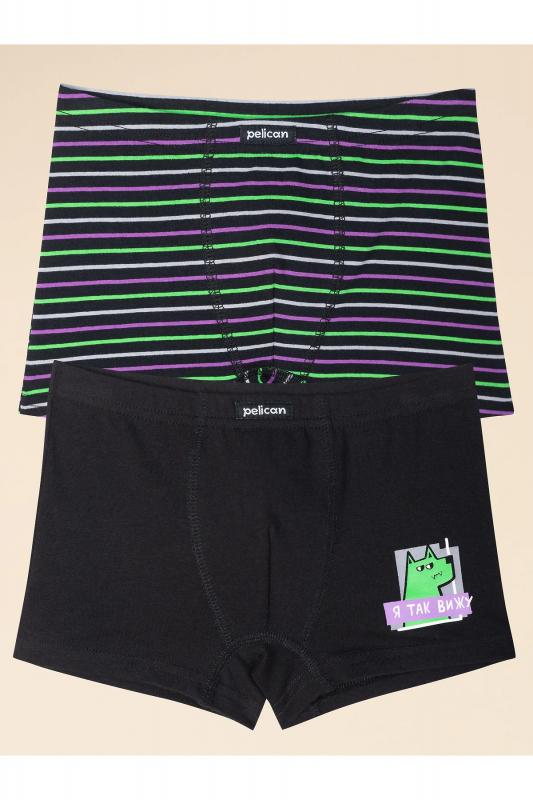 Если вы находитесь в поисках качественного и удобного белья для своего ребёнка, обратите внимание на наш комплект трусов для мальчика (2 шт.). Классические боксеры выполнены из ткани с высоким содержанием хлопка — изделие мягкое, прекрасно пропускает воздух, позволяя коже ребёнка дышать. Эластан обеспечивает эластичность и помогает белью сохранять отличную форму в течение долгого времени, даже после многочисленных стирок. Качественная ткань и анатомически правильный крой гарантируют комфортную посадку белья на теле — ребёнку удобно на протяжении всего дня. В поясе мягкая широкая резинка — не давит и не перекручивается. Трусы детские для мальчика представлены в двух вариантах расцветки: чёрные в фиолетово-зелёную полоску и чёрные с небольшим принтом в виде зелёной собаки и надписи "