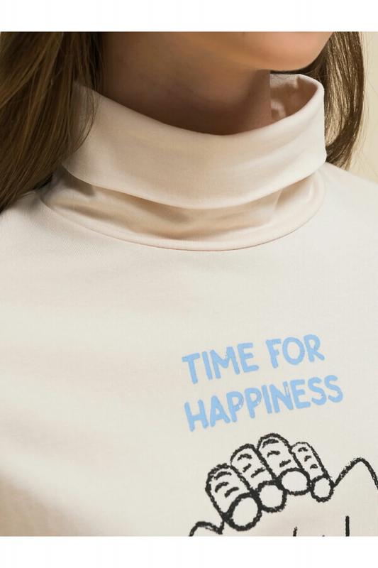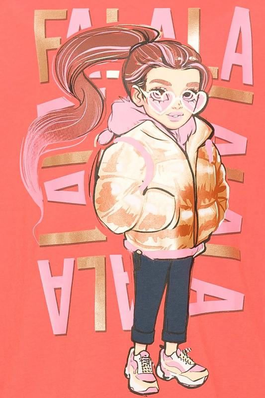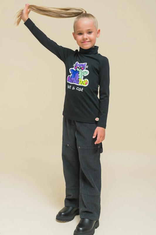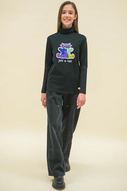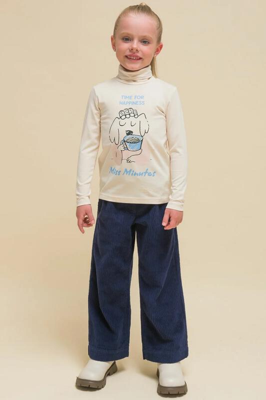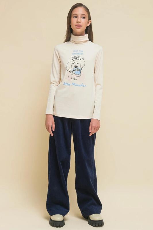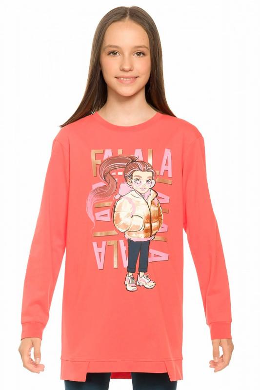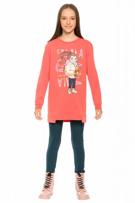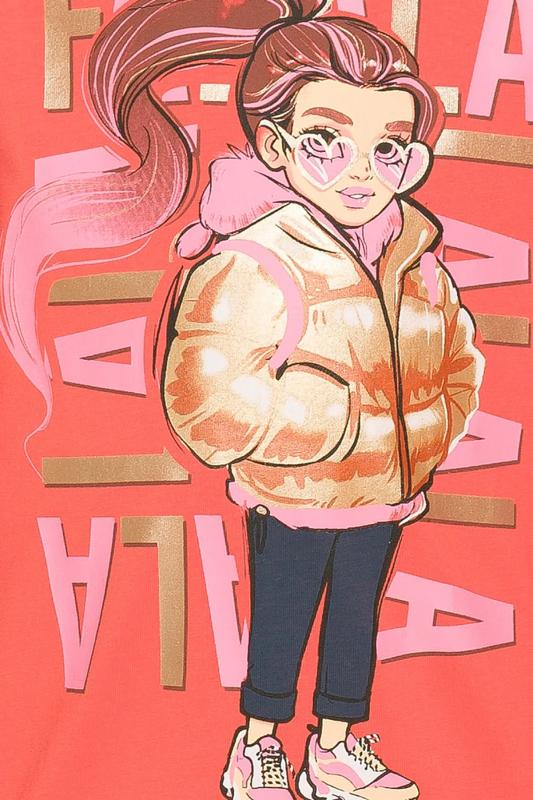 Комплект для девочек туника и лосины. Туника О силуэта со слегка спущенным плечом и манжетами из основной ткани. Низ изделия обработан двумя разноуровневыми манжетами. Принт стилизованный прототип героини истории. Вот она в кроссах, джинсах и металлизированной куртке. Копирайт с золотым металликом ФАЛАЛА. Классические длинные лосины.