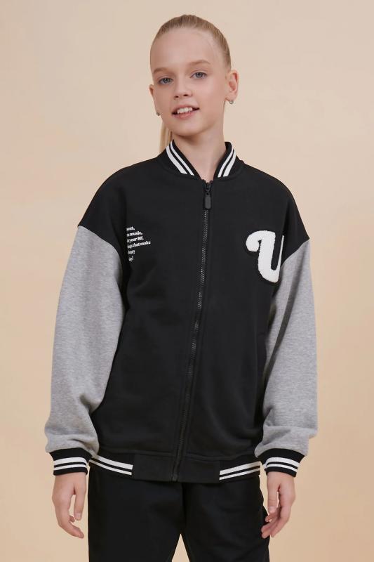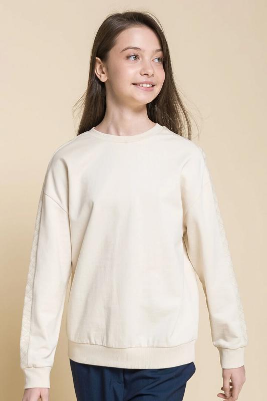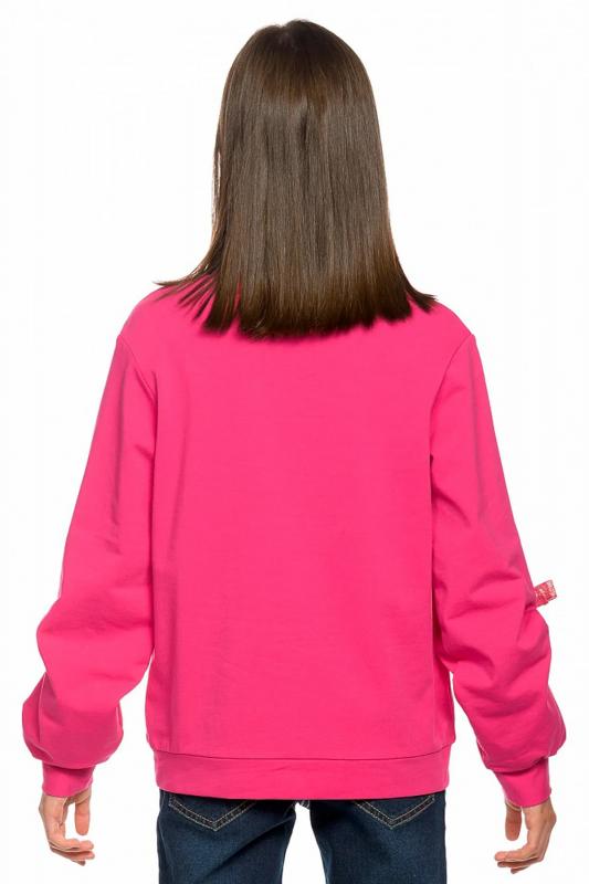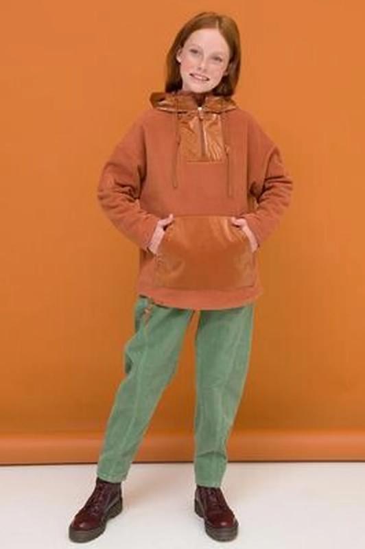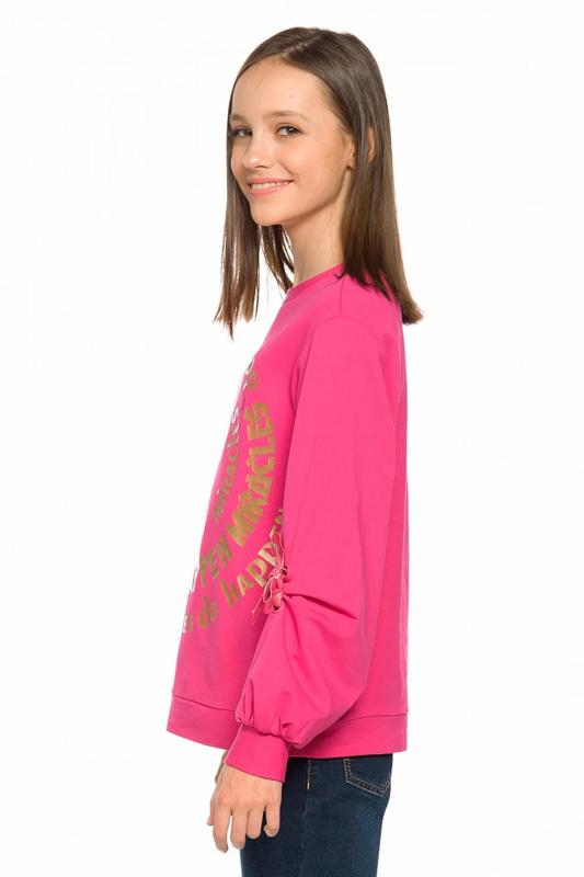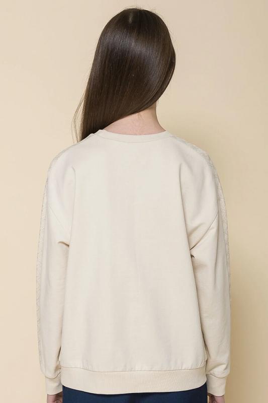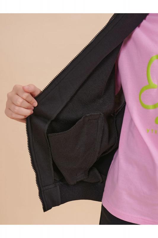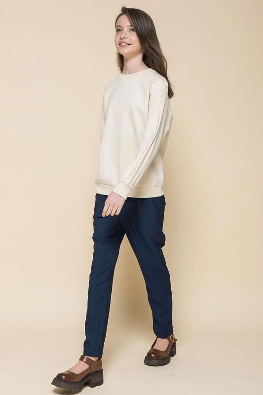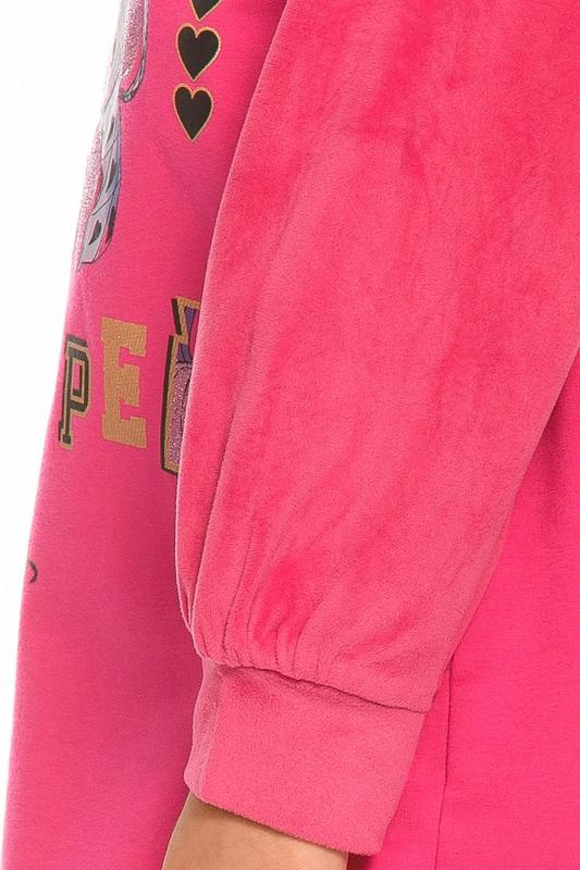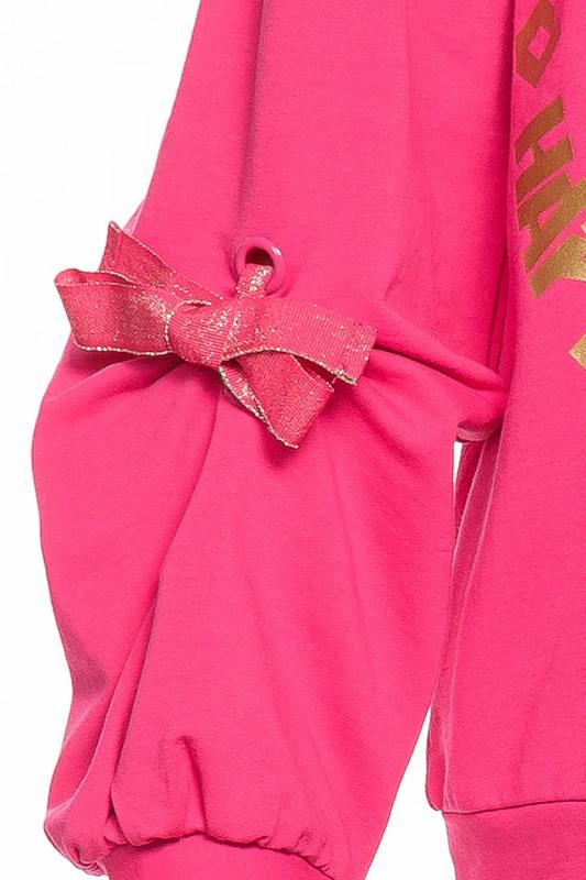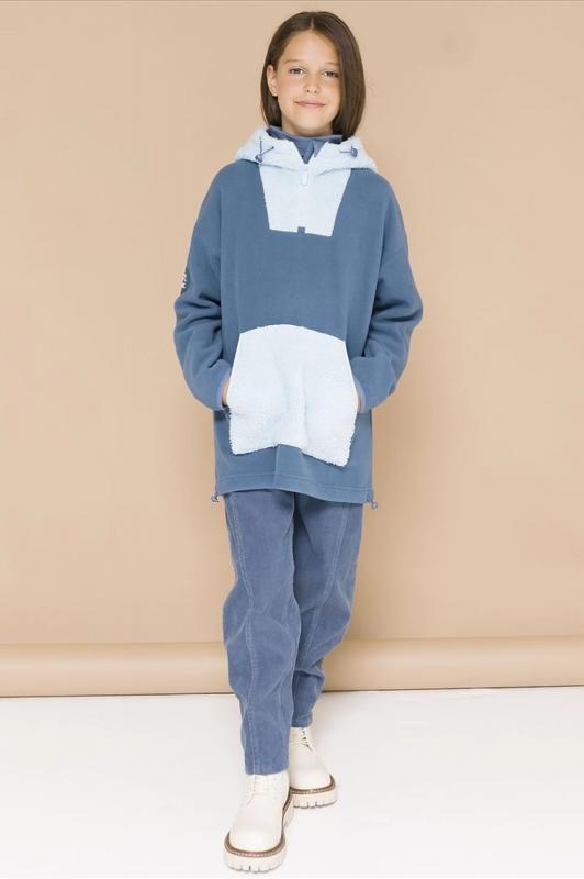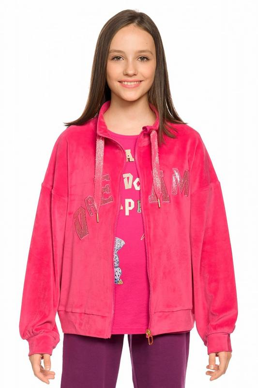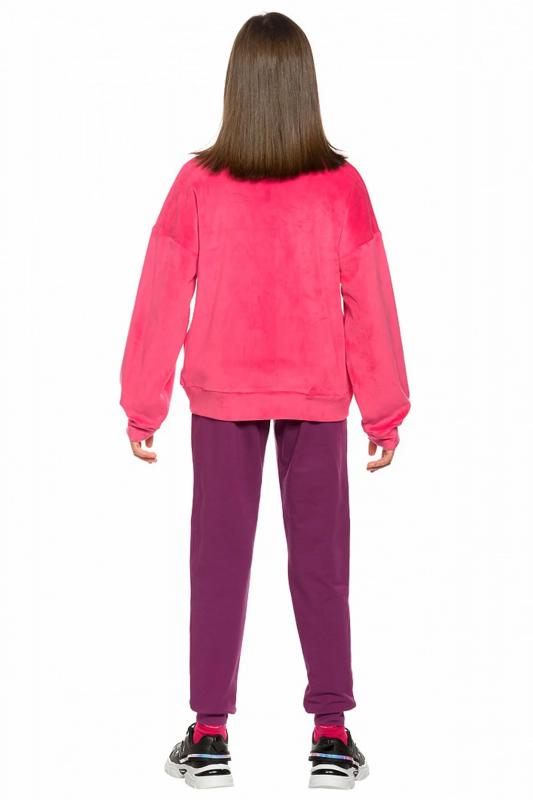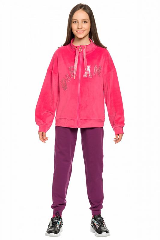 Комплект для девочек толстовка и брюки. Толстовка оверсайз силуэта из велюрового трикотажного полотна с перламутровым отливом. Слегка расширенный рукав собран на манжету из основной ткани. Воротник стойка с большими металлическими люверсами и декоративными лентами с люрексом и металлическими наконечниками. Застёжка на тракторную молнию с металлическим пуллером. По переду аппликация из пайеток. Перевод Мечта. Брюки из футера на манжете из рибаны актуального увеличенного объема без защипов. Пояс из основной ткани с эластиком внутри и дополнительной регулировкой объема шнурком.