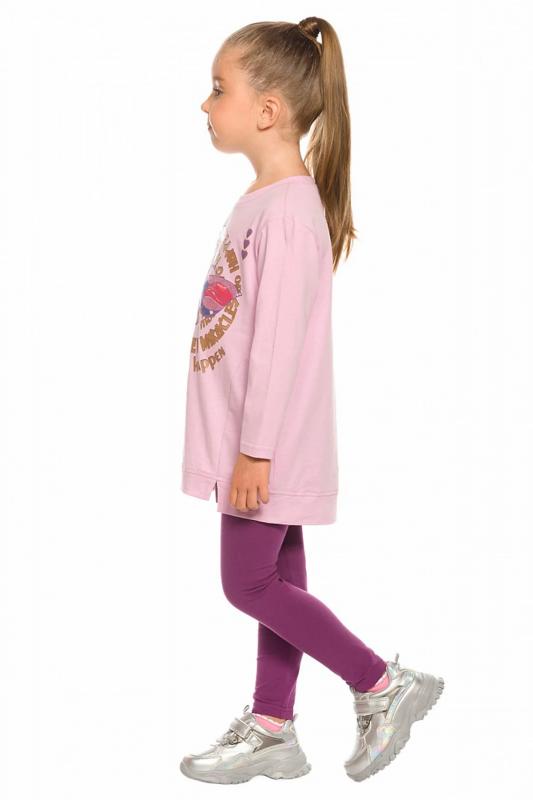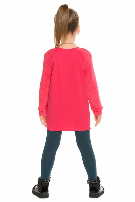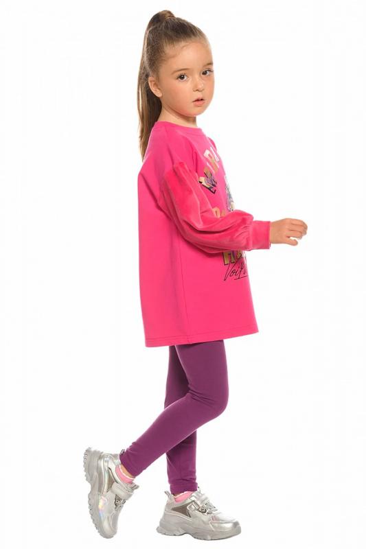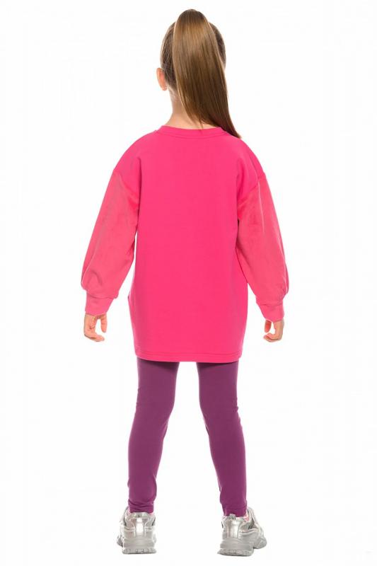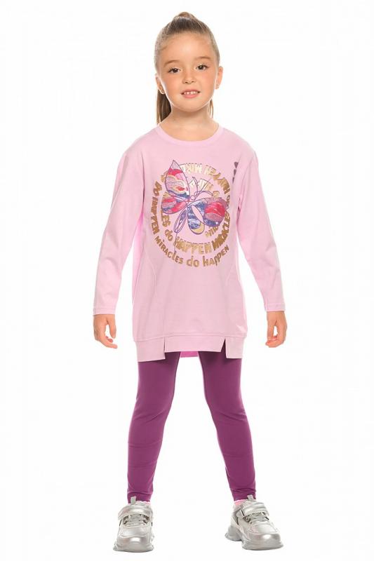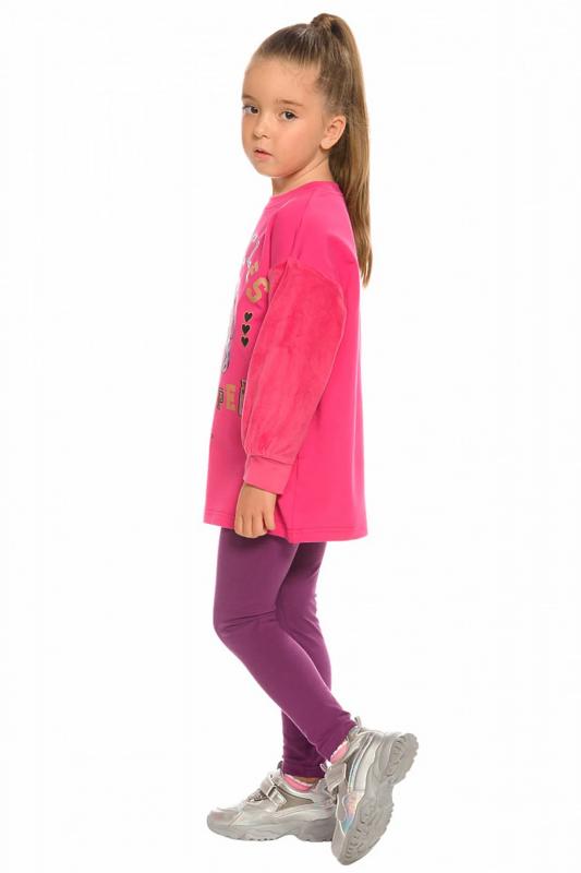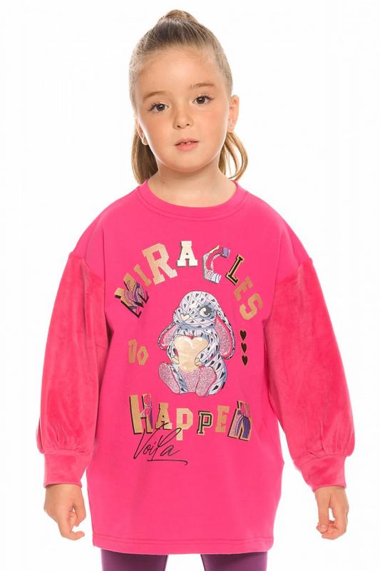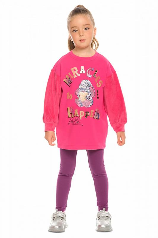 Комплект для девочек туника и лосины. Туника мягкого оверсайз силуэта со спущенной линией плеча. Перед и спинка из футера, рукава из мягкого плюшевого велюра с перламутровым отблеском. Эластичный rubber принт с золотым металликом и глиттером. Надпись Чудеса случаются. Вуаля. Низ Классические лосины из футера с начесом.