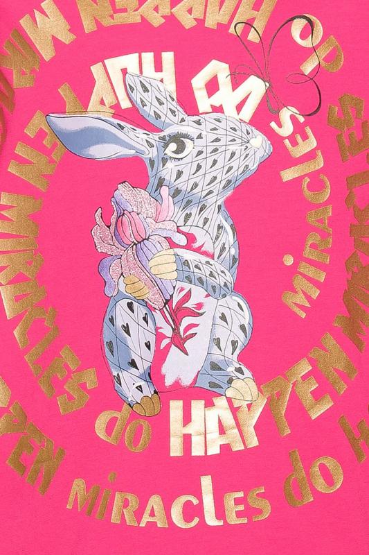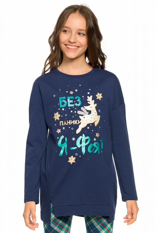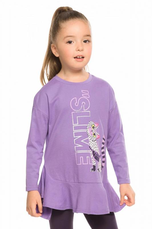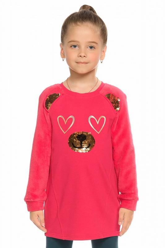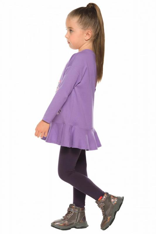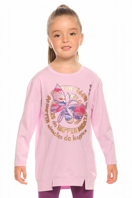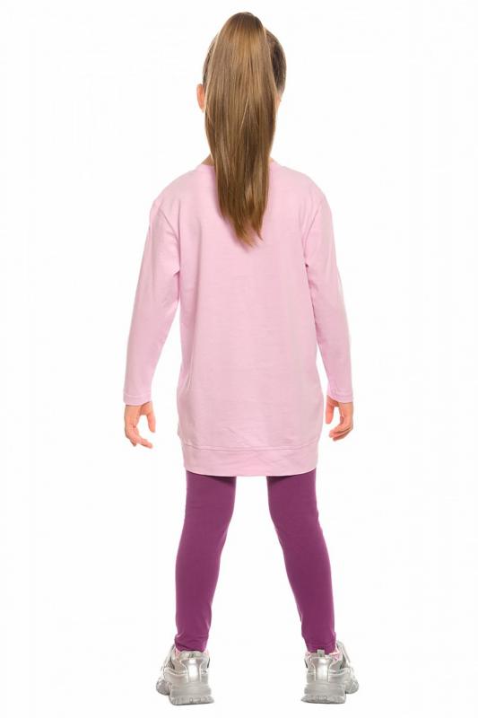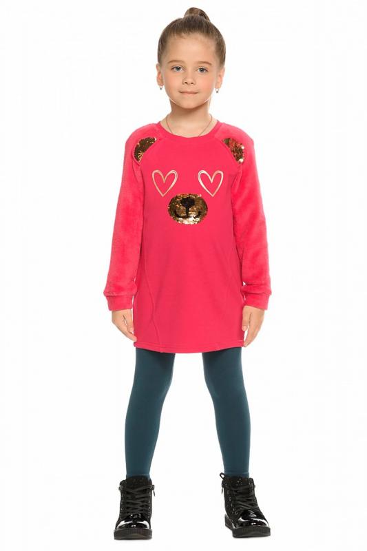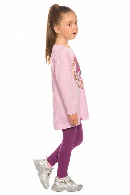 Комплект для девочек туника и лосины. Туника мягкого оверсайз силуэта со спущенной линией плеча. Перед и спинка из футера, рукава из мягкого плюшевого велюра с перламутровым отблеском. Эластичный rubber принт с золотым металликом и глиттером. Надпись Чудеса случаются. Вуаля. Низ Классические лосины из футера с начесом.