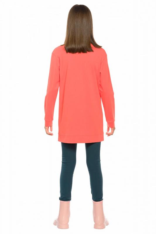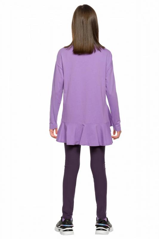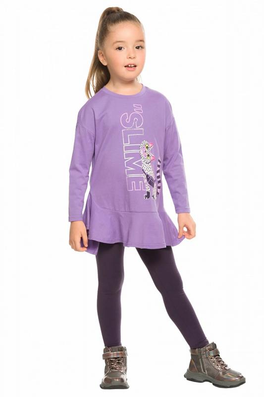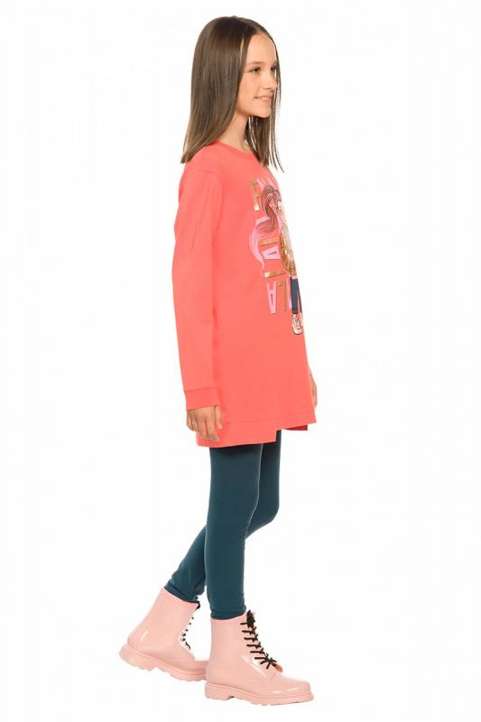 Комплект для девочек туника и лосины. Туника А силуэта с мягким спущенным плечом очень свободного силуэта. Асимметричный низ туники подчеркнут красивым воланом. Фольгированный голографический принт с неоном. Лосины из эластичного трикотажа.