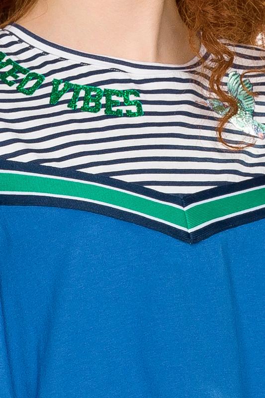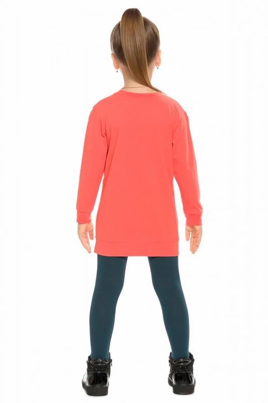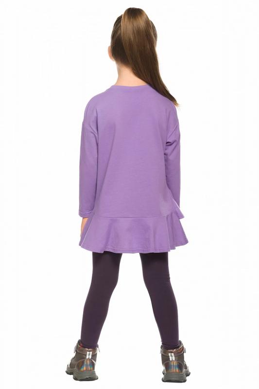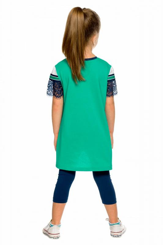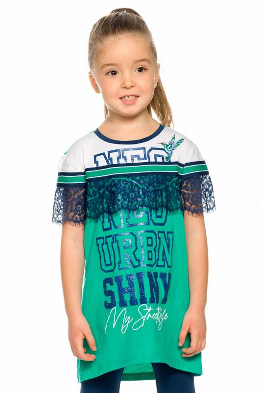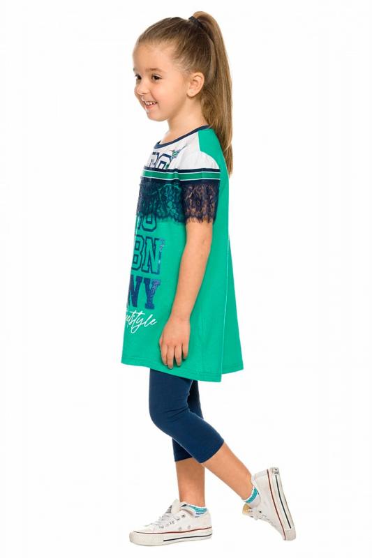 Комплект для девочек туника и лосины. Новая туника из тонкого хлопка, с перепадом длины спинки и переда, прямого свободного силуэта с мягкой линией плеча. По линии груди спереди и рукавах горизонтальное членение, вдоль которого проходит трикотажная декоративная тесьма и мягкое воздушное кружево. Принт с разноцветным глиттером в виде птички колибри и надписей. Перевод Нео, Урбан, Блестящий, Мой стритстайл. Классические укороченные лосины.