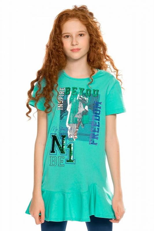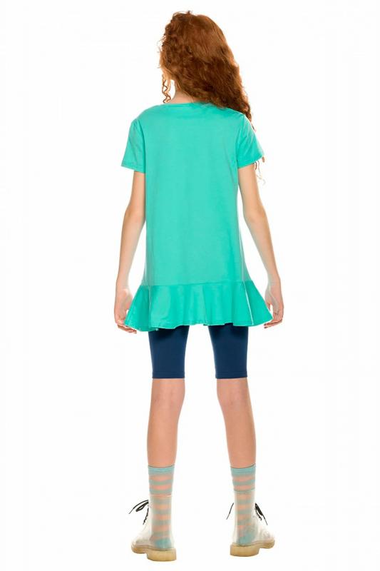 Комплект для девочек туника и лосины. Туника с фигурной линией низа и притачным воланом. Необычный способ втачивания волана по переду волан втачивается в разрез, создавая интересные фалды. Силуэт прямой, свободный, с мягкой линией плеча. Фотопринт с разноцветным глиттером и вышивкой переливающимися переворачивающимися пайетками. Перевод Вдохновляю быть свободной , Будь первой , Мой стритстайл . Велосипедки длиной до колена.