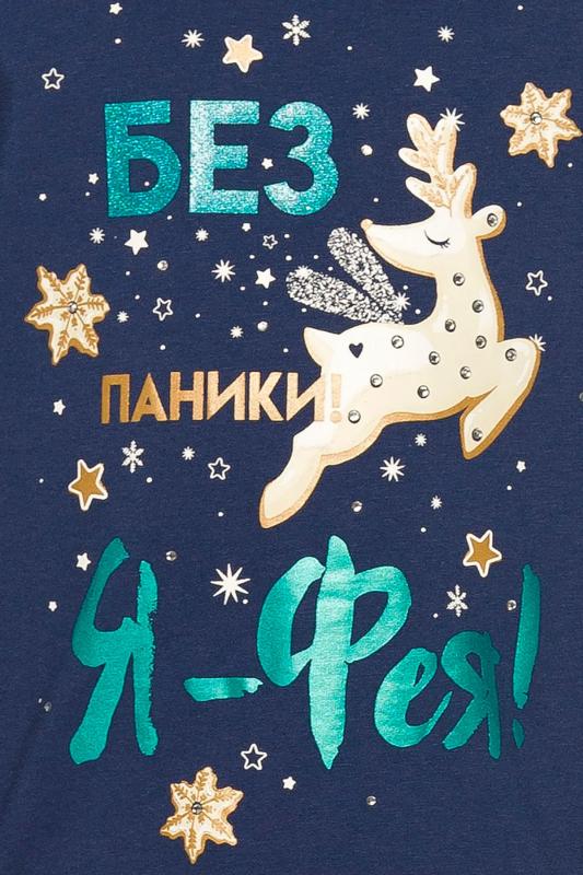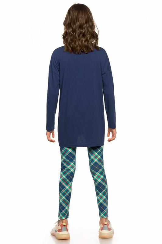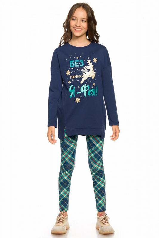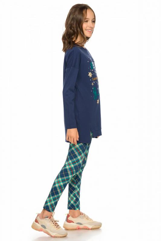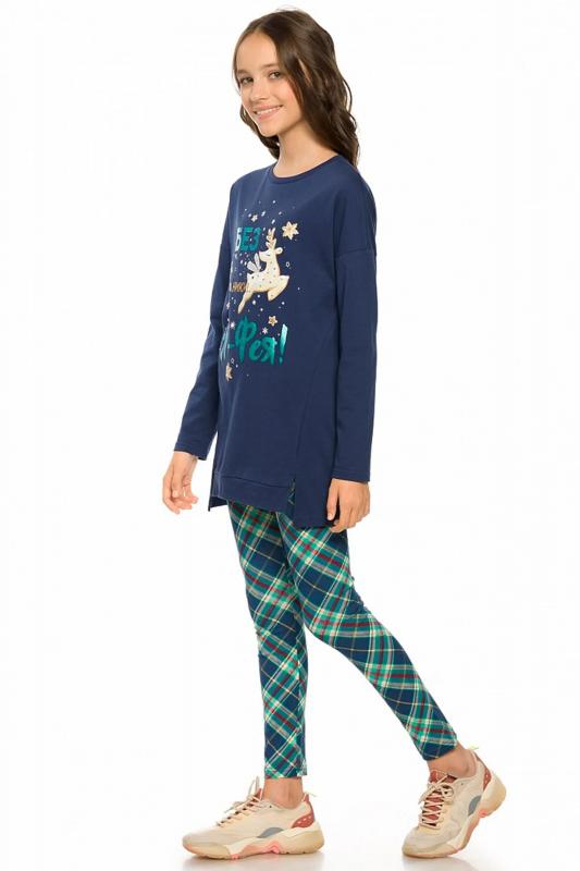Комплект для девочек. Туника О образного силуэта с перепадом длин между передом и спинкой, спущенное плечо, боковые швы переведены на перед, оканчиваются небольшими разрезами. Принт в виде пряничного оленя, с золотом, бирюзовым глиттером и металликом, стразами. Классические лосины в All over принт клетку.
