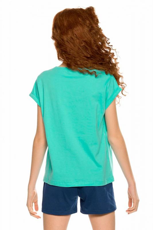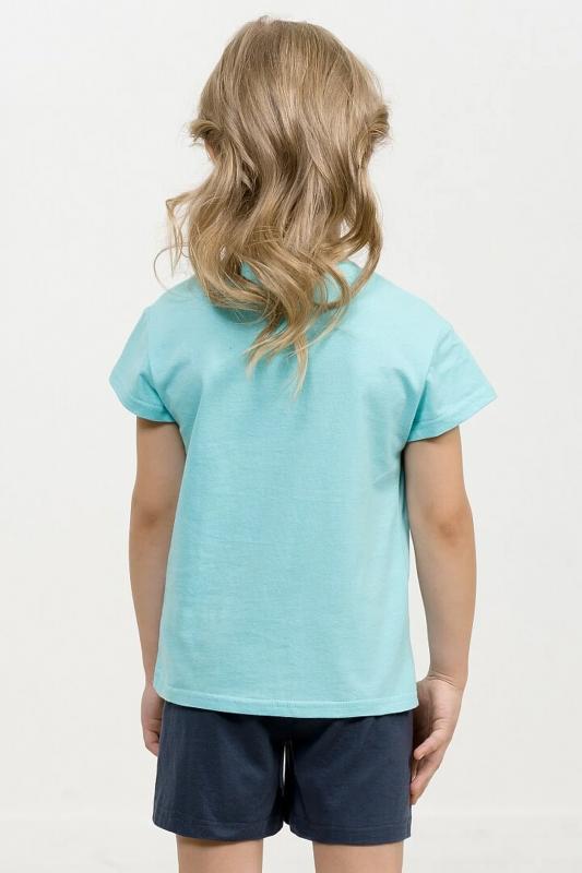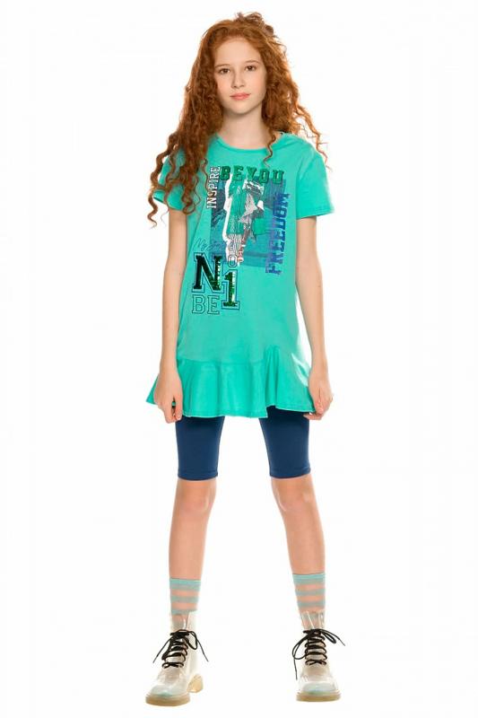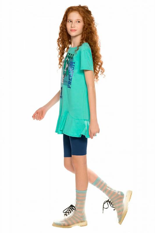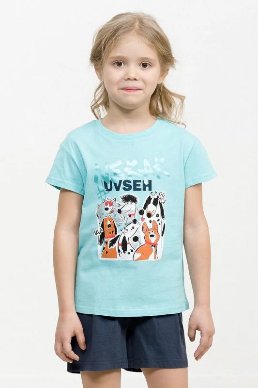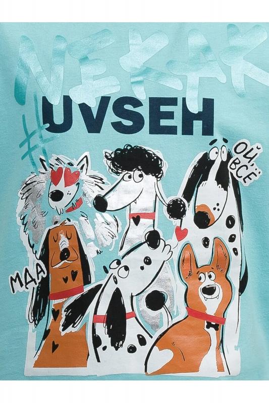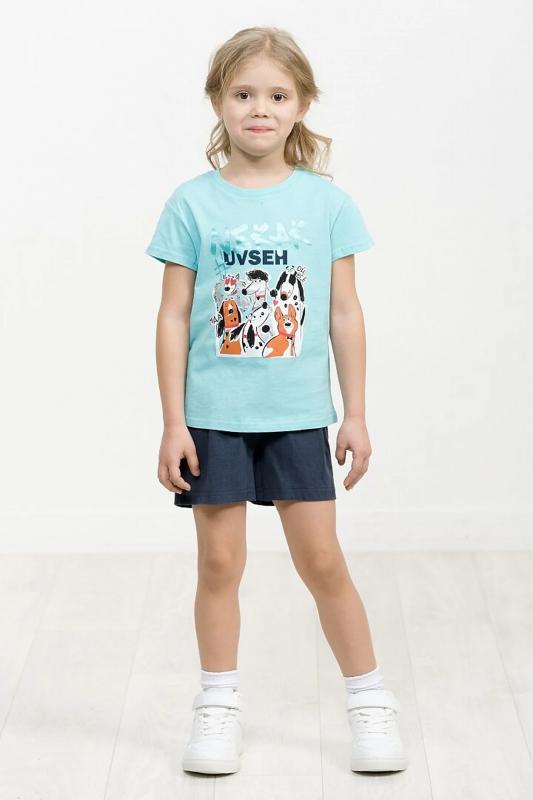 Комплект для девочек футболка и шорты. Футболка силуэта оверсайз. Rubber принт собаки стикерпак с обилием серебряного и бирюзового металликов. Шорты свободного силуэта с защипами спереди и регулировкой объема шнуром.
