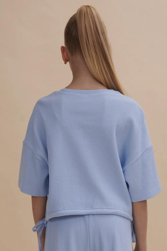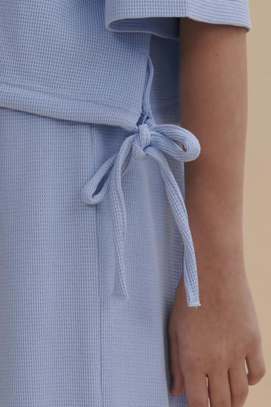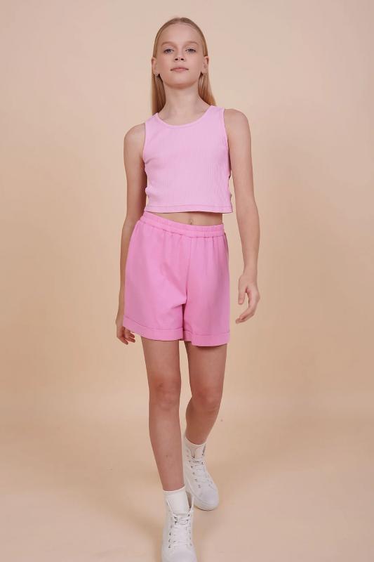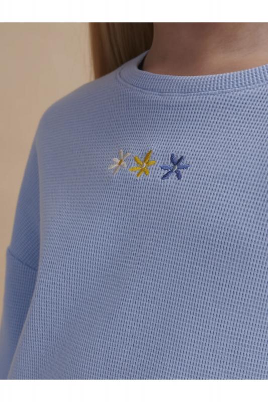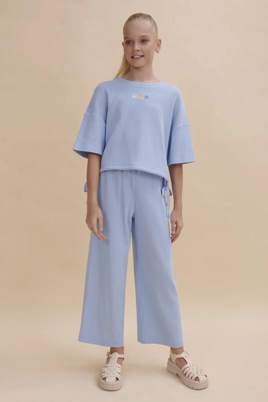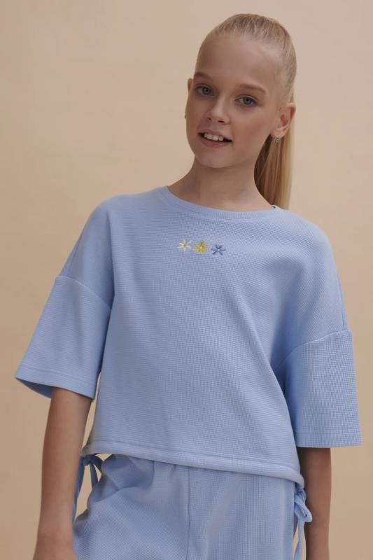 текстурой. В составе ткани преобладает хлопок, поэтому модель комфортная, приятная на ощупь, в ней не будет жарко летом. Эластан в составе ткани помогает изделию сохранять форму. Ткань проста в уходе. Изюминка топа — лаконичная вышивка в виде трёх цветков. Комплект идеально сядет на девочку любой фигуры, можно покупать без примерки. Костюм для настоящих модниц, в нем каждая девочка будет выглядеть стильно и эффектно. Модель п